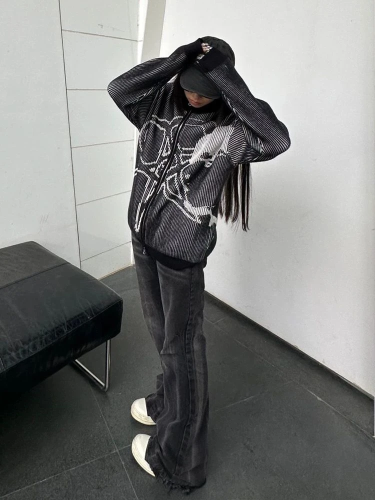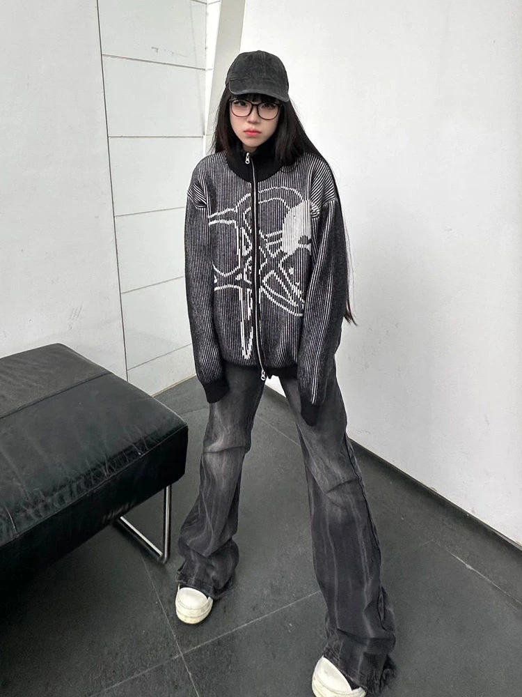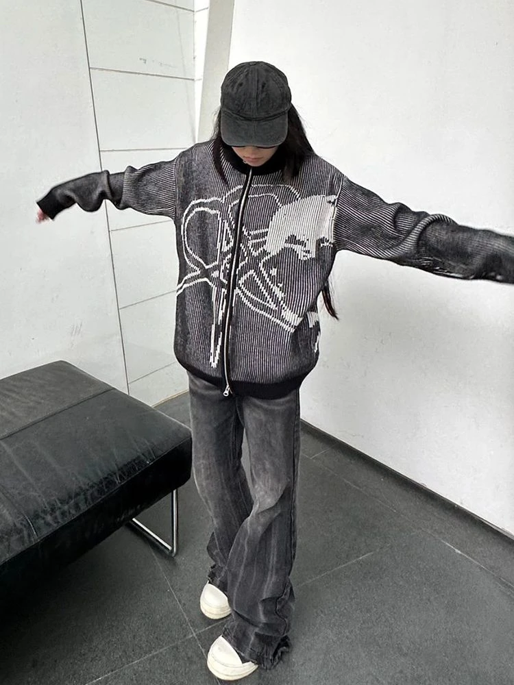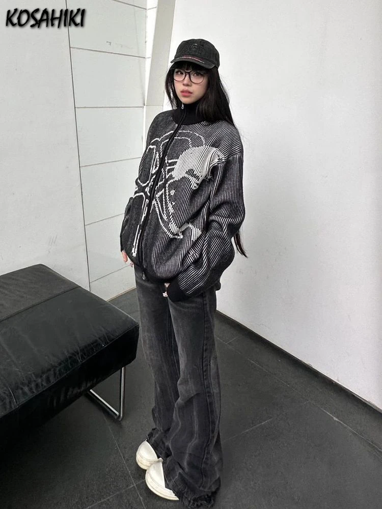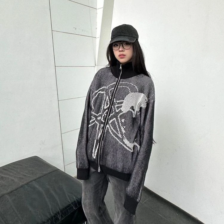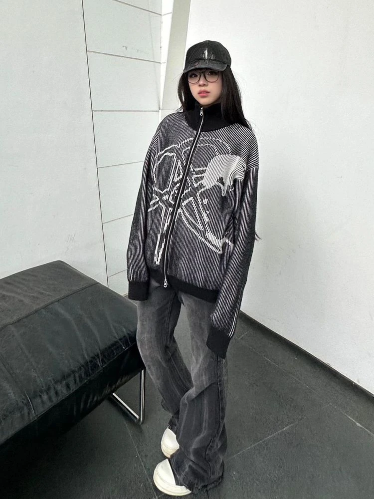 2025 Vintage Star Jacquard Y2k Aesthetic Jacket Women Men Double Zipper Casual Jackets Oversized Harajuku Stand Neck Grunge Coat