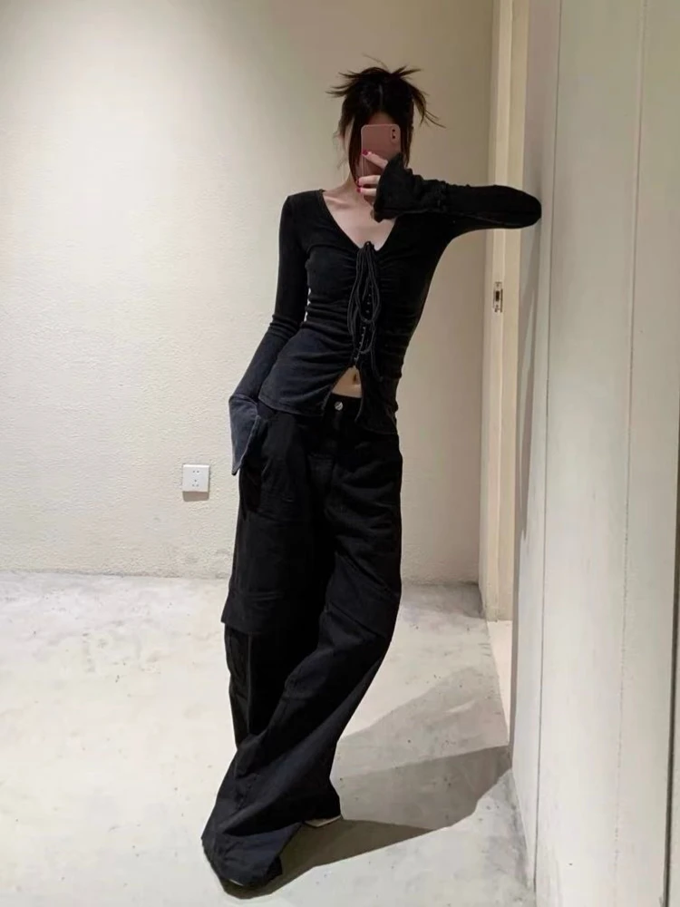 Autumn Black Sexy Halter Streetwear Tees Single Breasted Pleated Harajuku Slim Tops Grunge Split Women T-shirts Y2k Aesthetic
