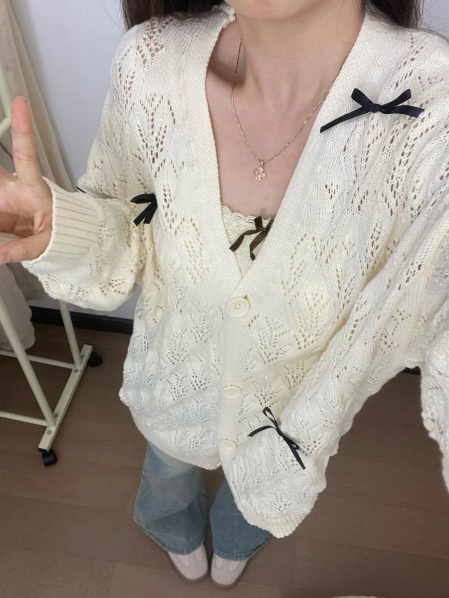 Autumn Grunge Sweet Bow Knitted Cardigans Y2k Aesthetic Hollow Out Oversized Coats Single Breasted Women Kawaii Sweaters Tops