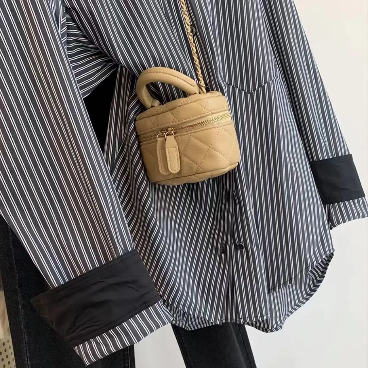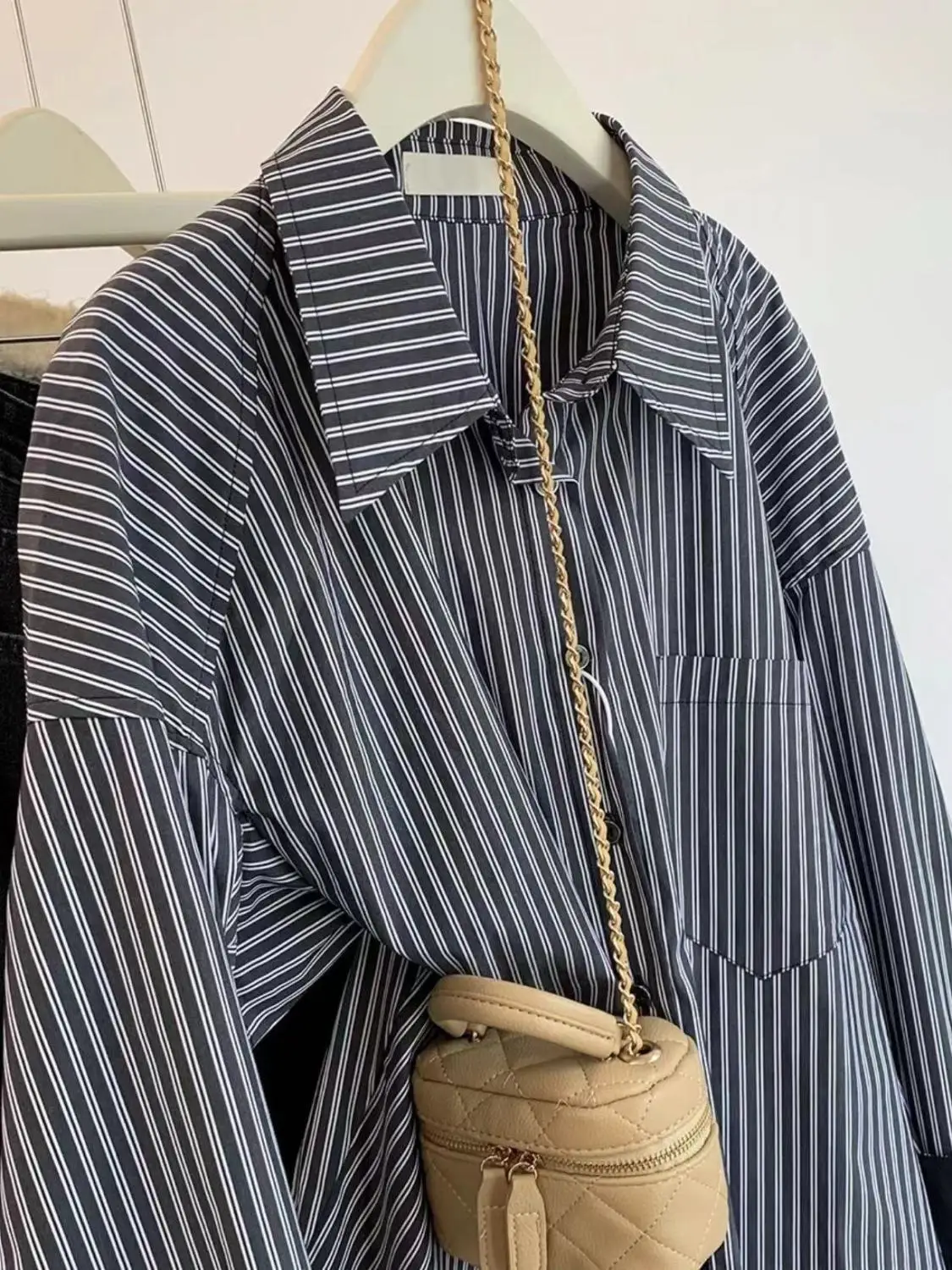 Autumn Vintage Gray Striped Patchwork Single Breasted Shirt Women Casual Loose Long Sleeve Fashion Blouses Tops Streetwear Trend