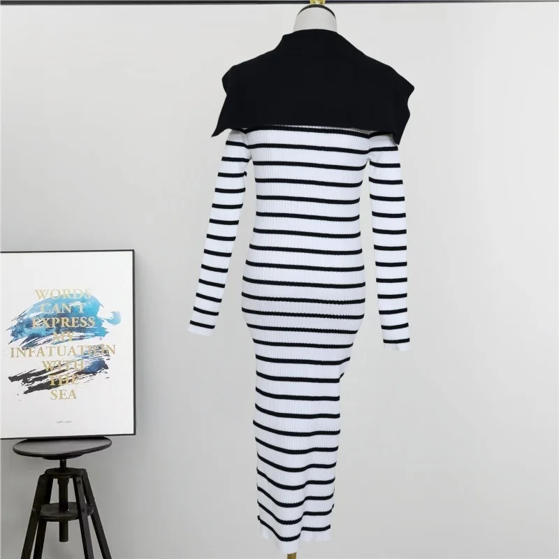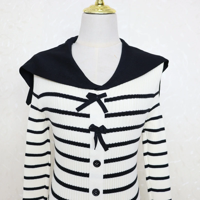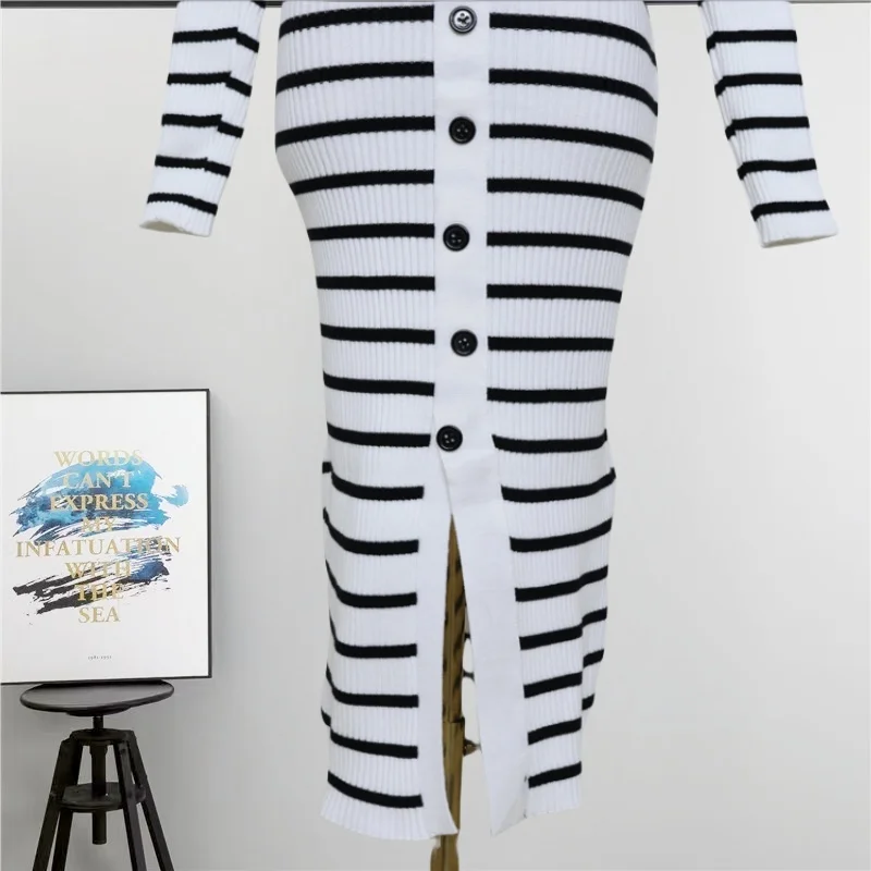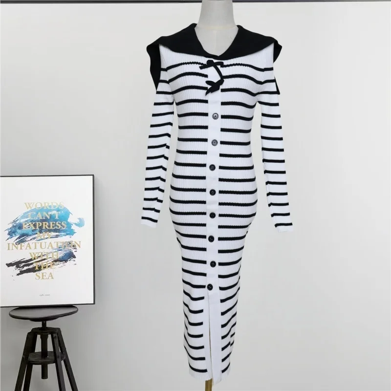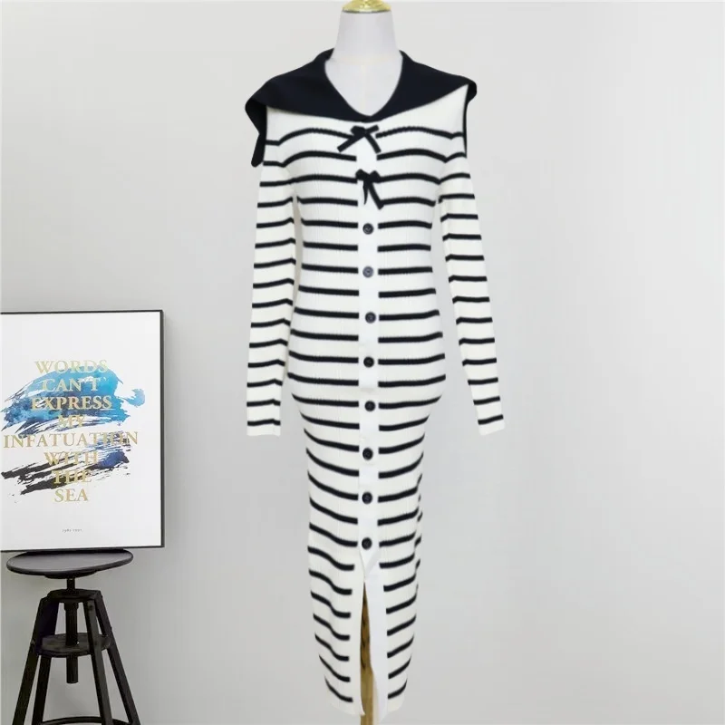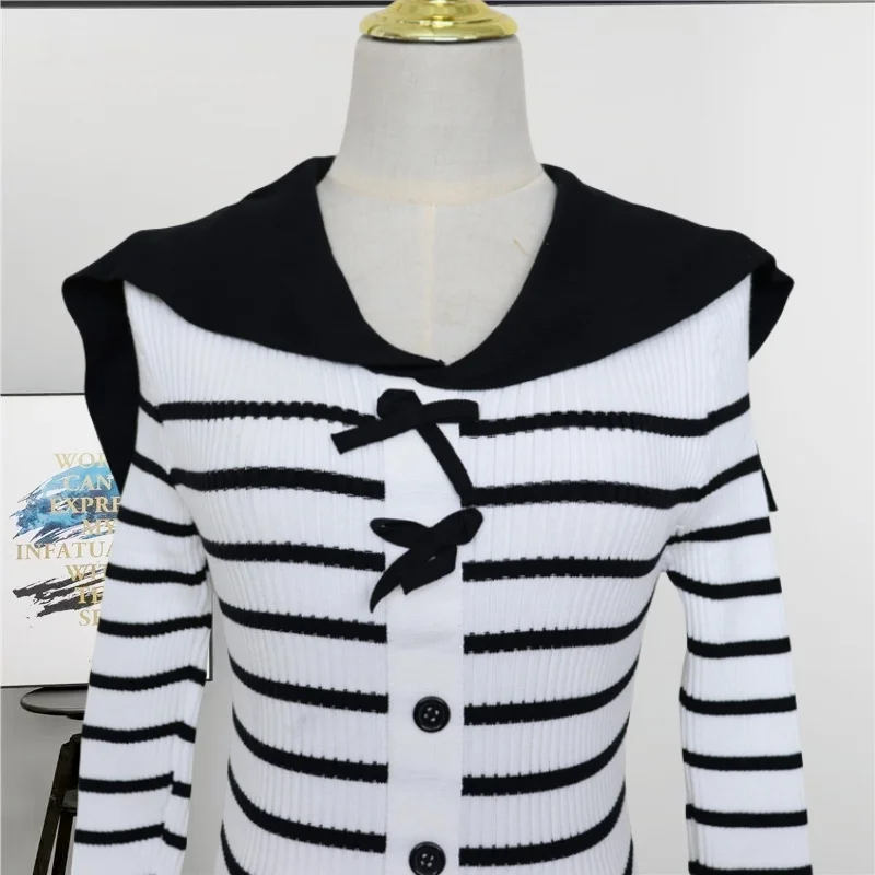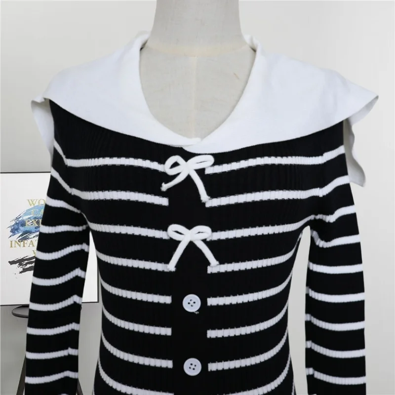 Autumn Winter Vintage Black White Striped Elegant Long Sleeve Dress Women French Single Breasted Office Bow Split Knitted Dress