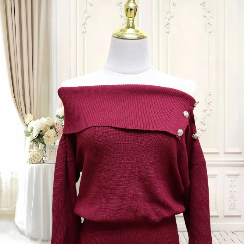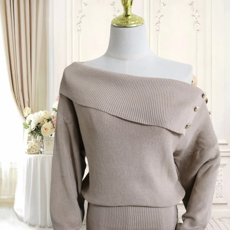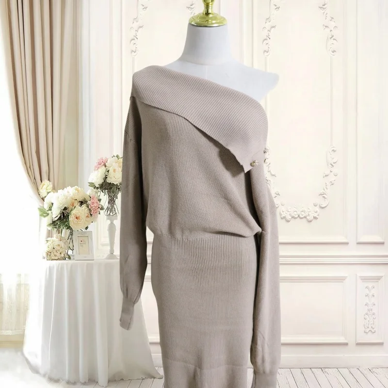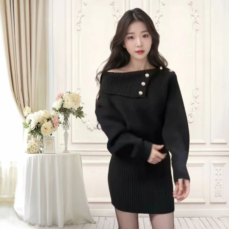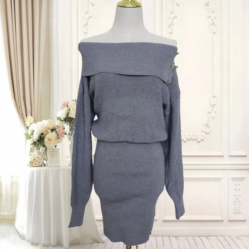 Autumn Winter Vintage Solid Elegant Off Shoulder Long Sleeve Mini Dress Women French High Waist Button Knitted Mini Dress Simple