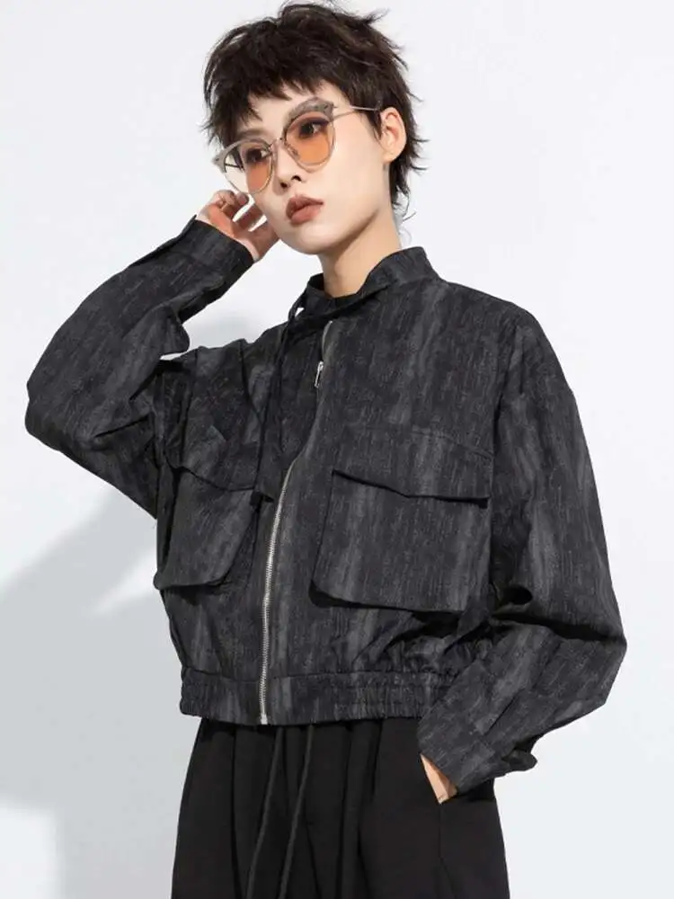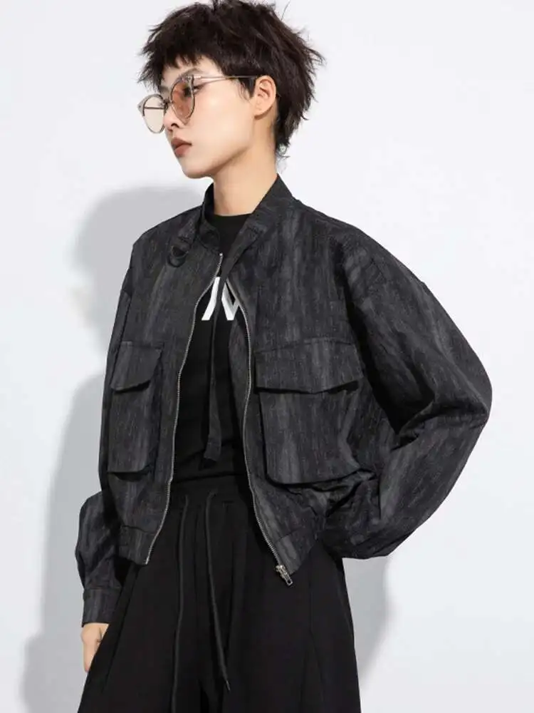 Black Big Size Pocket Short Casual Jacket New Stand Collar Long Sleeve Women Coat Fashion Tide Spring Autumn 2025 1DH8223