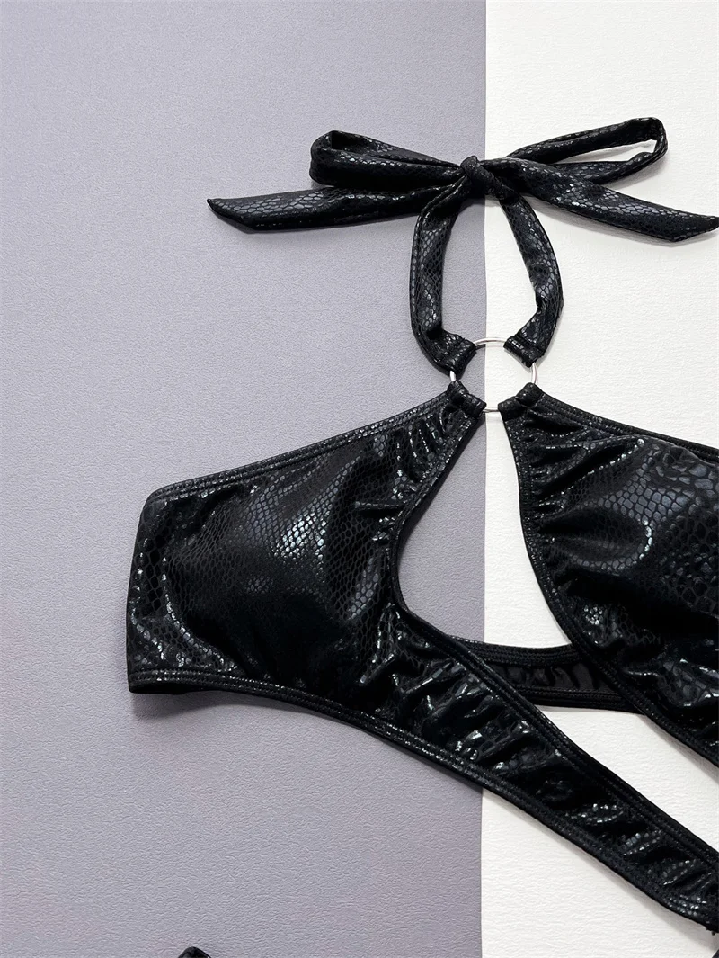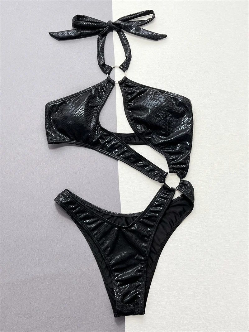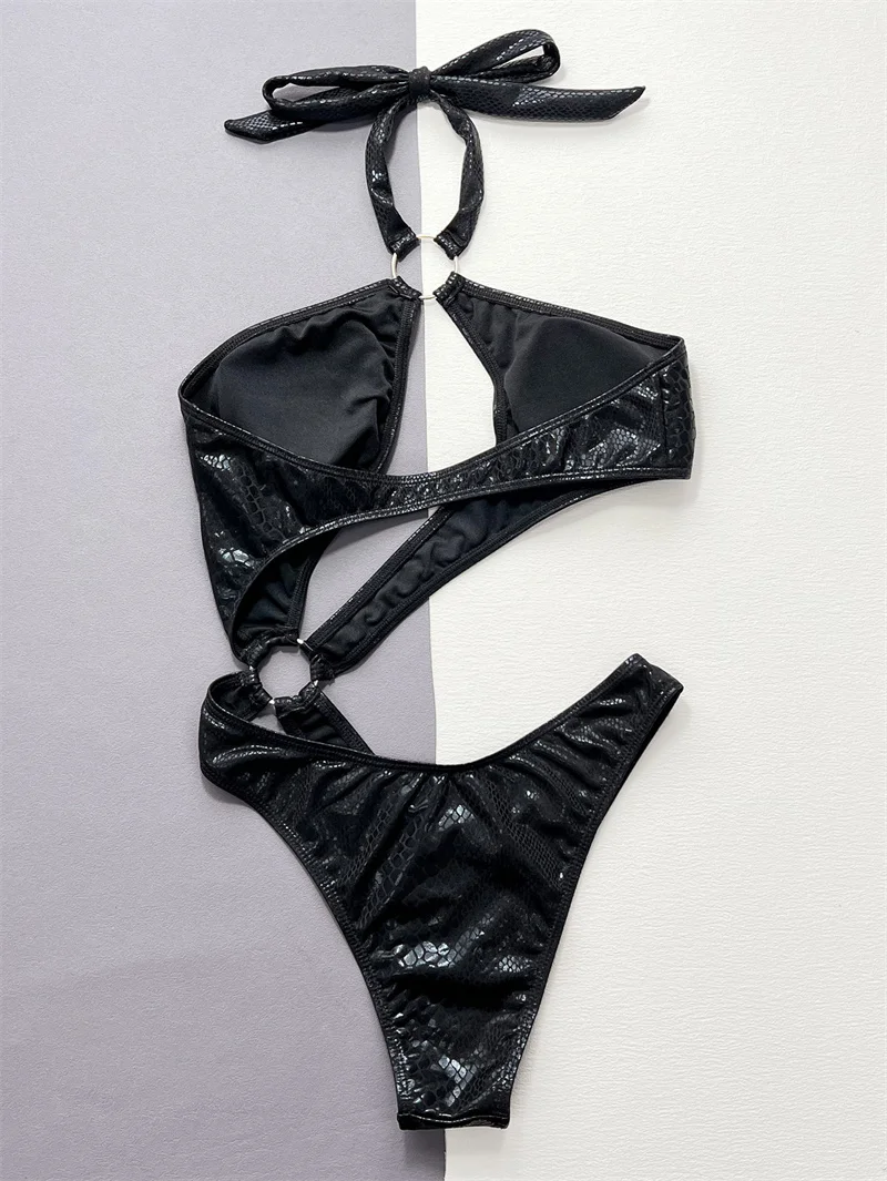 Black Snake Halter One Piece Swimsuit 2024 Swimwear for Women Sexy High Cut Bathing Suit Hollow Out Monokini