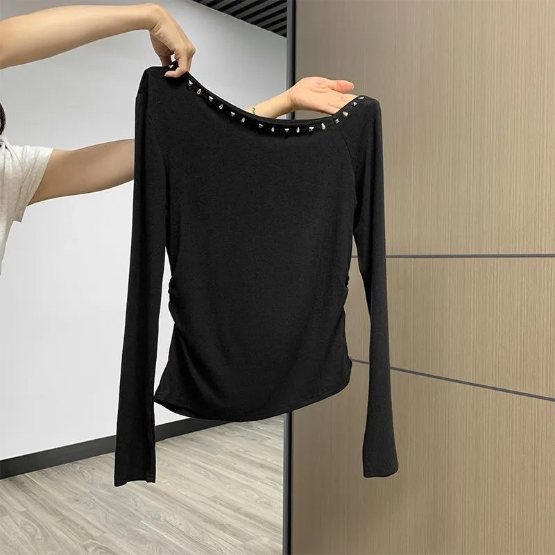 Black T Shirt Women Clothing Off Shoulder Tunic Rivet Slash Neck Tshirts Y2k Tops 2024 Ropa Mujer Korean Tees Chic Sexy T-shirts