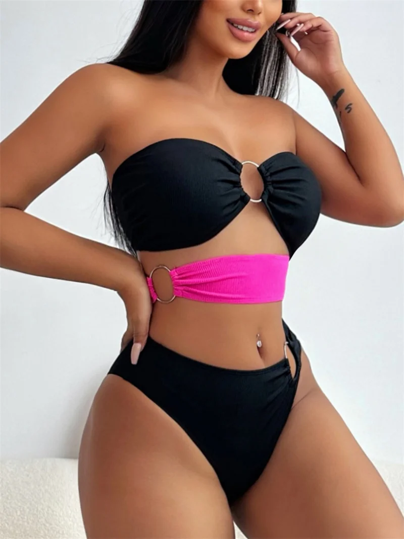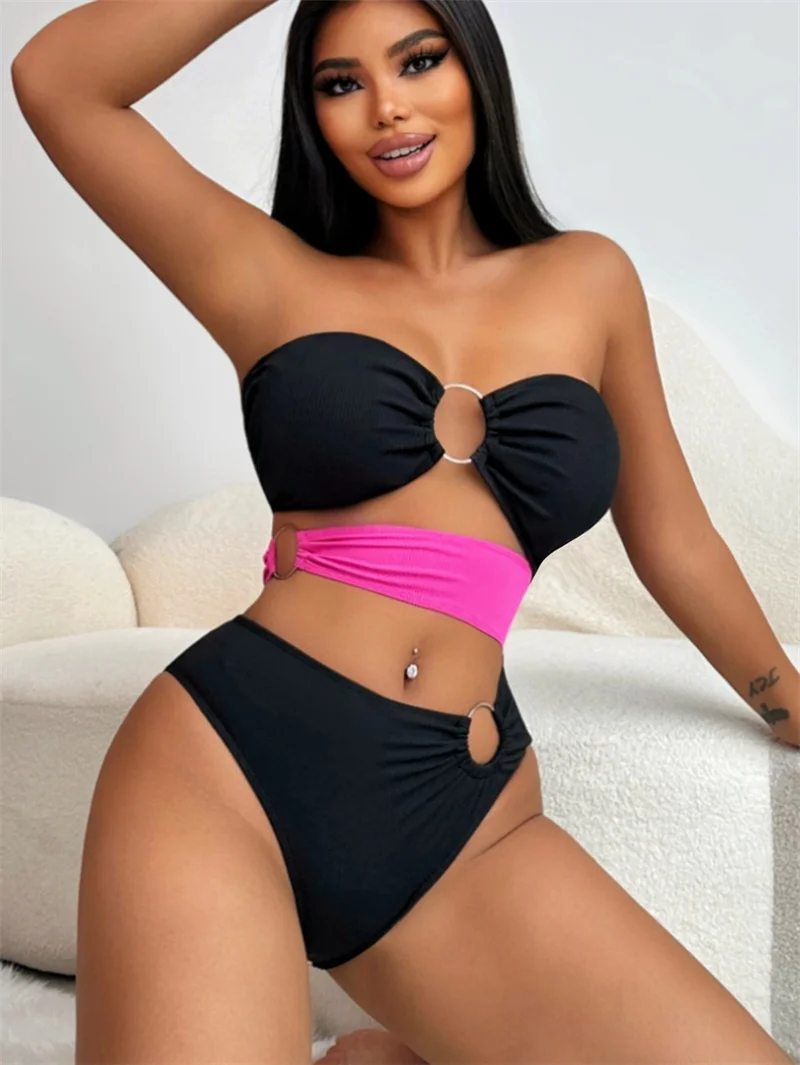 Block Color Cut Out Bandeau Metal Rings Women Swimwear One Piece Swimsuit 2024 Bathing Suit High Waist Monokini
