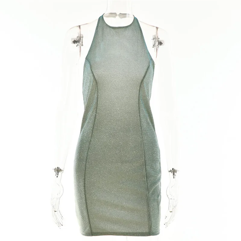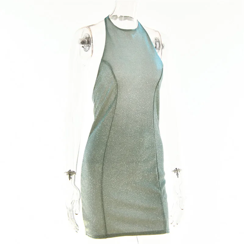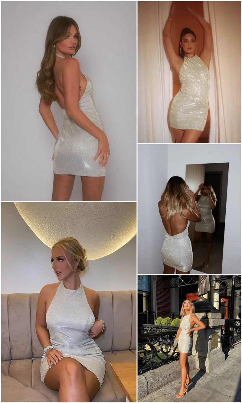 Bright Silk Shiny Halter Women Dress Silver Sexy Backless Evening Mini Dress Femme Autumn Skinny Party Clubwear Vestidos