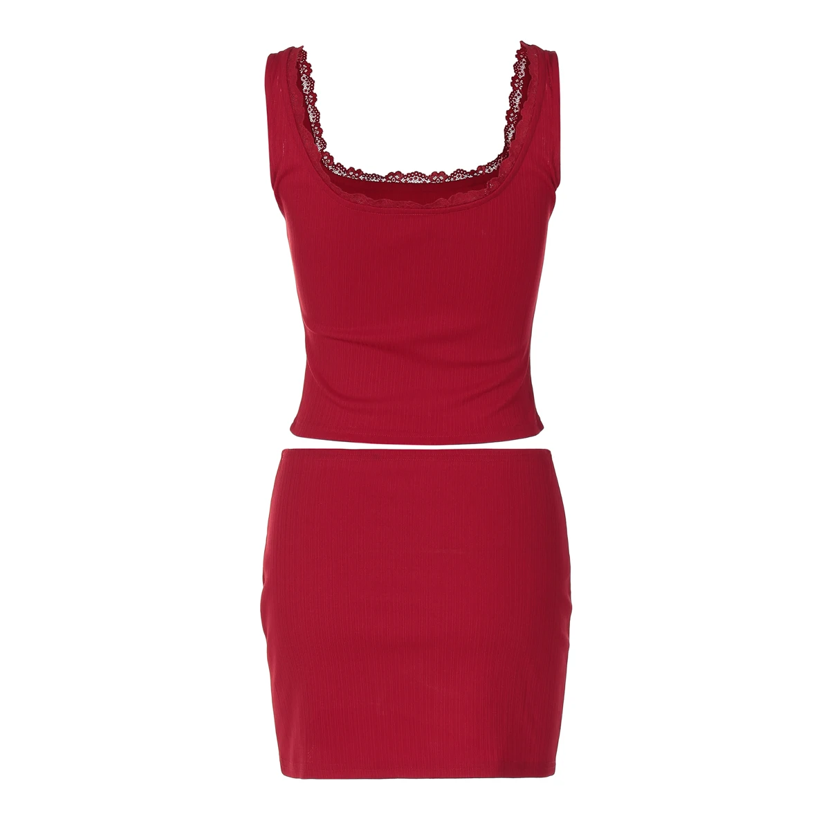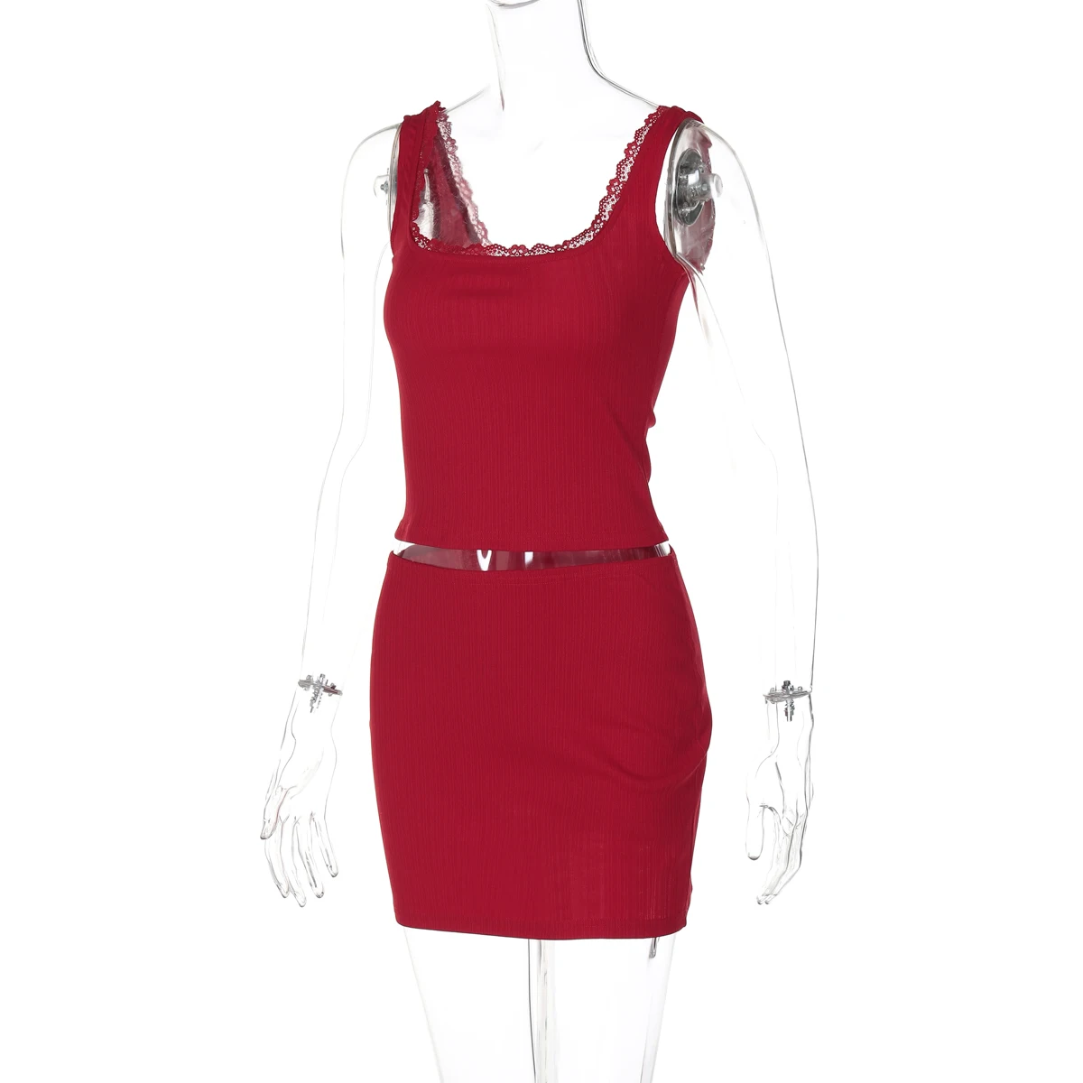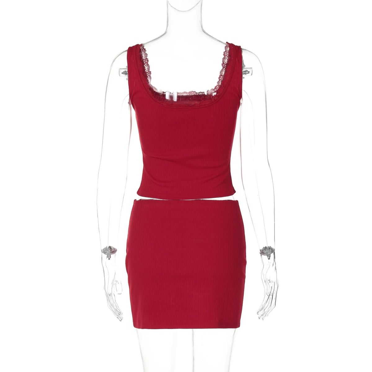 Casual 2 Pcs Sets Ribbed Solid Patchwork Lace Sexy Crop Tank Top Skirt Summer Women Y2K Outfits Party Festival