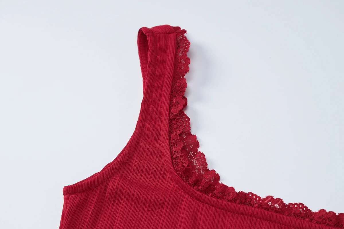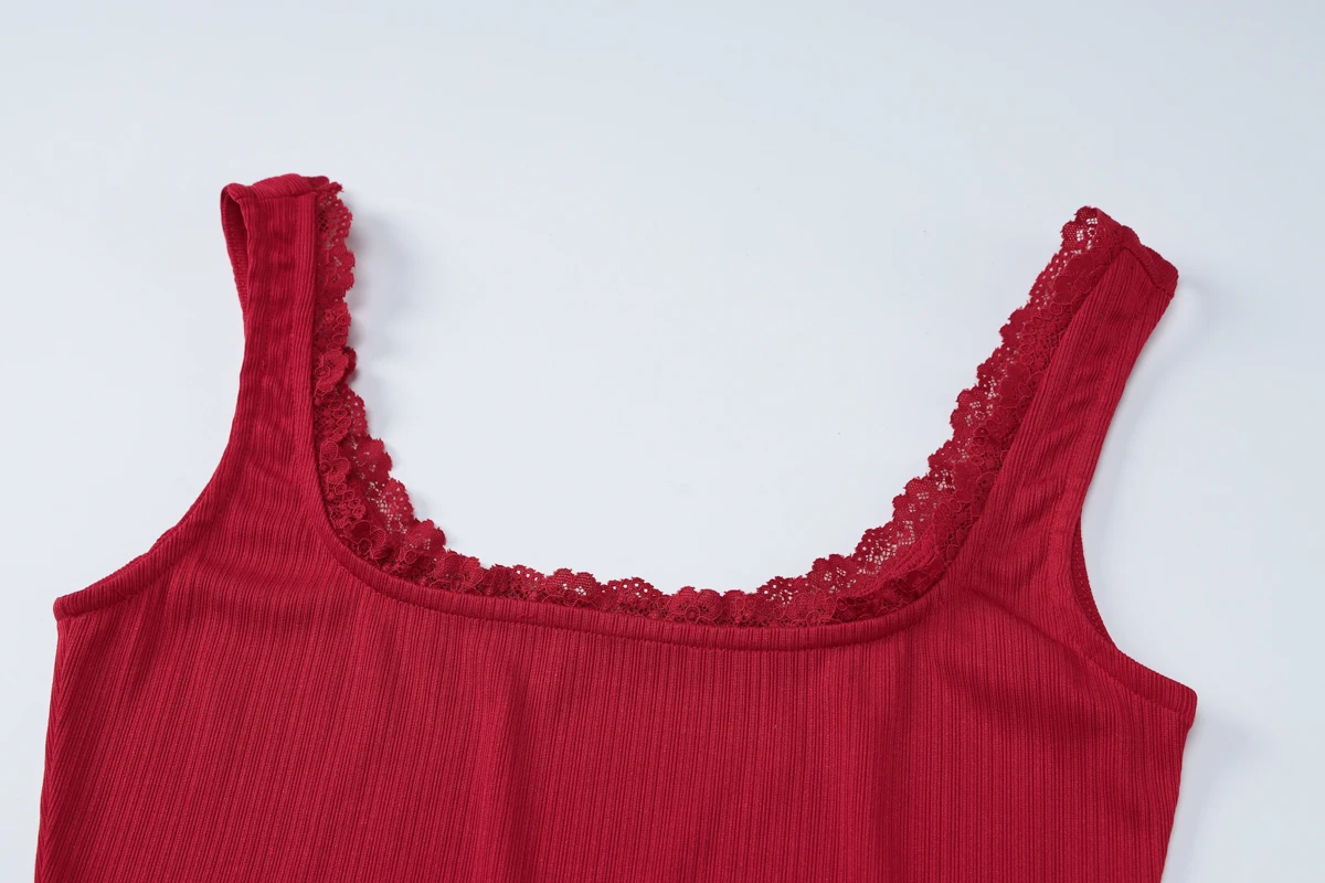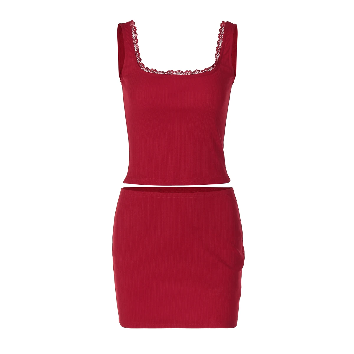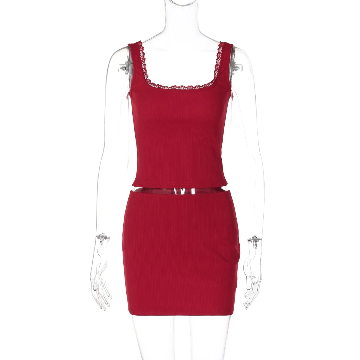 Casual 2 Pcs Sets Ribbed Solid Patchwork Lace Sexy Crop Tank Top Skirt Summer Women Y2K Outfits Party Festival