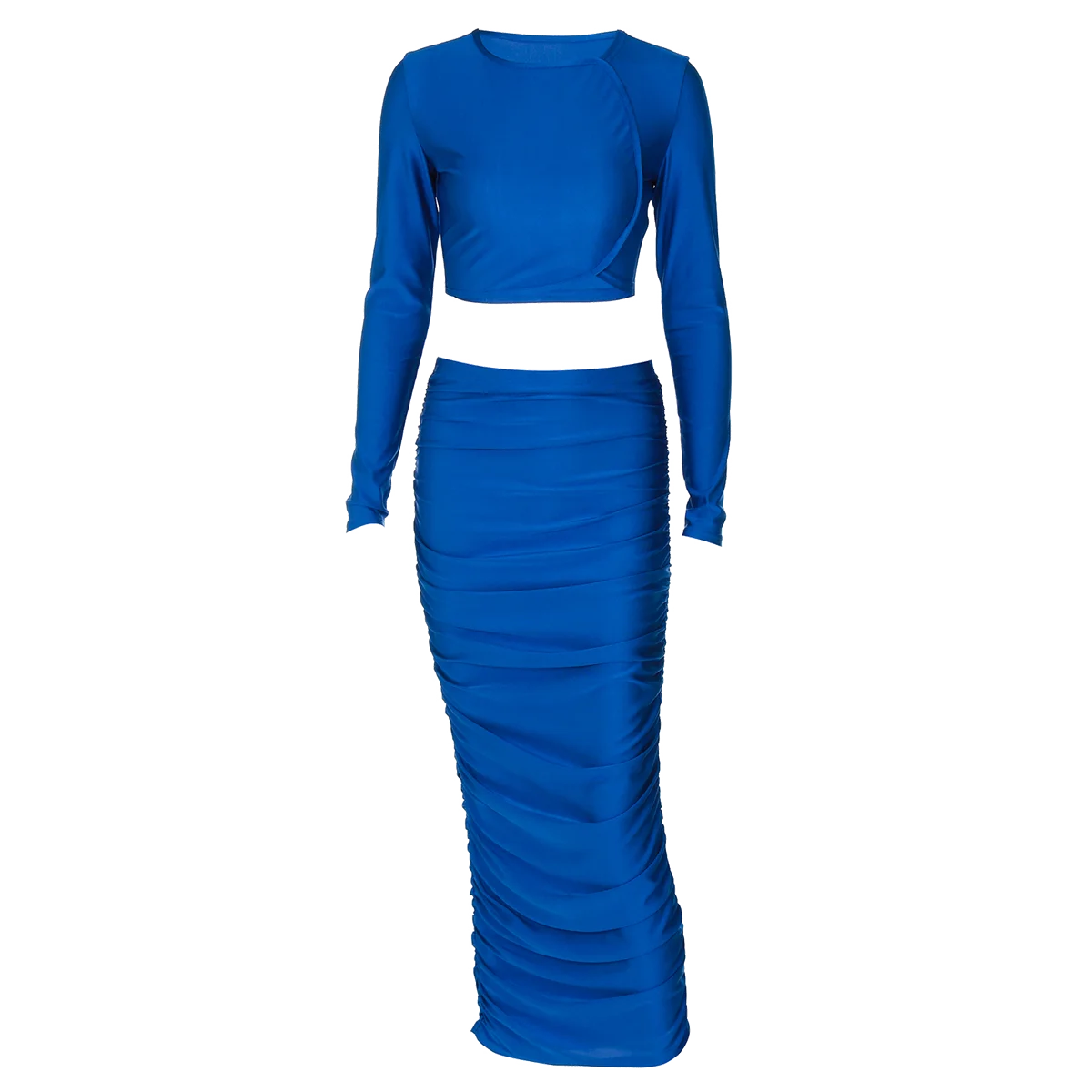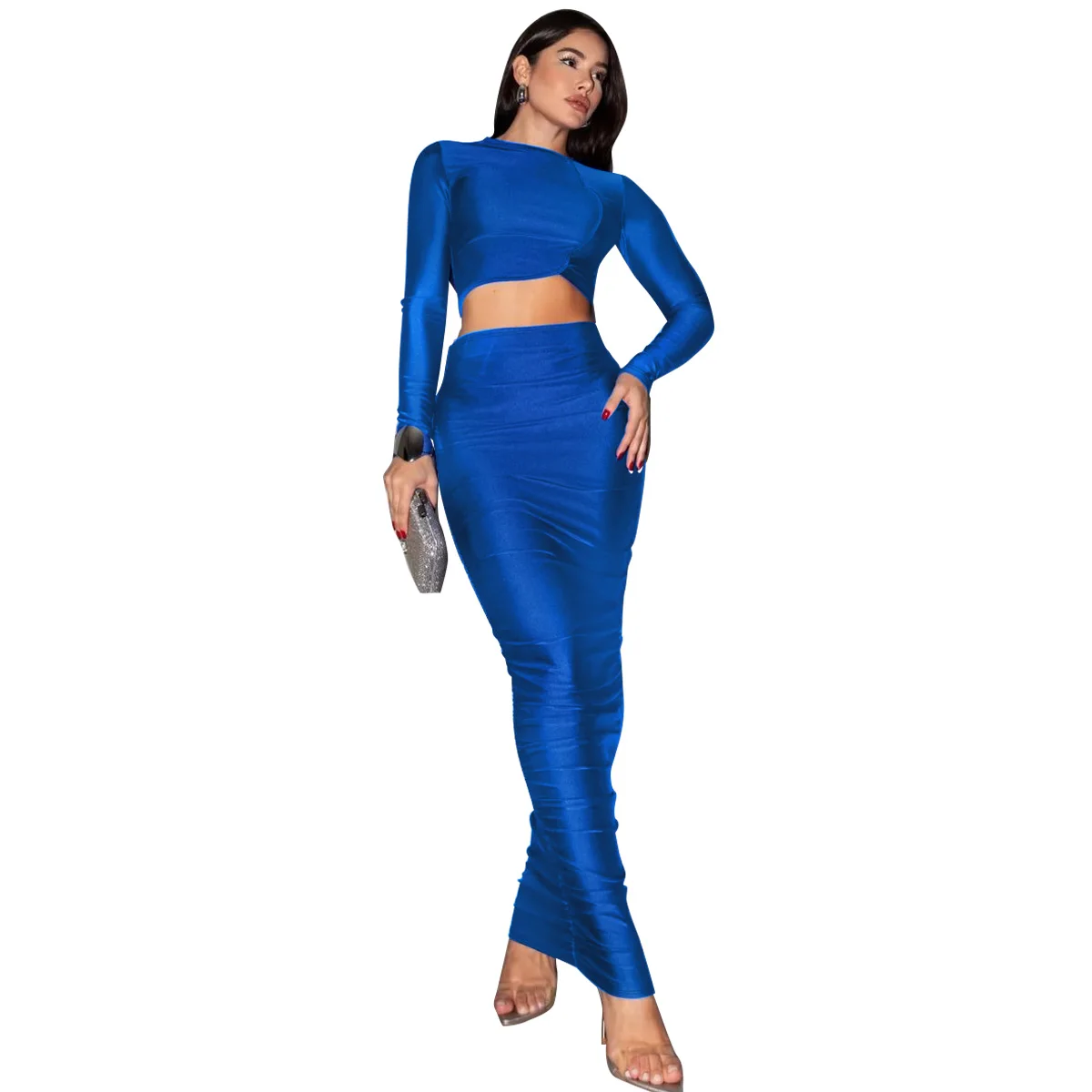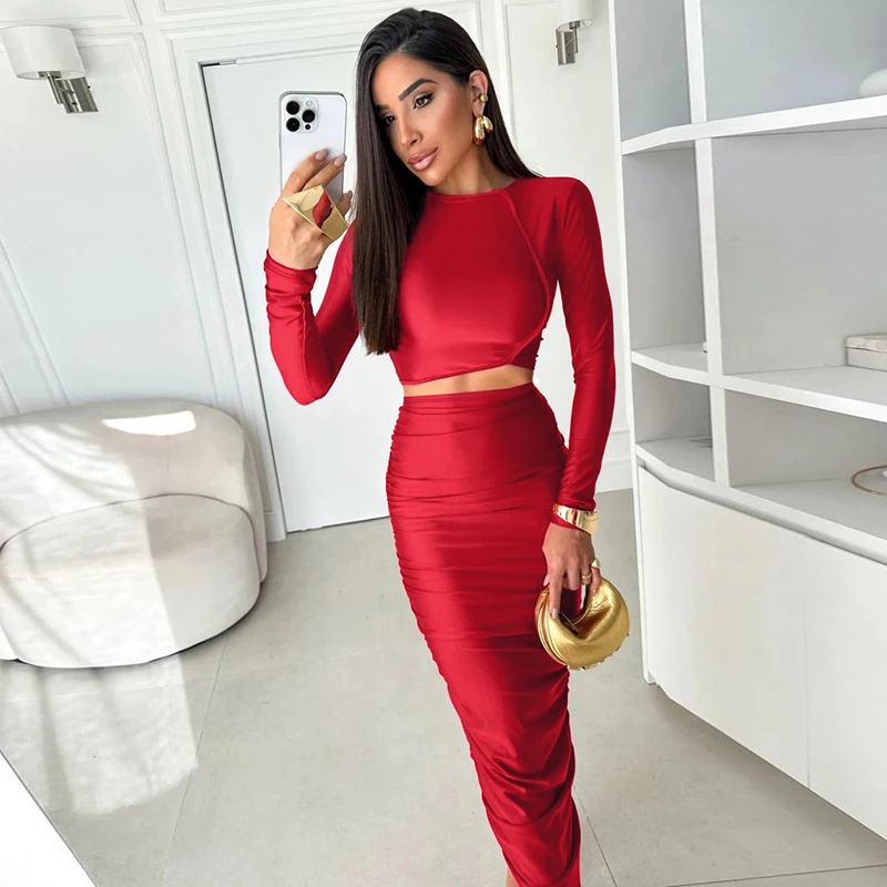 Casual 2 Pcs Sets Solid Long Sleeve Bright Line Sexy Crop T-Shirt Ruched Midi Skirt Women Y2K Clothes Party Vacation