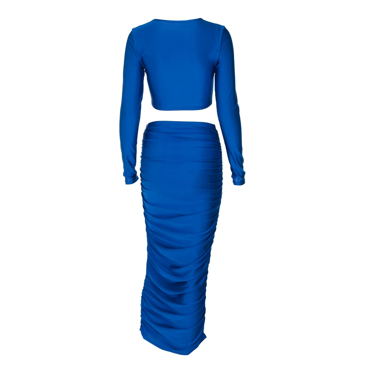 Load image into Gallery viewer, Casual 2 Pcs Sets Solid Long Sleeve Bright Line Sexy Crop T-Shirt Ruched Midi Skirt Women Y2K Clothes Party Vacation
