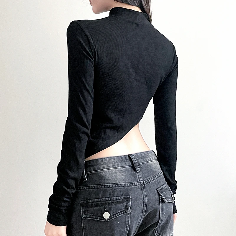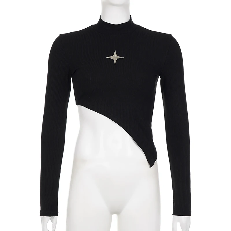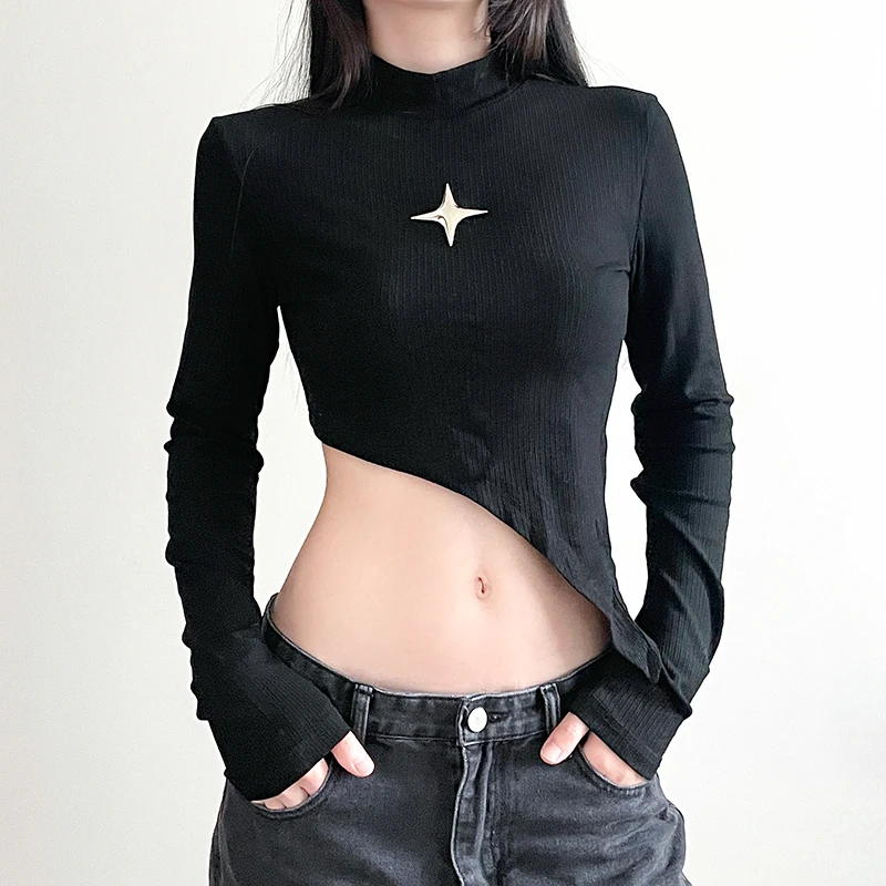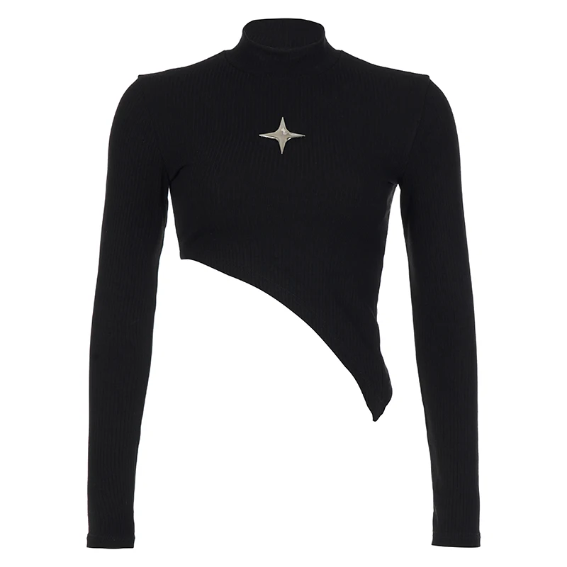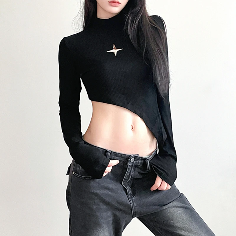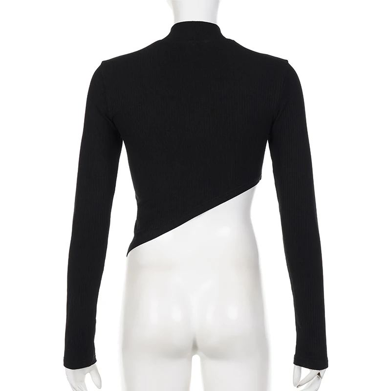 Casual Black Cotton Slim Women T-shirt Top Asymmetrical Long Sleeve Korean Tee Shirts Metal Basic Spring Autumn Shirt