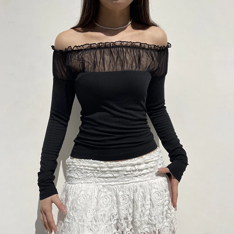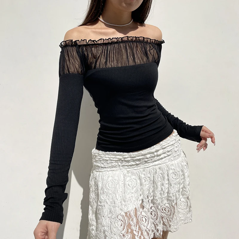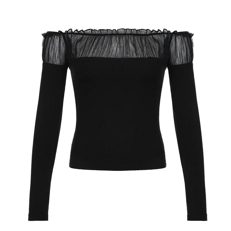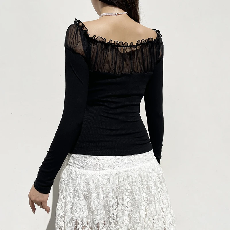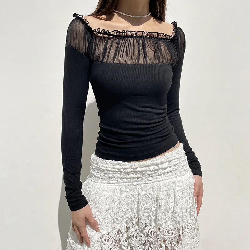 Chic Ruched Black Knit Autumn Tee Shirt Basic Korean Fashion Mesh Patched Fold Women's T-shirts Clothing Party Gothic