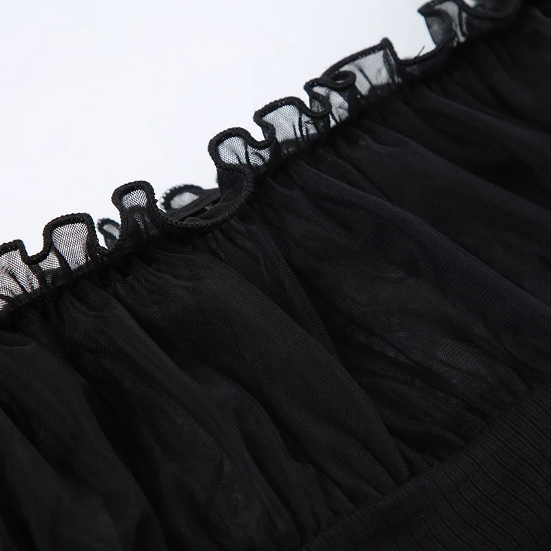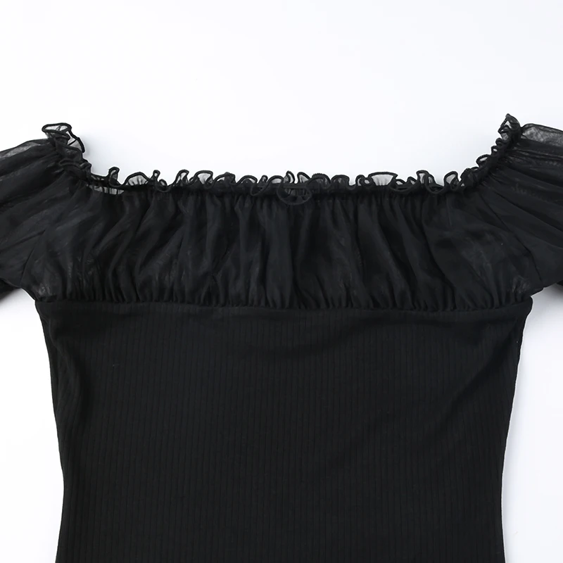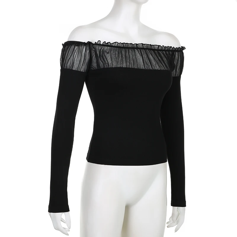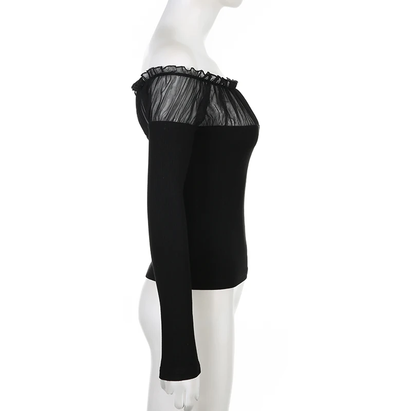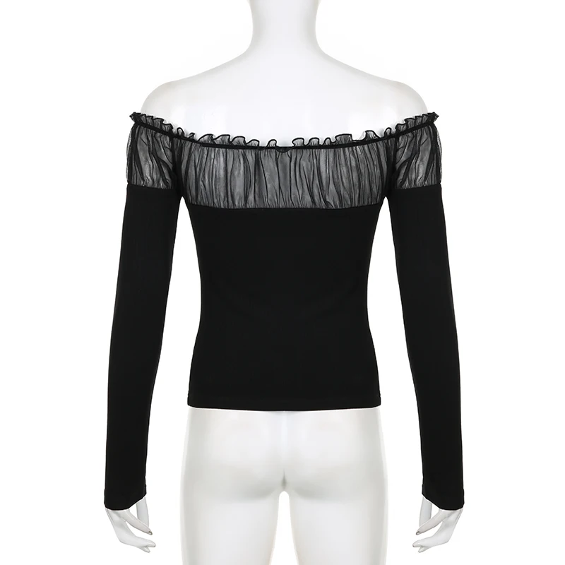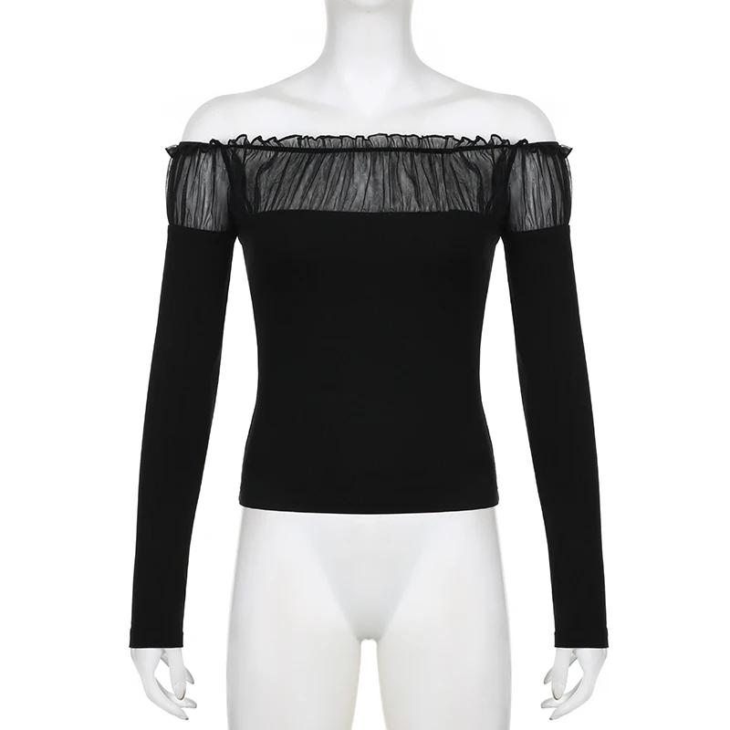 Chic Ruched Black Knit Autumn Tee Shirt Basic Korean Fashion Mesh Patched Fold Women's T-shirts Clothing Party Gothic