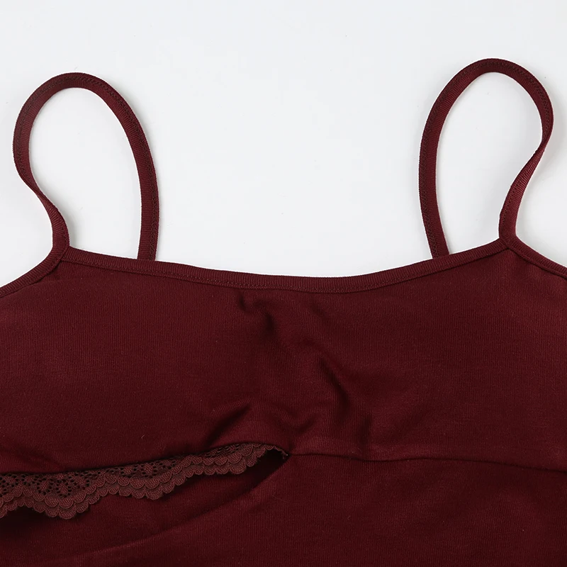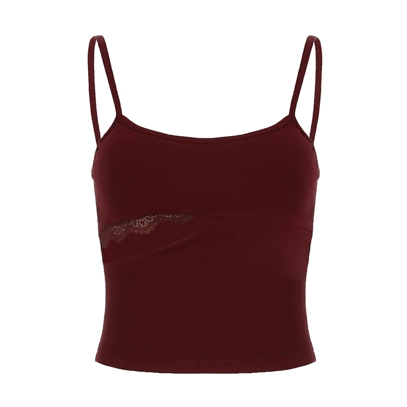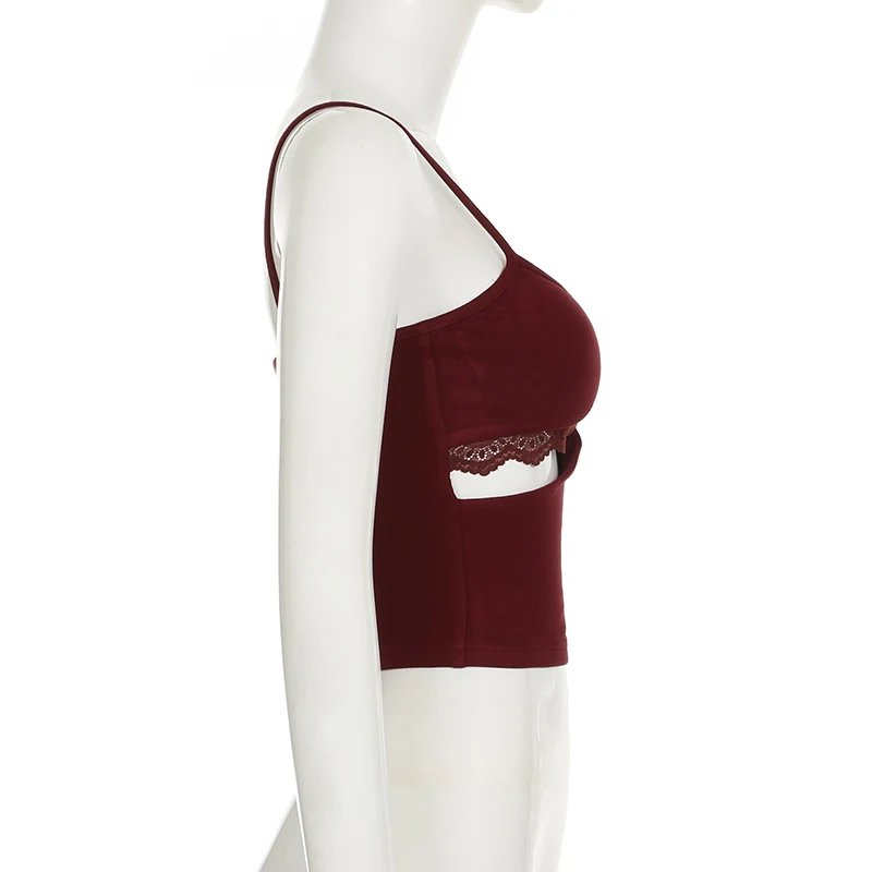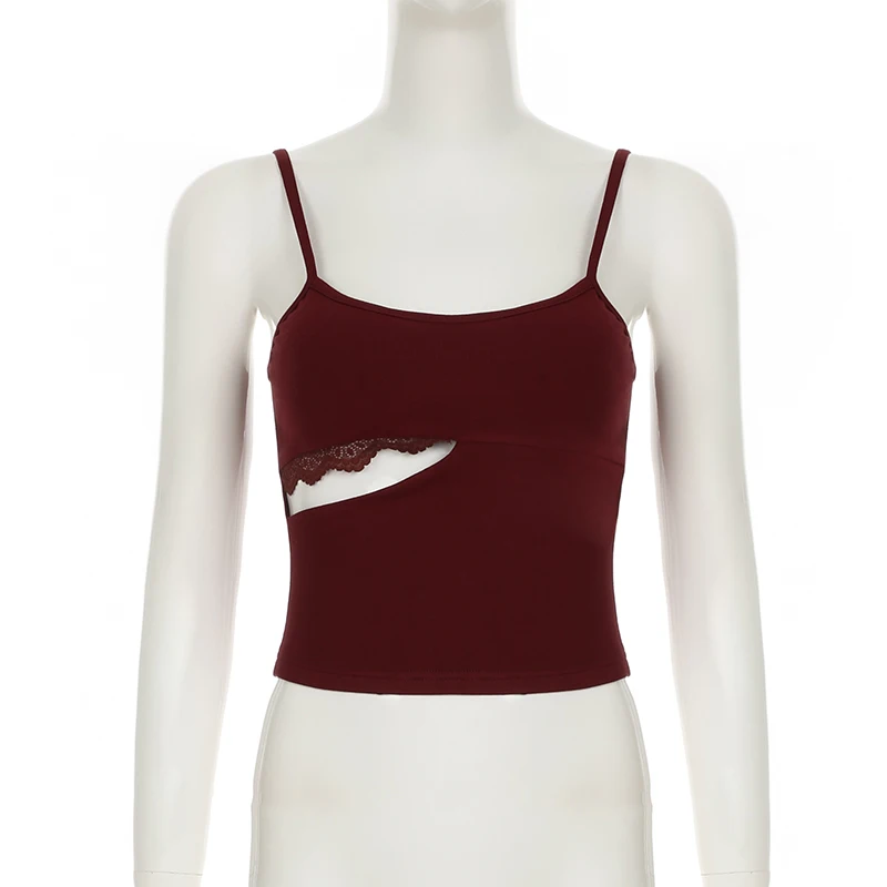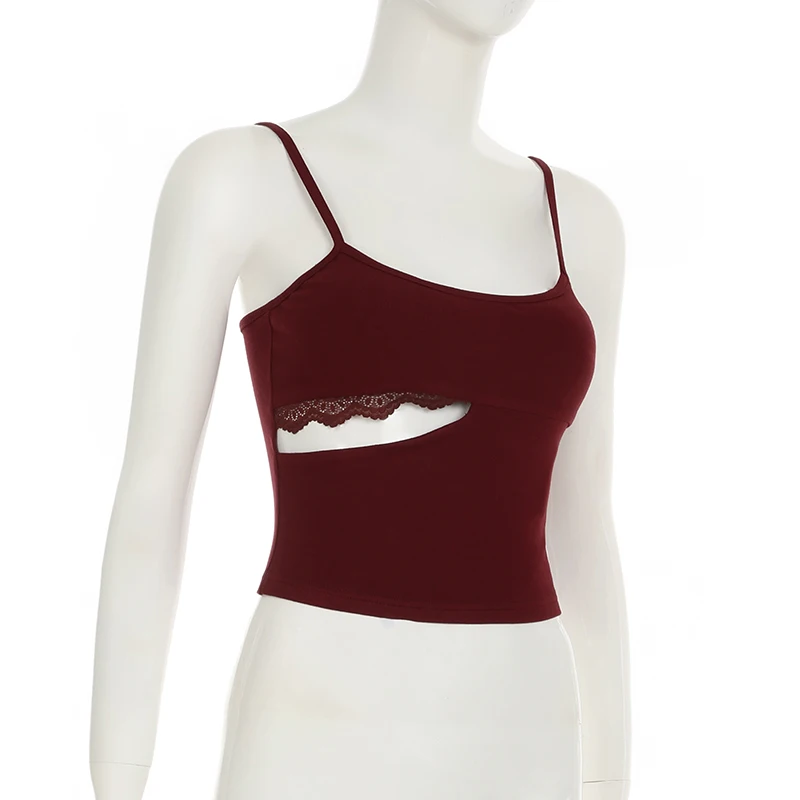 Chic Side Hollow Lace Patchwork Camis Women Hottie Summer Mini Skinny Cropped Tops Fashion Solid Spaghetti Strap Y2K