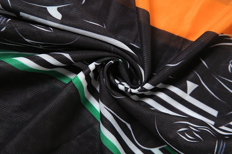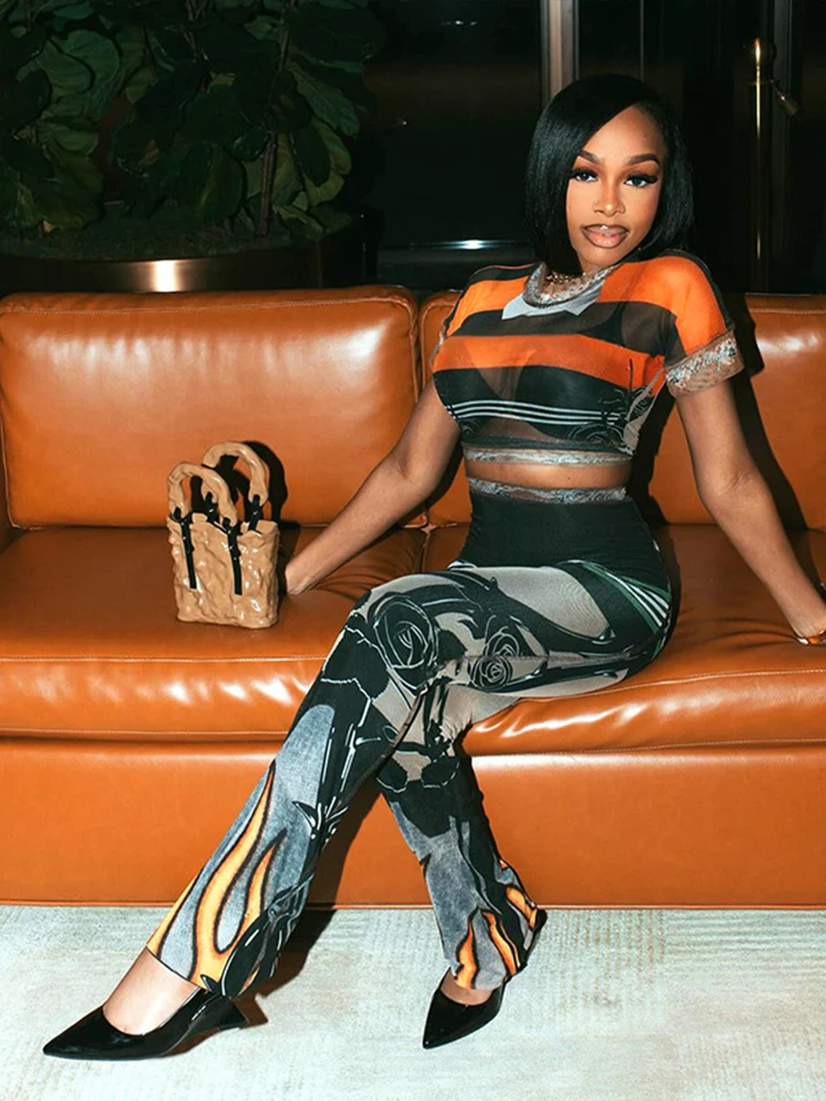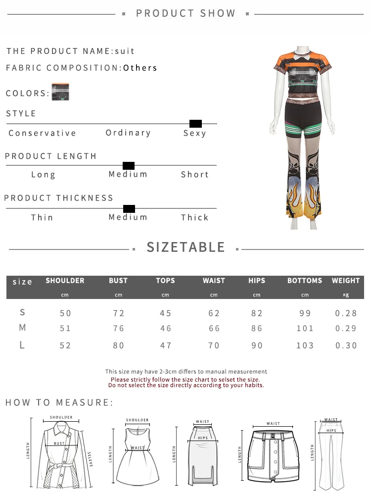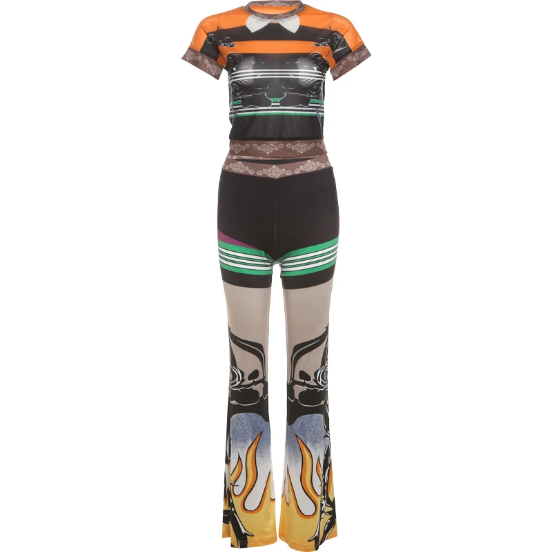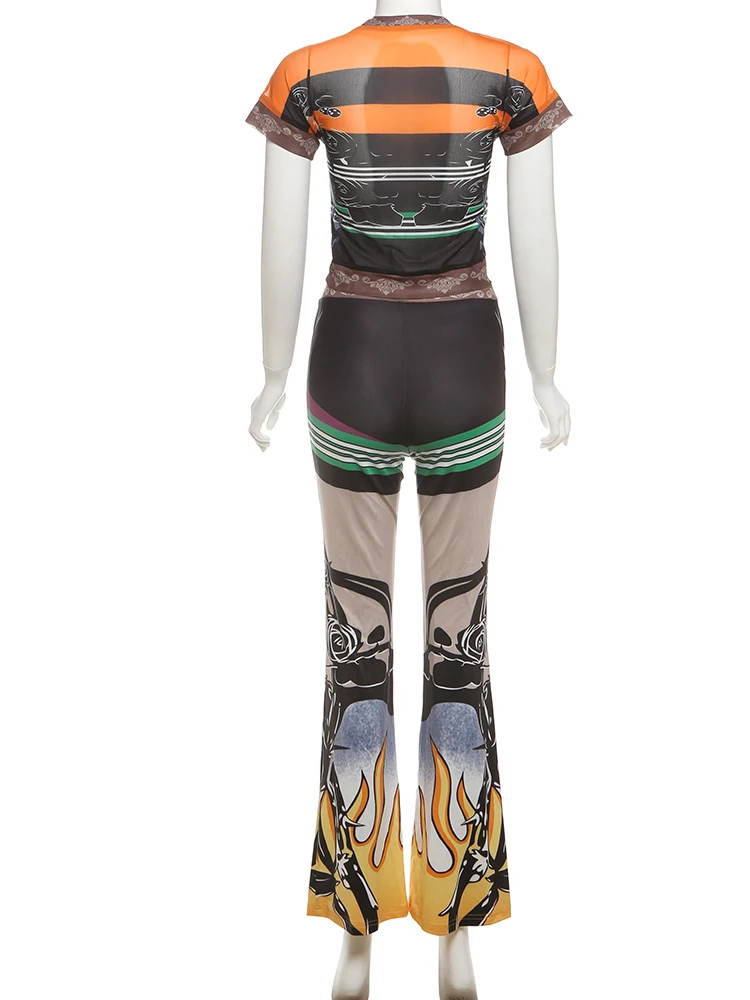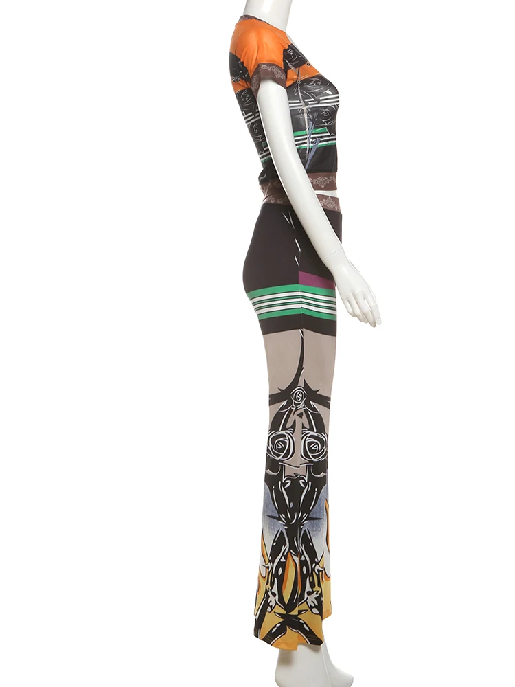 Colorful Art Print 2-Piece Set Elasticity Women See Through o-Neck Tops+Flared Trousers Summer Trend Daily Matching Suits