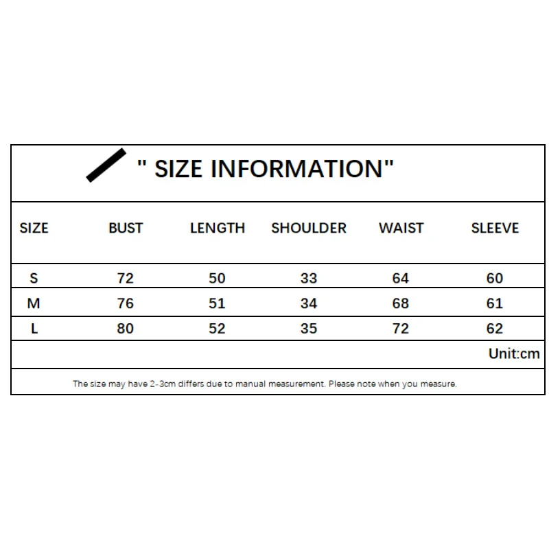 Size (cm)SLength: 50Bust: 72Sleeve: 60Shoulder: 33Waist: 64MLength: 51Bust: 76Sleeve: 61Shoulder: 34Waist: 68LLength: 52Bust: 80Sleeve: 62Shoulder: 35Waist: 72Size (inch)SLength: 19.68Bust: 28.35Sleeve: 23.62Shoulder: 12.99Waist: 25.2MLength: 20.08Bust: 29.92Sleeve: 24.02Shoulder: 13.39Waist: 26.77LLength: 20.47Bust: 31.5 Sleeve: 24.41Shoulder: 13.78Waist: 28.35Specification:Name: Women Long Sleeve T-ShirtsGender: WomenMaterial: 100% PolyesterPattern: Solid ColorSize: S/M/LPackage Contents1 x TopsFriendly Tips: 1. Please kindly allow a 2-3% difference according to manual measurement.2. Please check the measurement chart carefully before you buy the item. (1 inch = 2.54 cm)3. Please note that a slight color difference should be acceptable due to the light and screen. Thanks. PromiseIf the product has any quality problems, please tell us, we will help you solve the problem as quickly as possible.