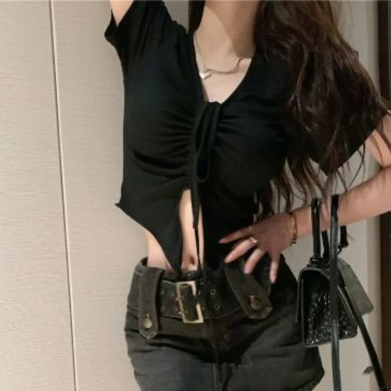 Crop Tops Fashion Korean Woman Tshirts Short Sleeve V-neck Tunic Tees Drawstring Irregular T Shirts Ropa Mujer Sexy Summer Tees