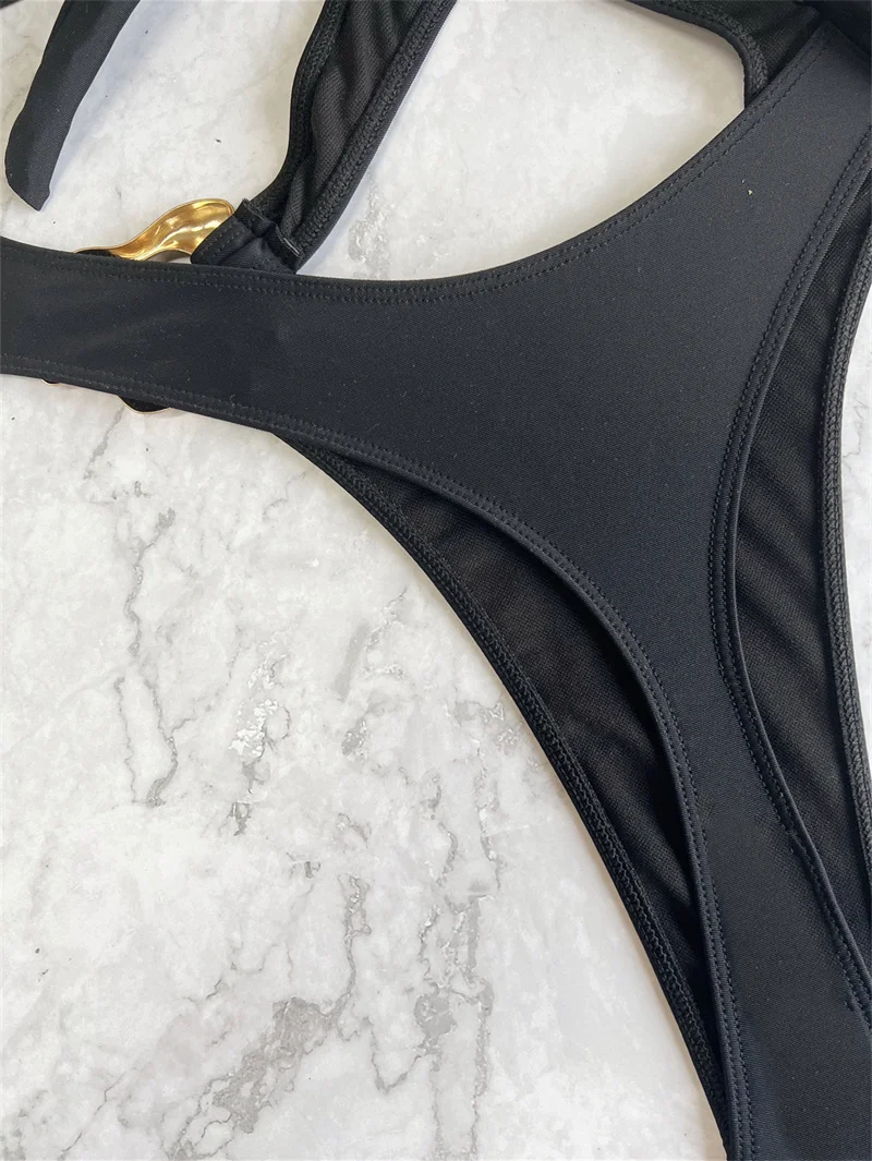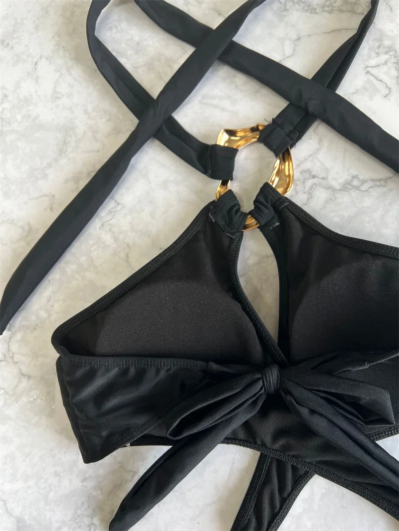 Cross Halter Rings One Piece Swimsuit Women 2025 Black Monokini Sexy Hollow Out Swimwear Thong Bathing Suit