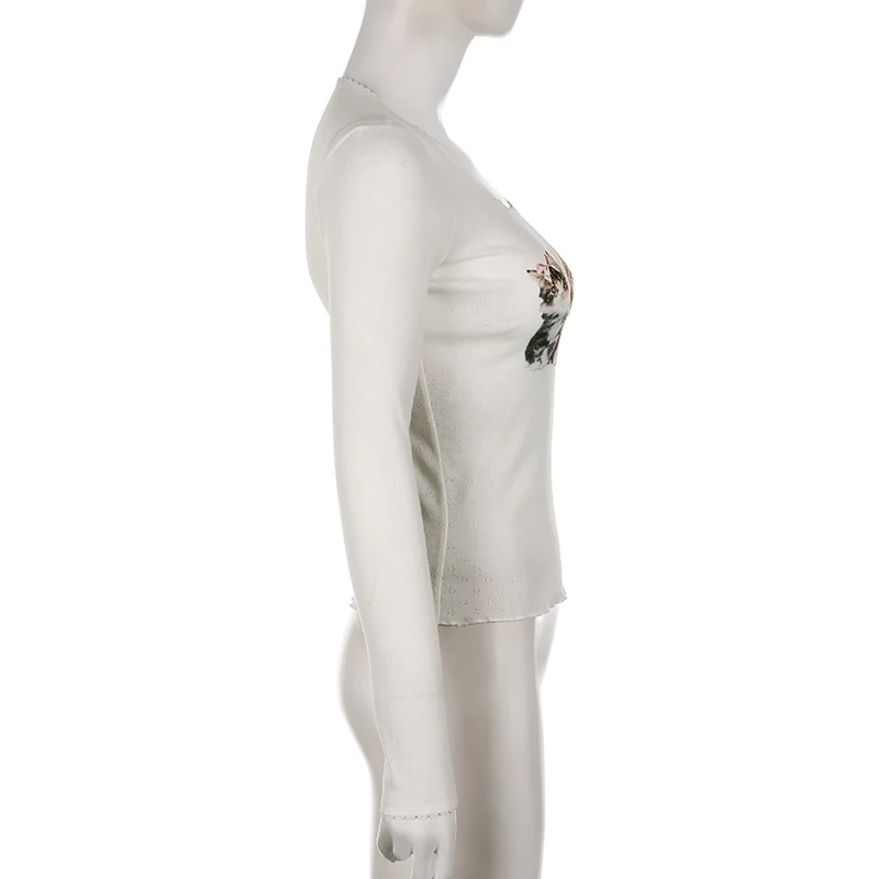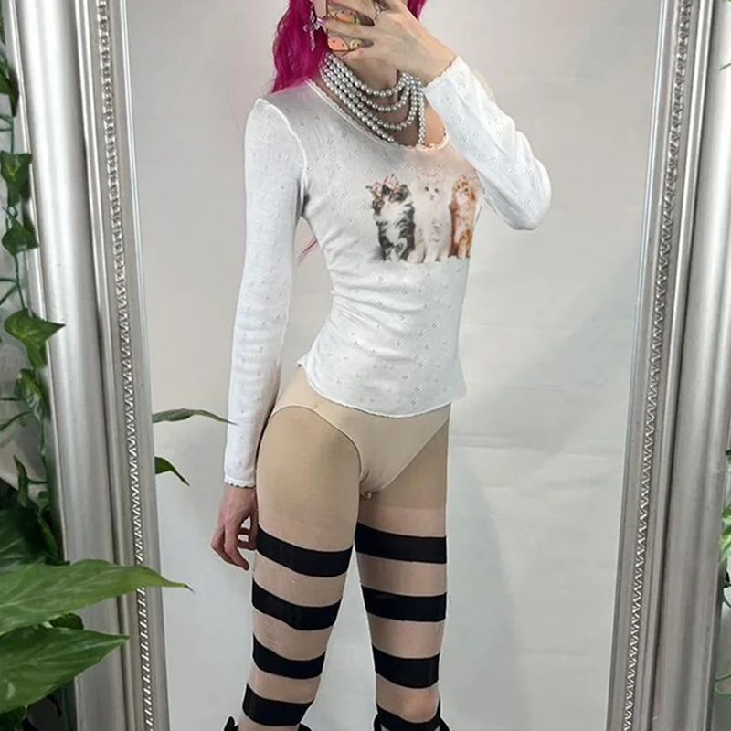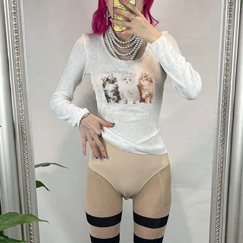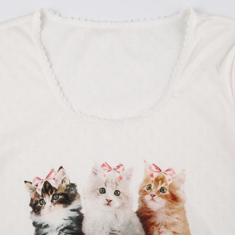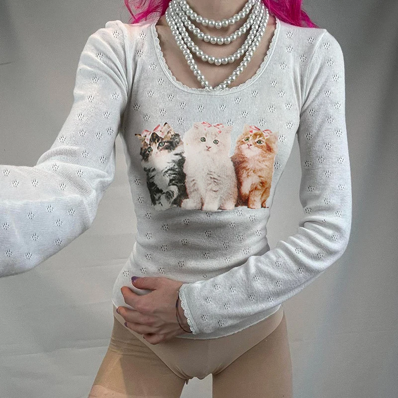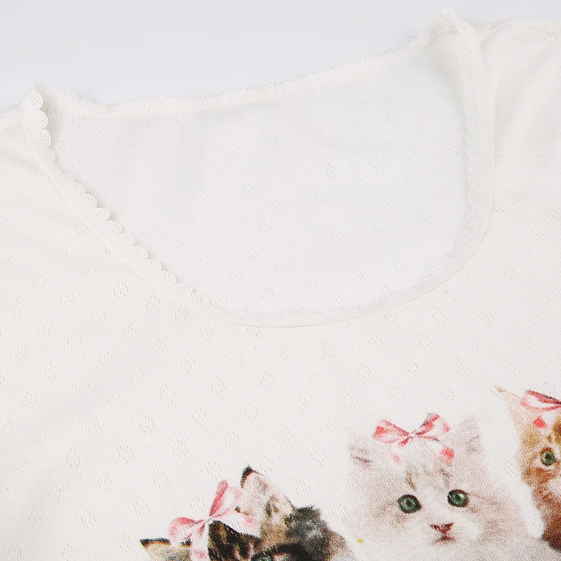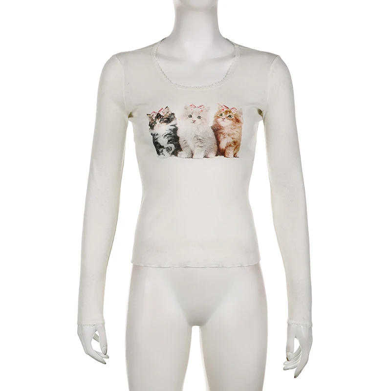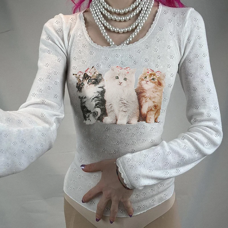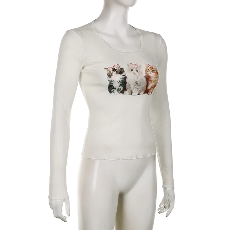 Cute Korean Style Cat Print Knit Autumn Tee Shirt Women Kawaii Lace Trim Slim Spring Autumn T shirt Tops Basic Cloth