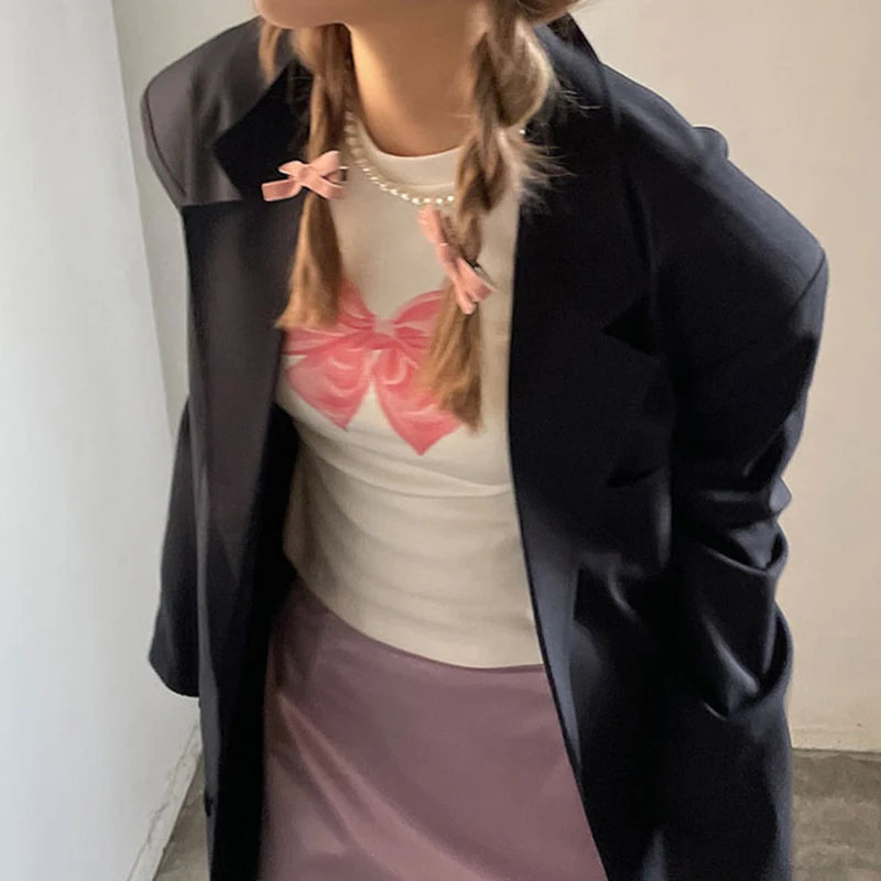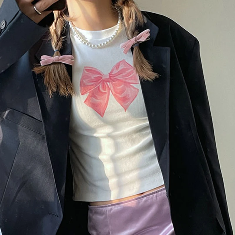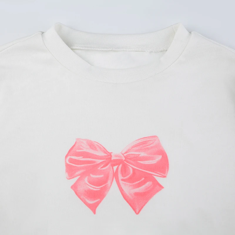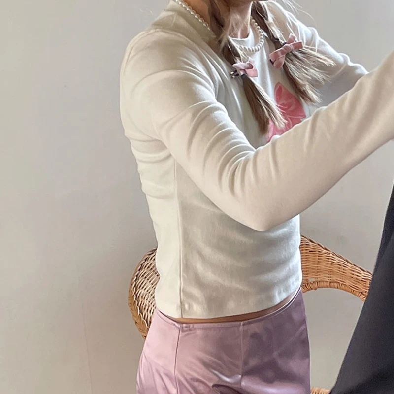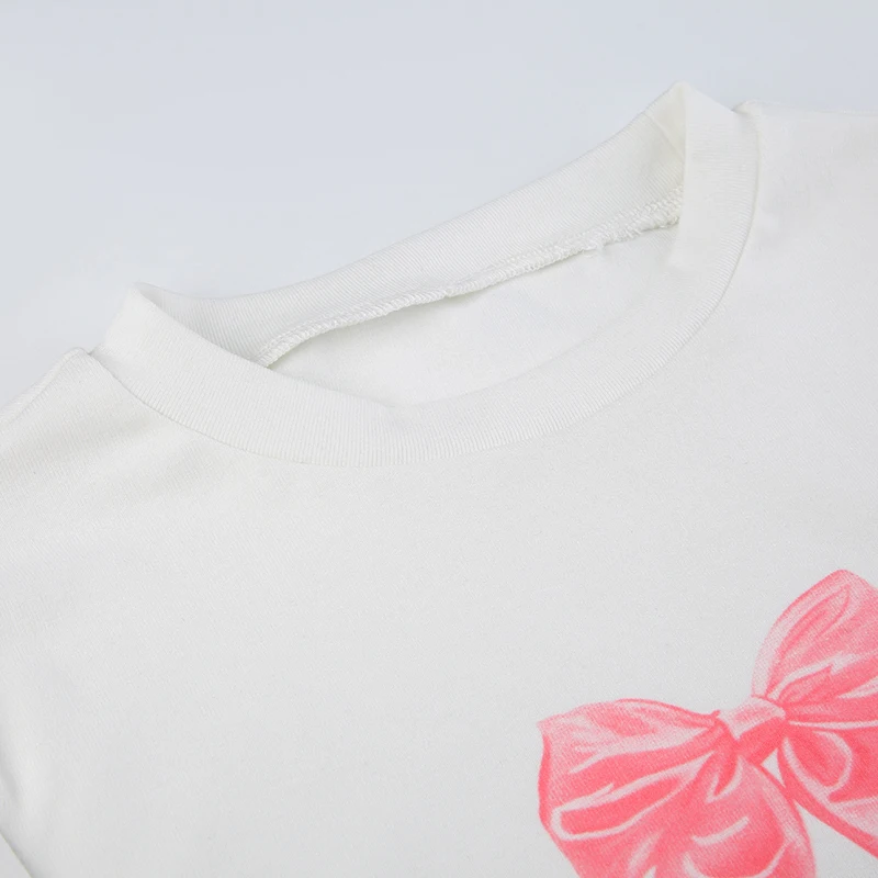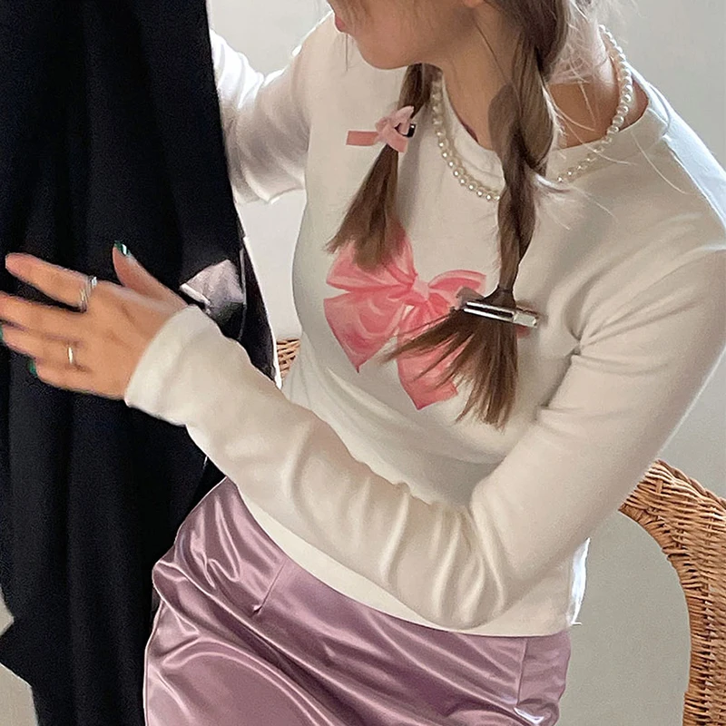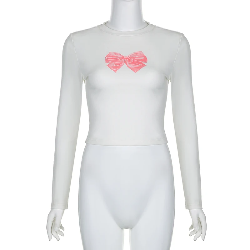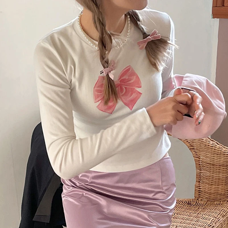 Cutecore Bow Print White Autumn T shirt Women Slim Korean Coquette Clothes Tee Pullover Kawaii Sweet Top Crop Casual