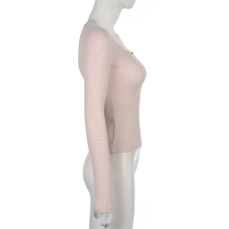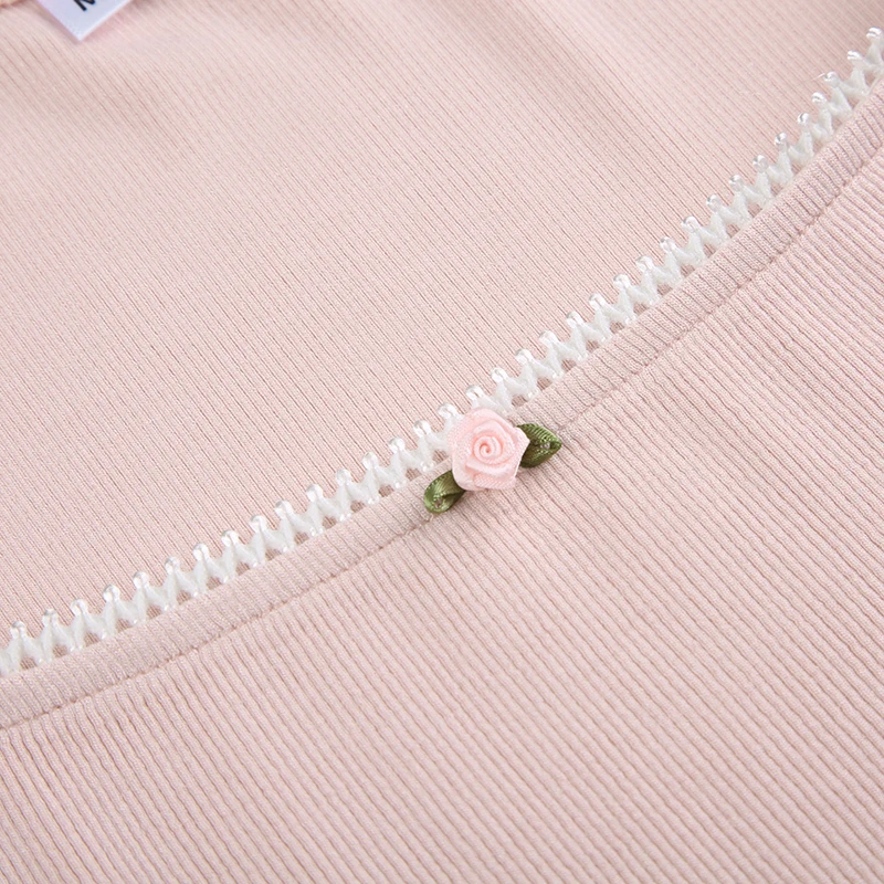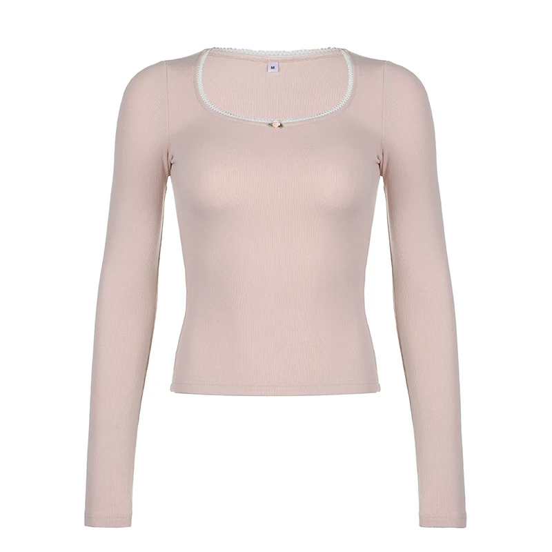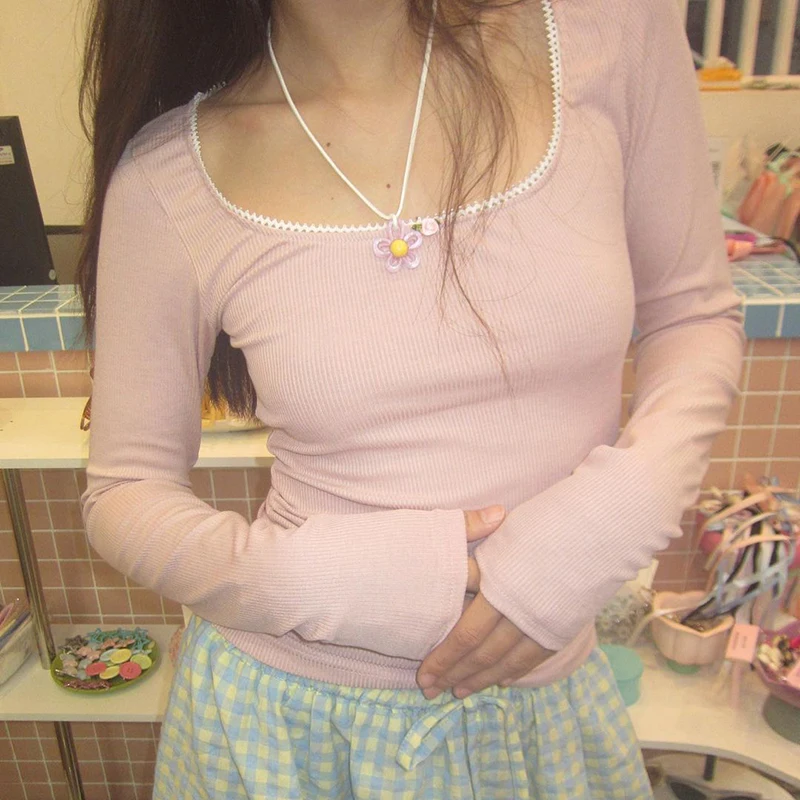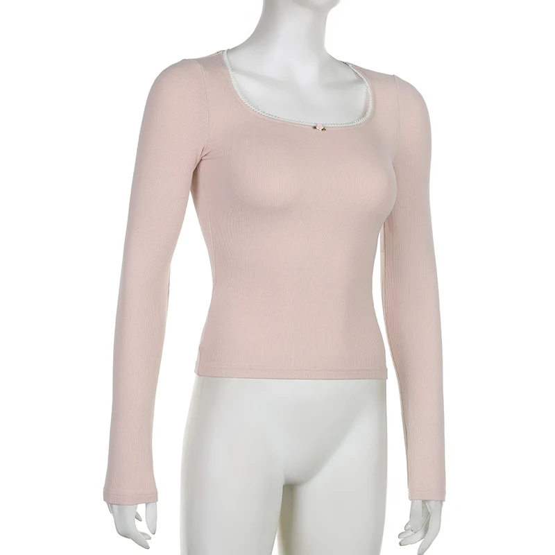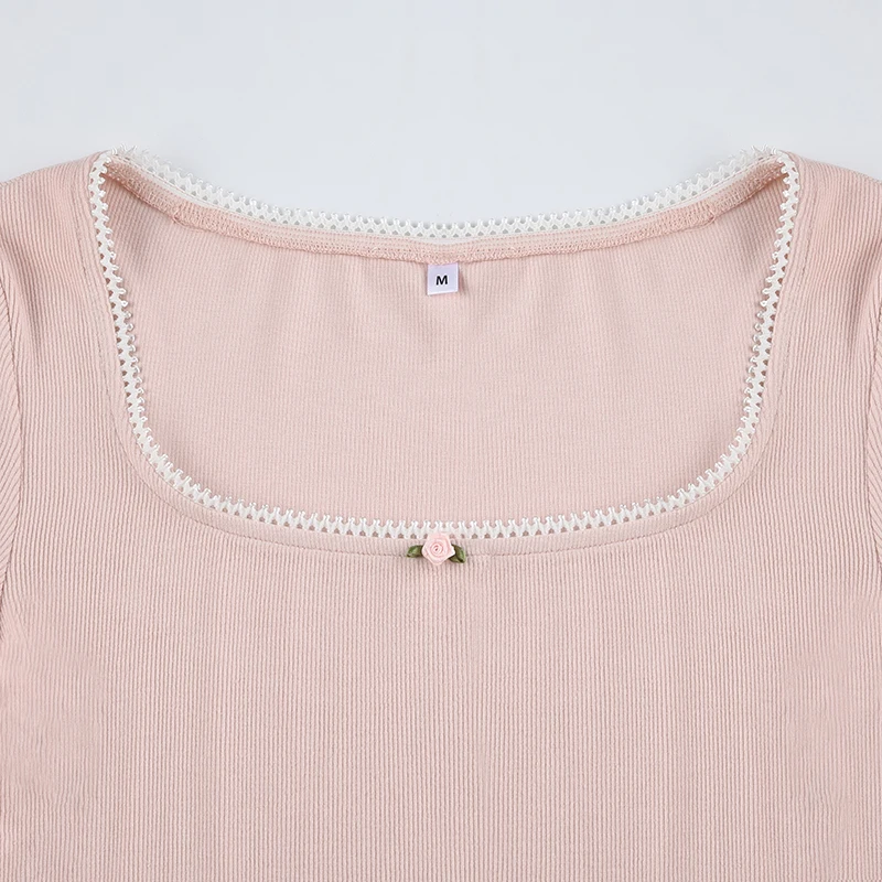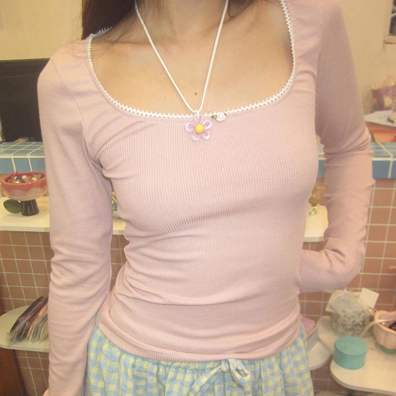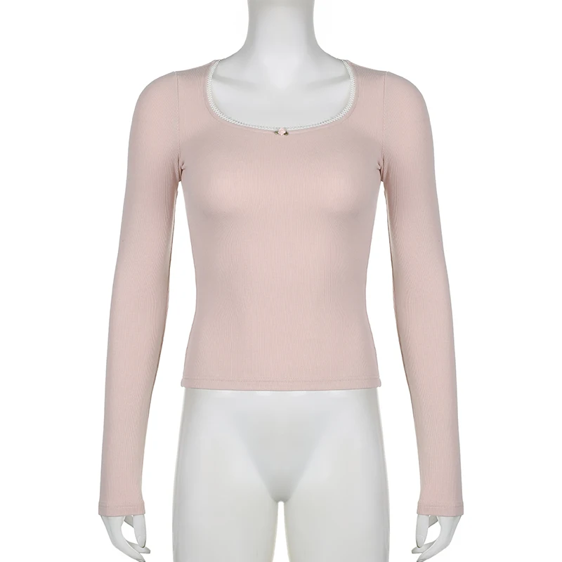 Cutecore Pink Sweet Women Tee Shirts Lace Trim Slim Korean Coquette Clothes Top Spring Auutmn T-shirt Kawaii Pullover
