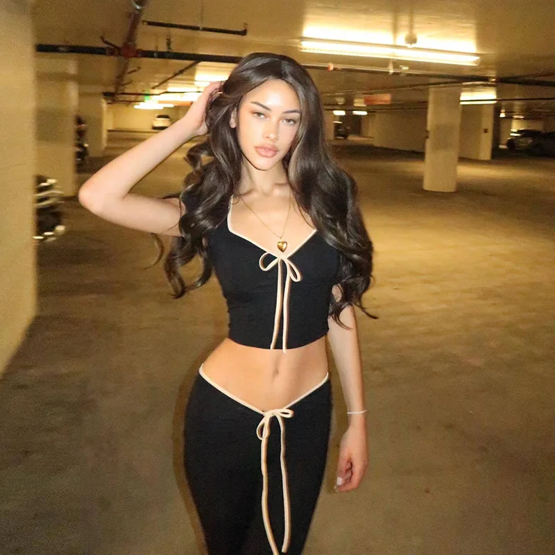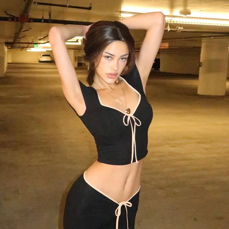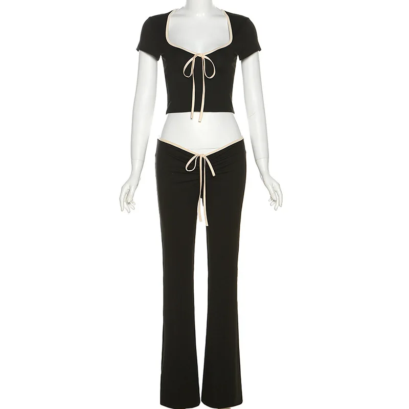 Daily Women New In Matching Sets Lace Up Short Sleeve Tops+V Shape Low Waist Flare Pants Temperament Streetwear Outfits