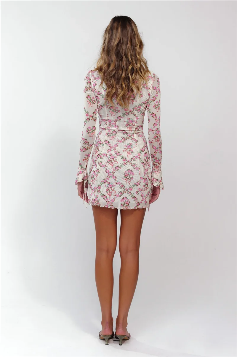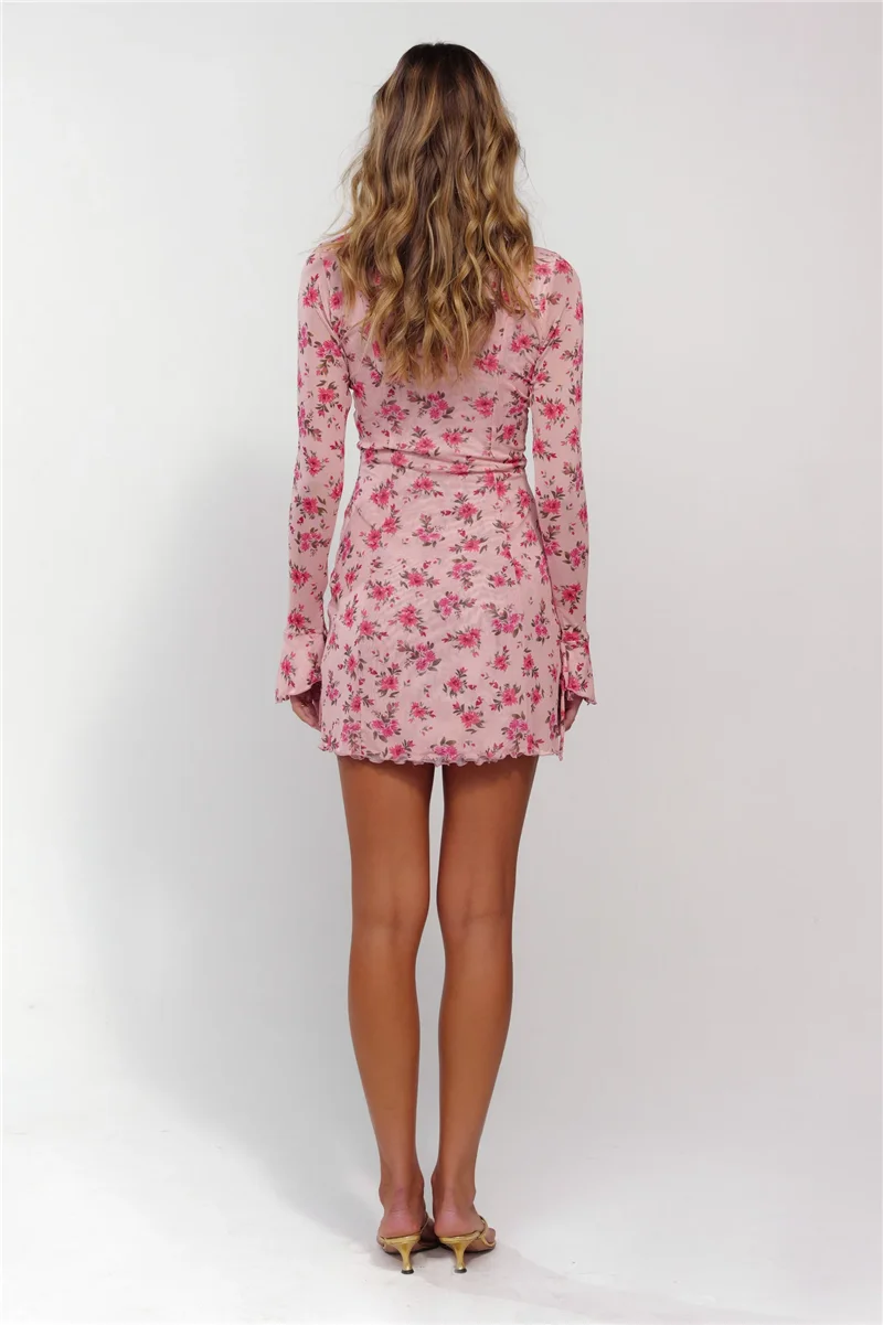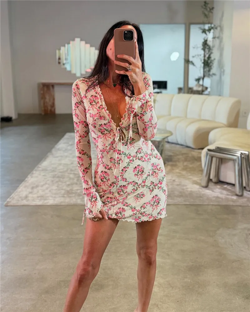 Deep V Neck Lace-up Print Sexy Mini Dress For Women Robe Elegant Long Sleeve High Waist Bodycon Floral Print Dress