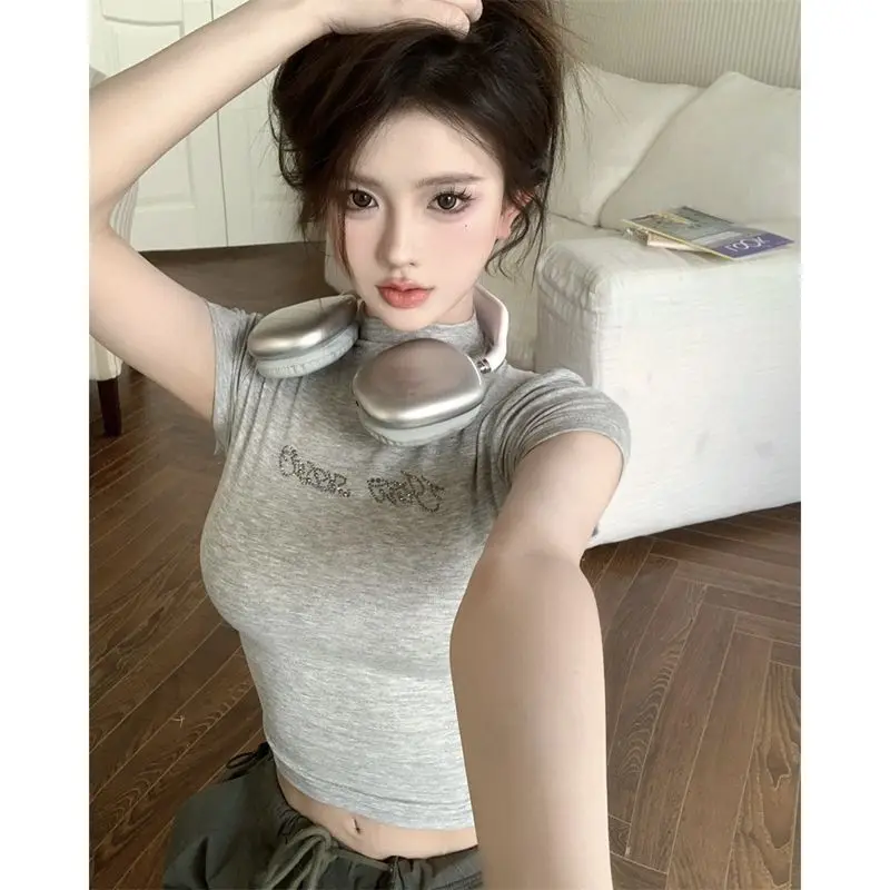 Diamond Y2k Tshirts 2024 Women Clothes Half High Collar Short Sleeve Summer Tees Fashion Casual Tunic Korean T Shirts Ropa Mujer