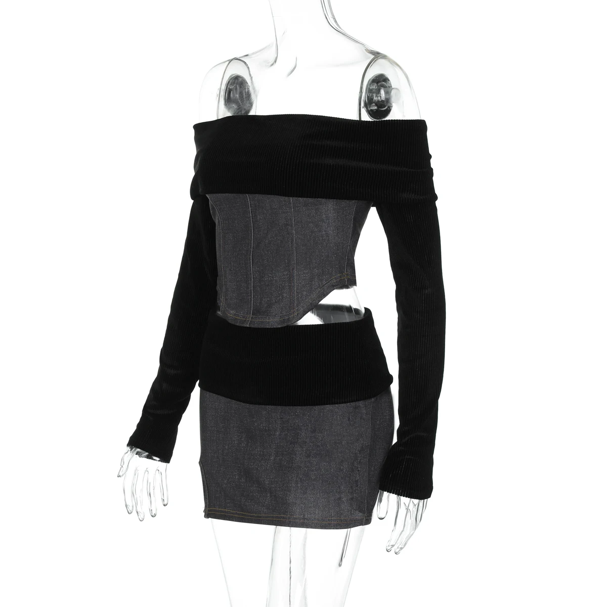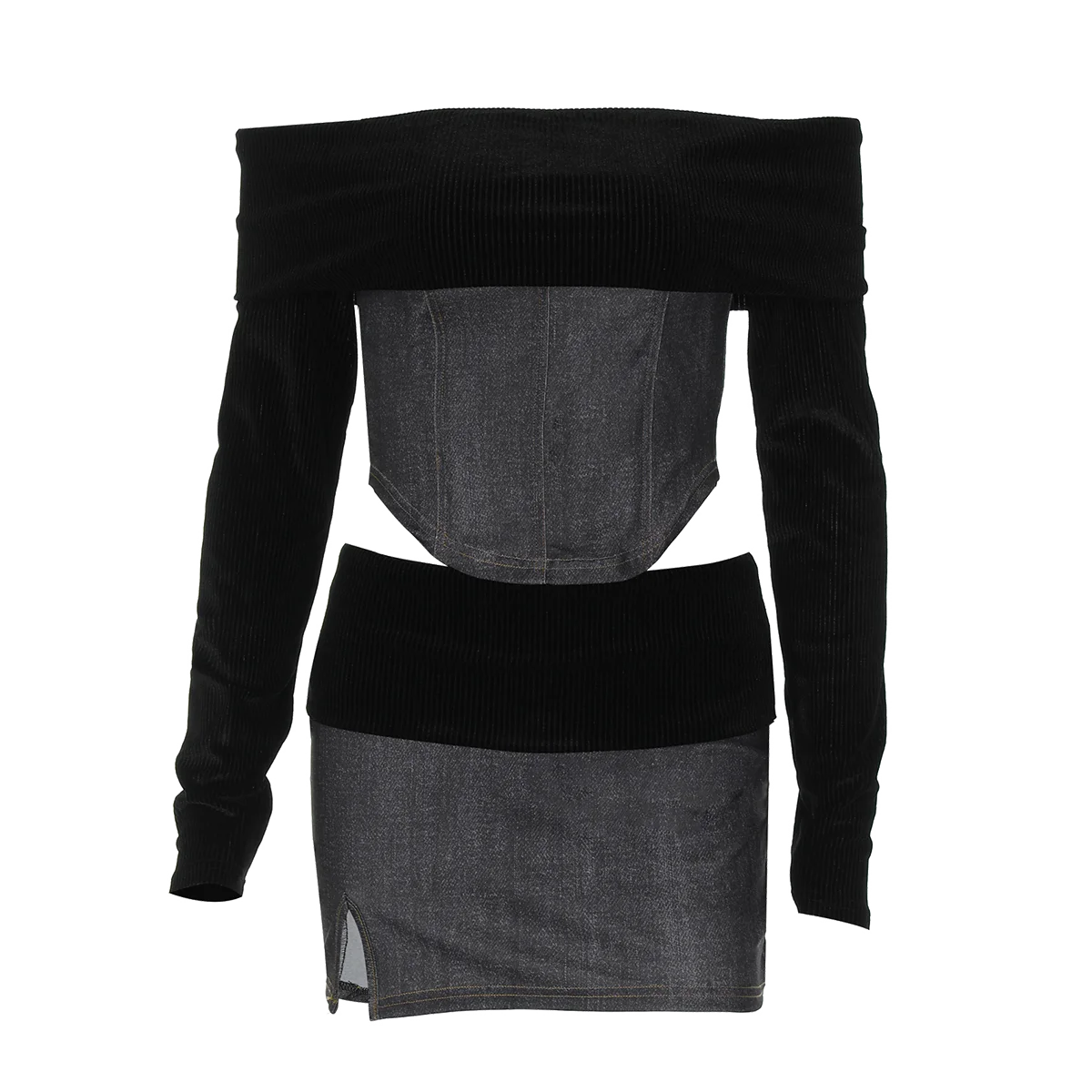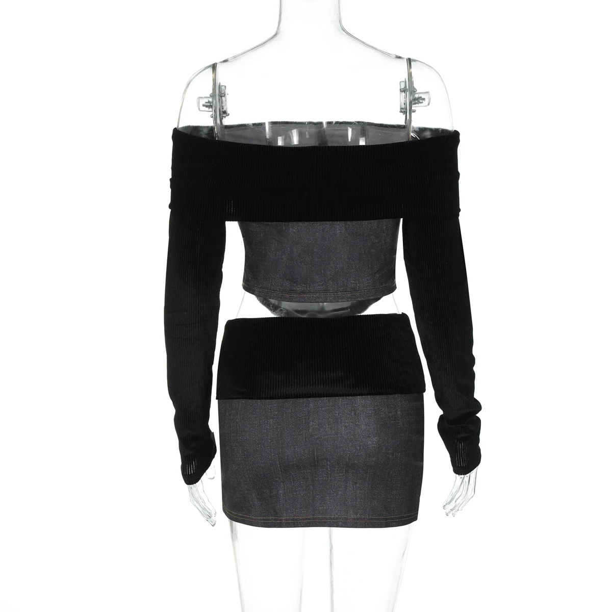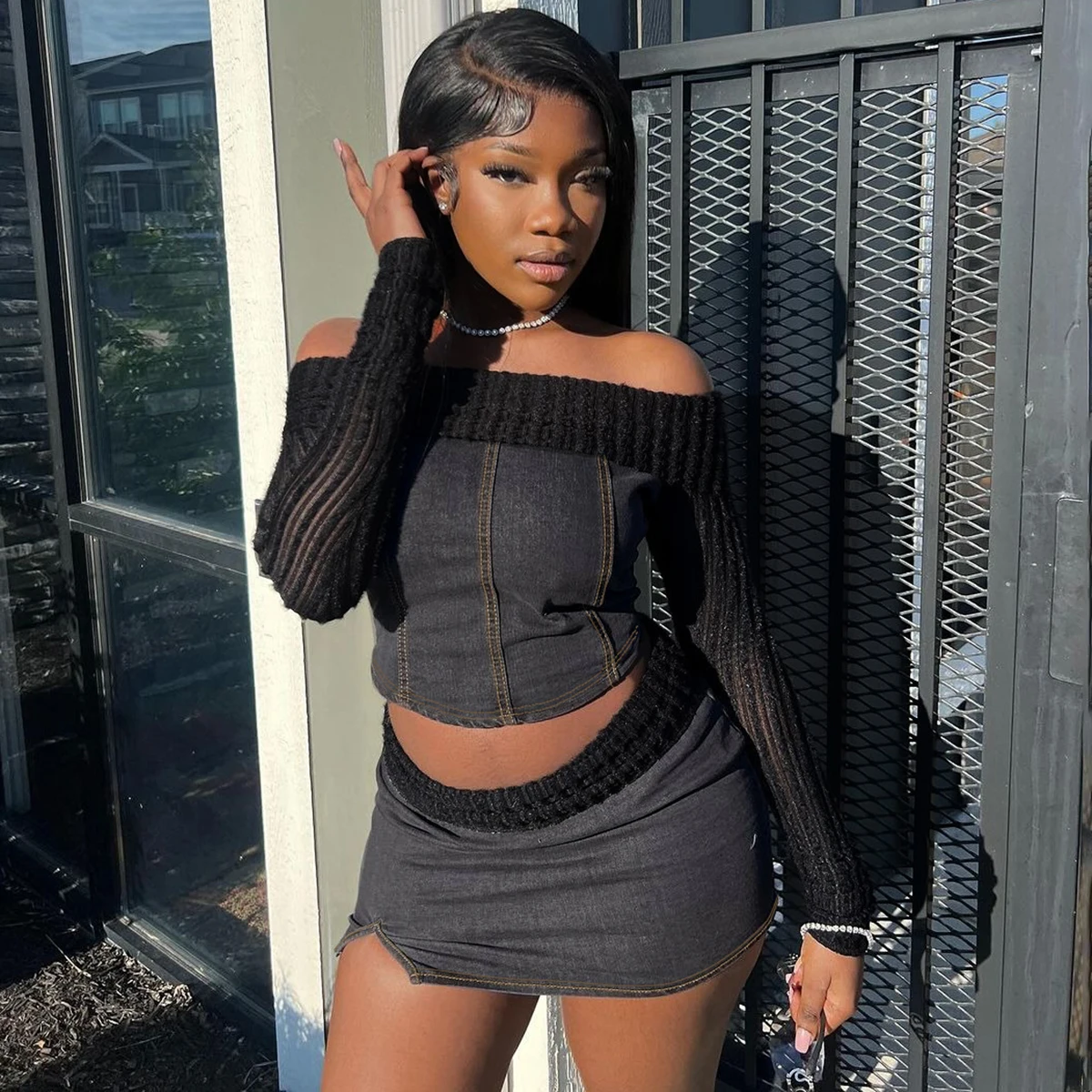 Elegant 2 Pcs Sets Slash Neck Long Sleeve Sexy Crop Top Slit Mini Skirt Autumn Women Y2K Clothes Streetwear Party