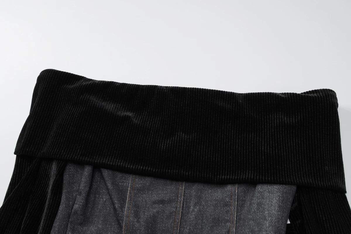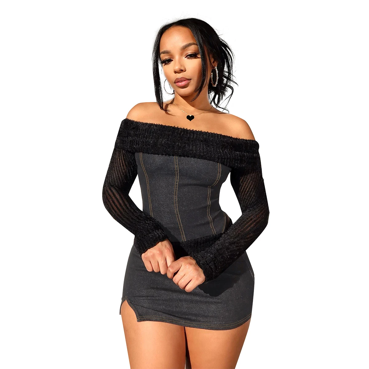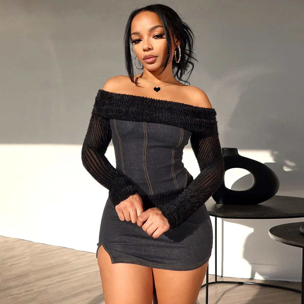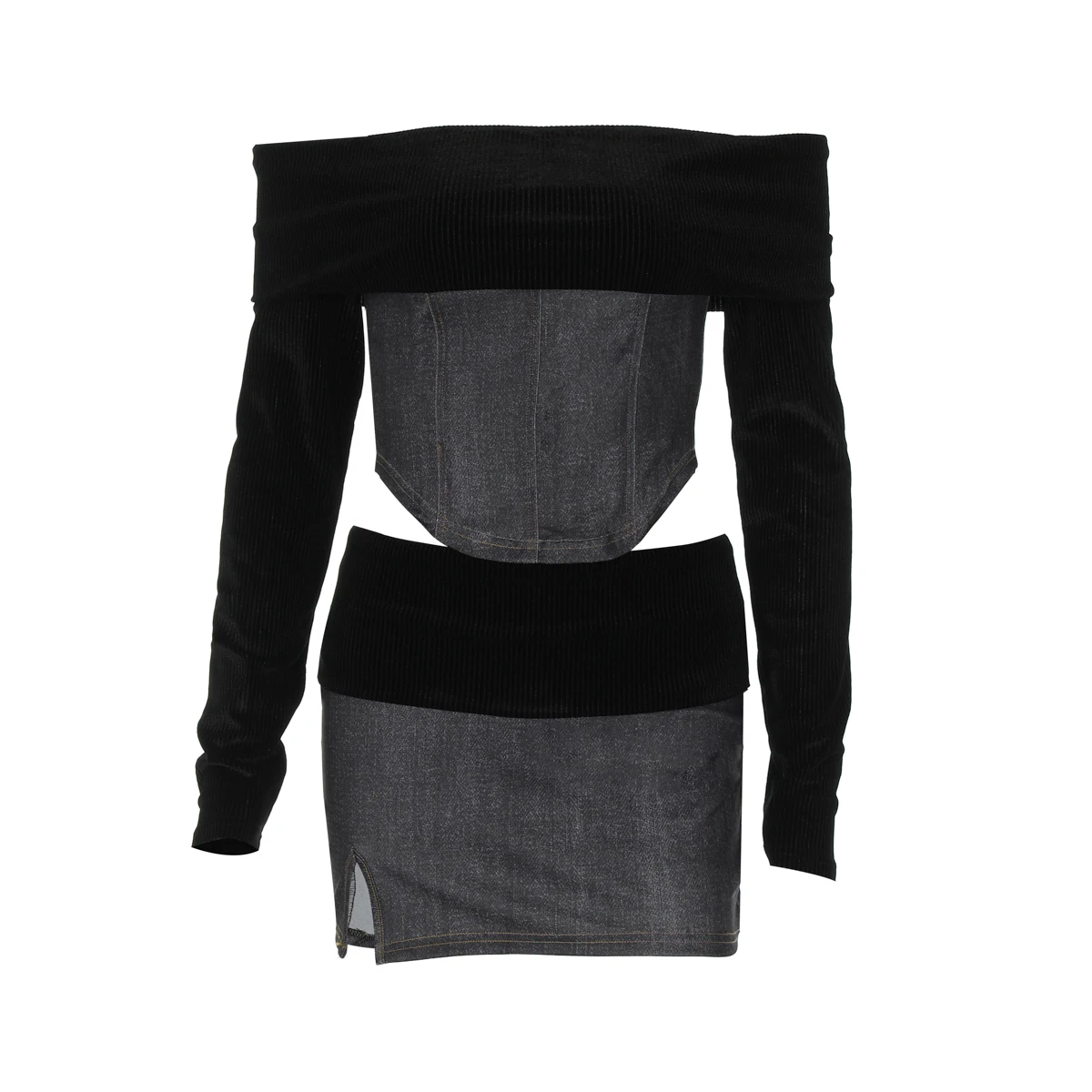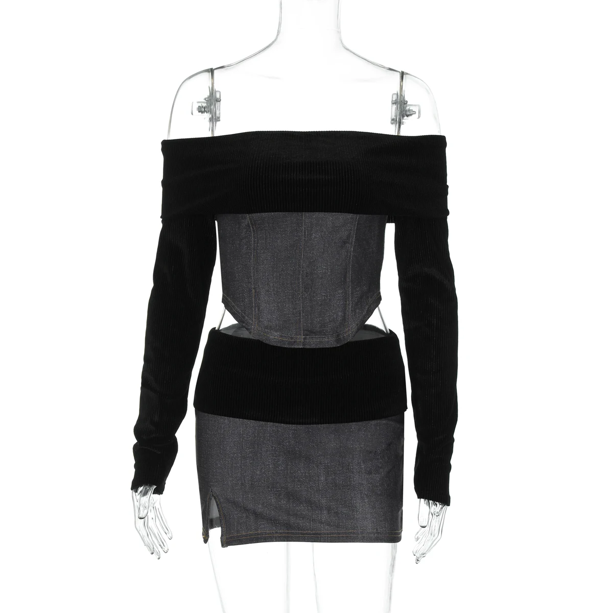 Elegant 2 Pcs Sets Slash Neck Long Sleeve Sexy Crop Top Slit Mini Skirt Autumn Women Y2K Clothes Streetwear Party