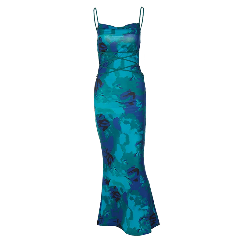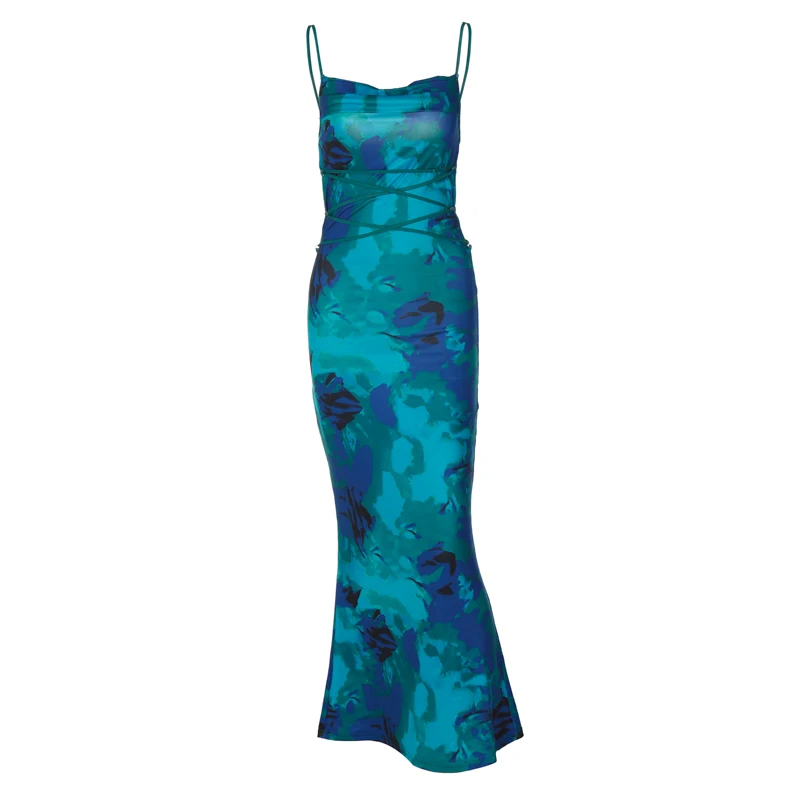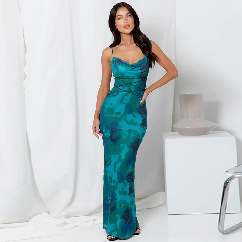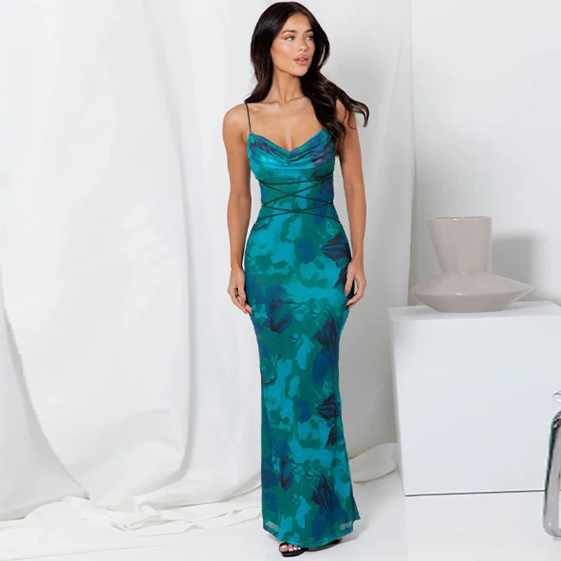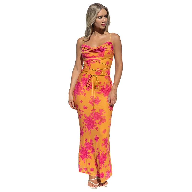 Elegant Floral Print Sleeveless Backless Lace Up Sexy Slim Slip Maxi Dress Summer Women Clothes Festival Rave Party