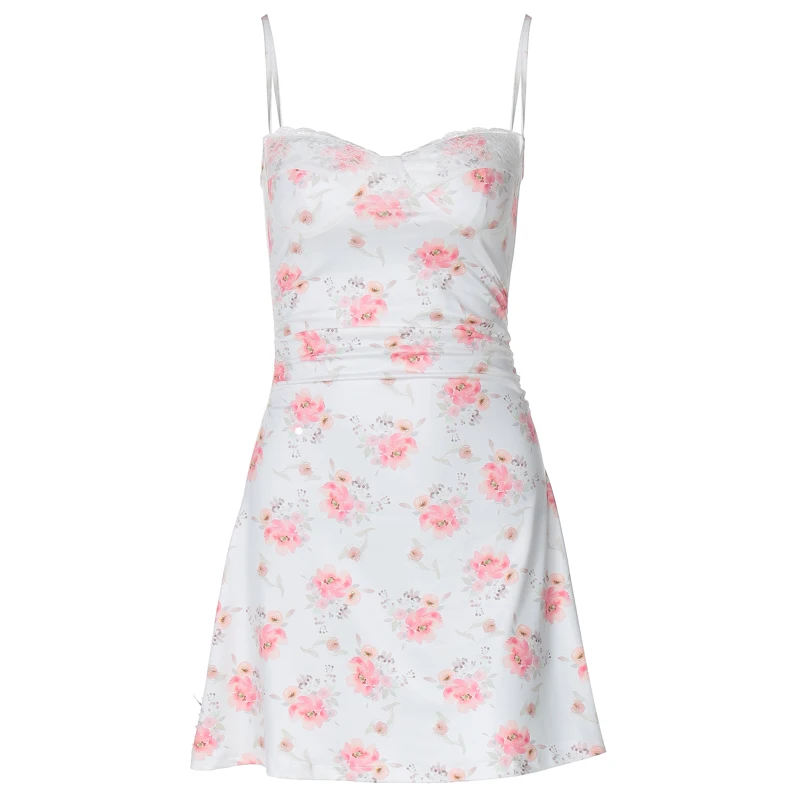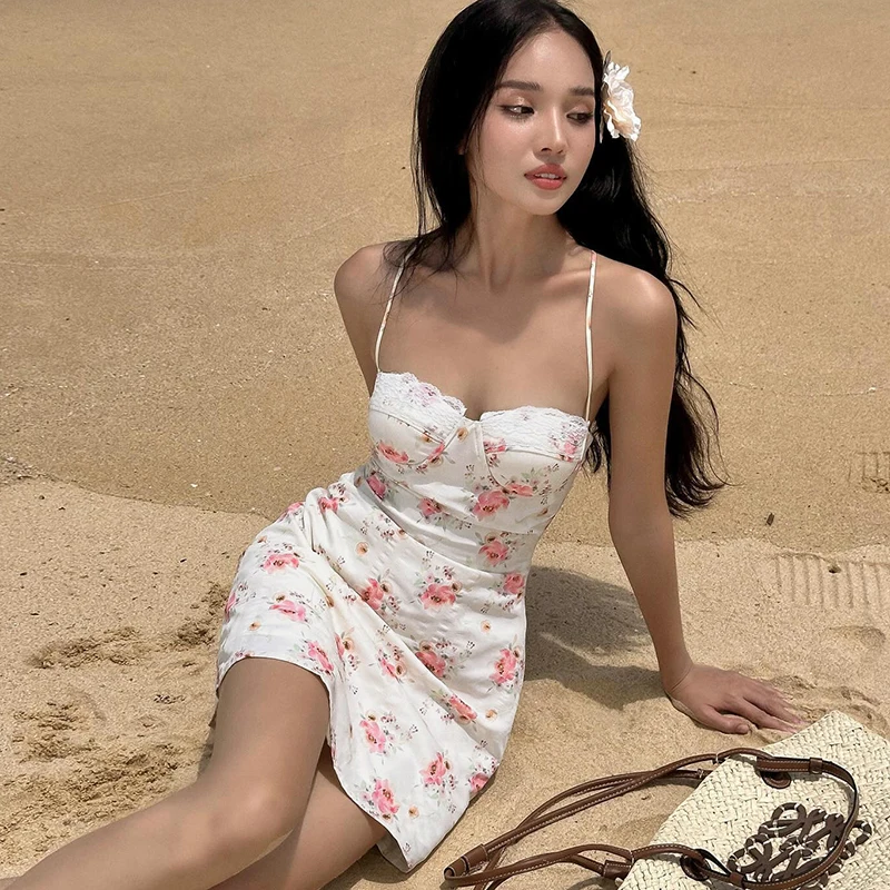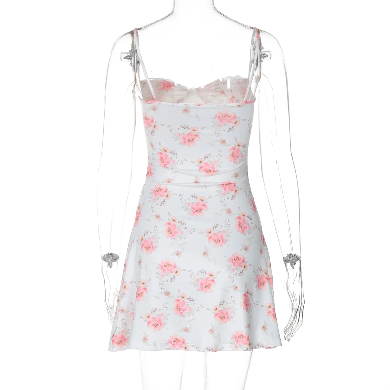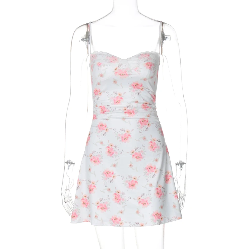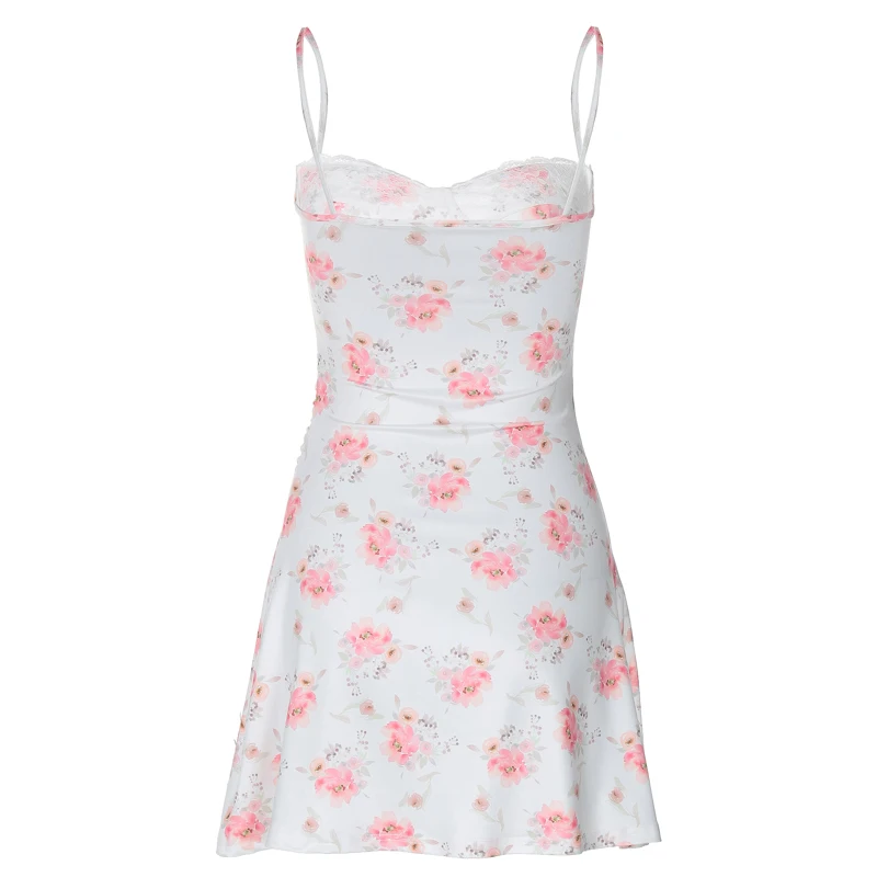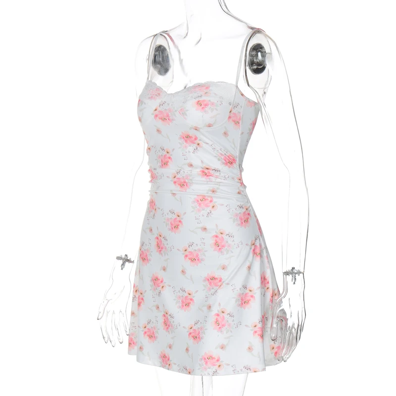 Elegant Floral Print Slips Draped Patchwork Lace Sexy Slim Mini Dress Summer Cute Outfits Birthday Party Vacation