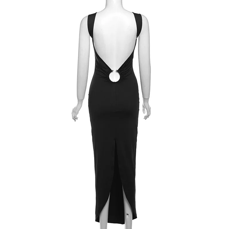 Elegant Hollow Out V-neck Slip Backless Party Evening Maxi Dress For Women 2024 Spring Sexy Slim Split Solid Dress