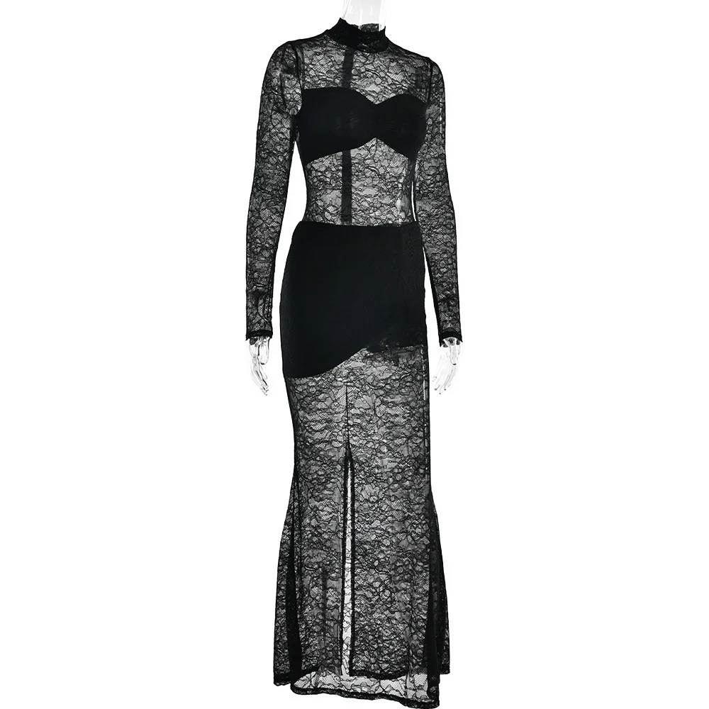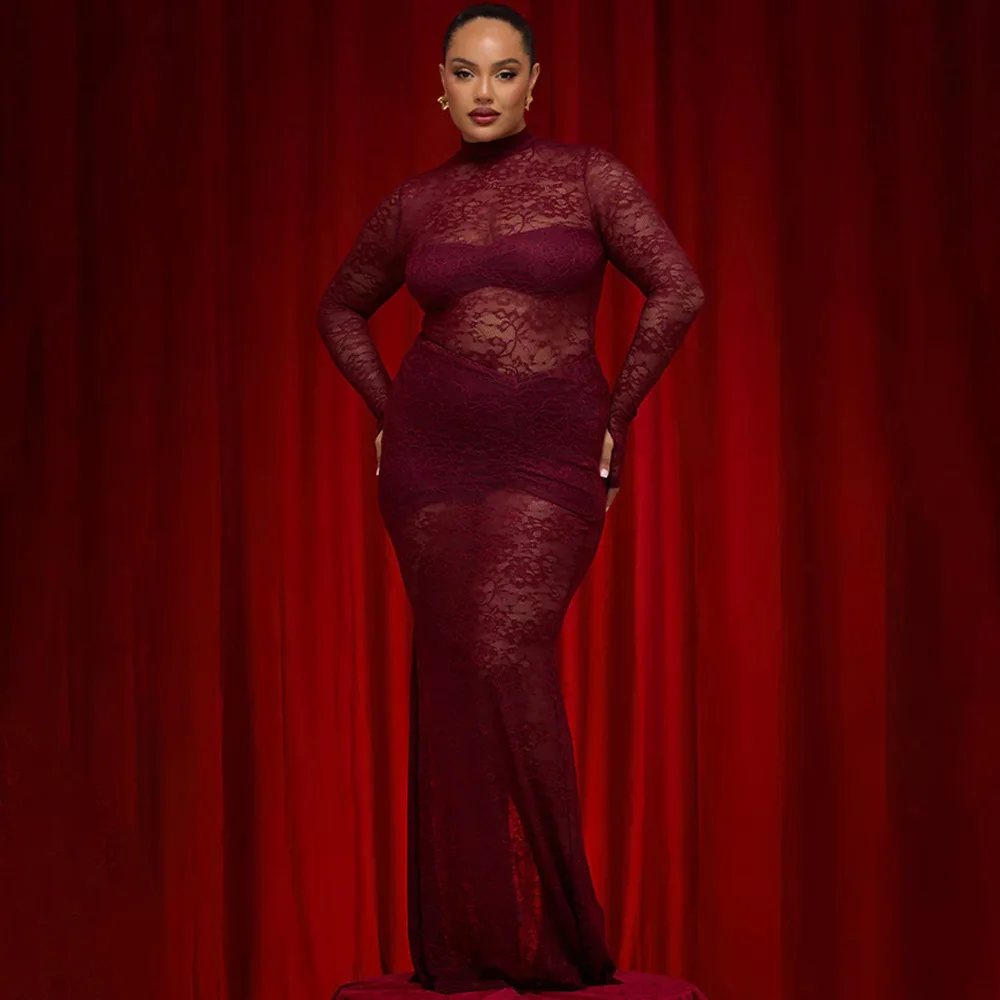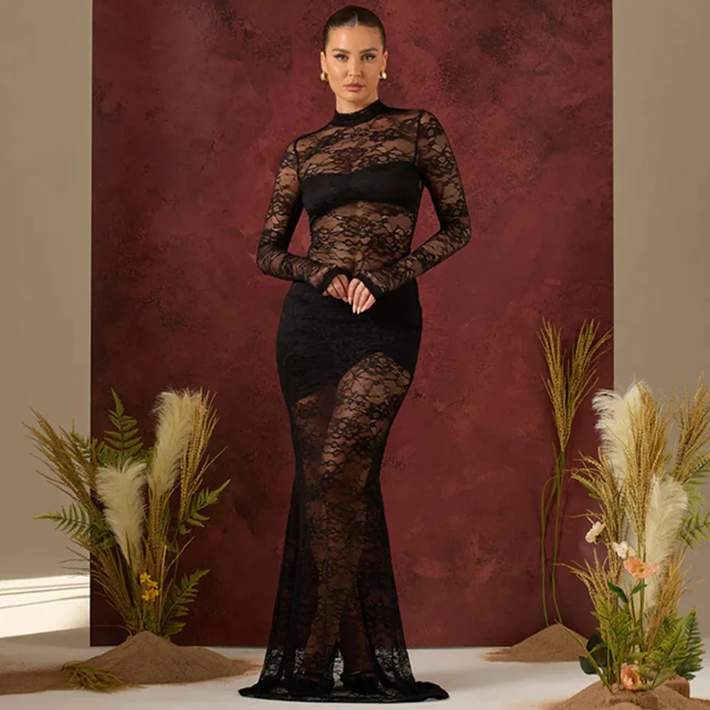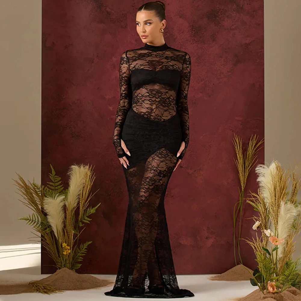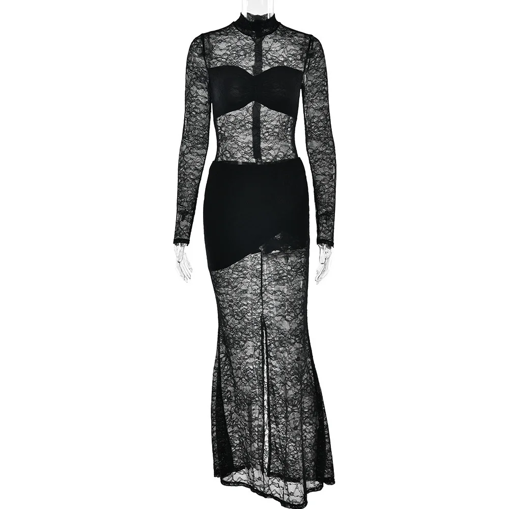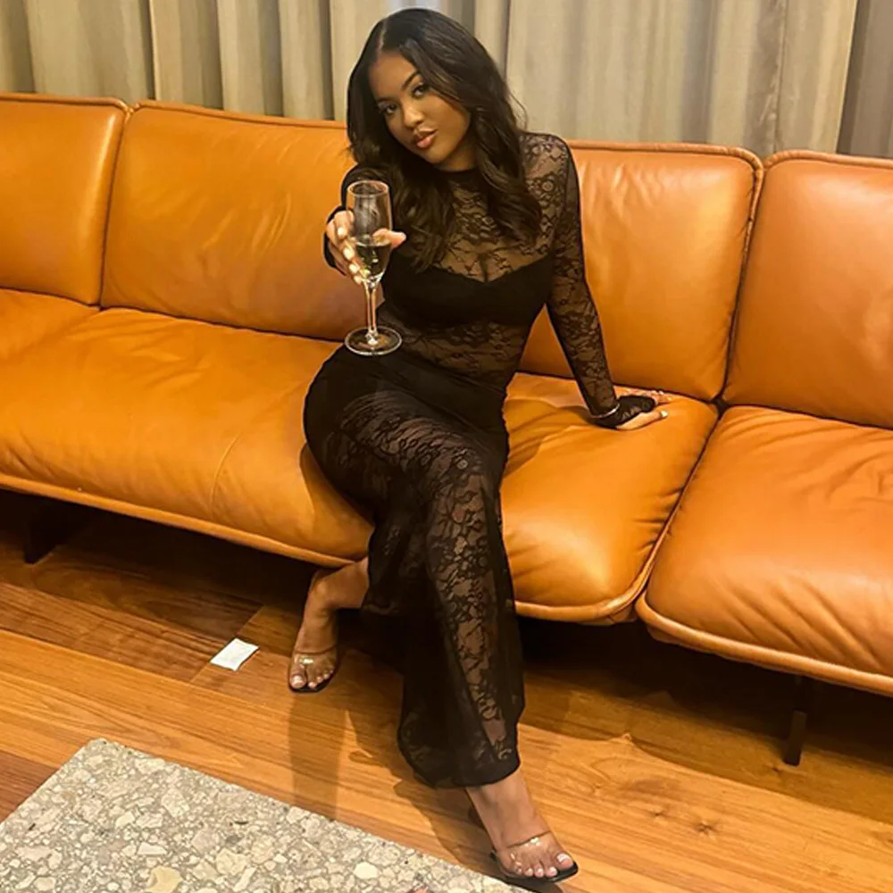 Elegant Lace Long Sleeved Bodysuit Half Skirt Two-piece Set Women Sexy Perspective Slim Set Winter New 2025 Clothing