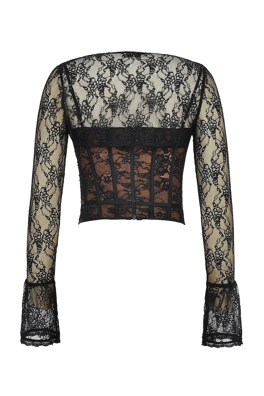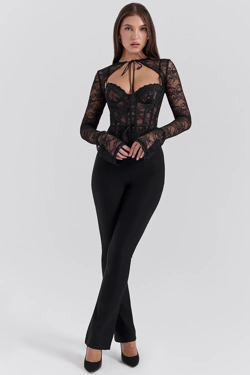 Elegant Lace Printed Patchwork Long Sleeve Hollow Out Women Top Set Sexy Perspective Fishbone Tight Strap Up 2025 Set