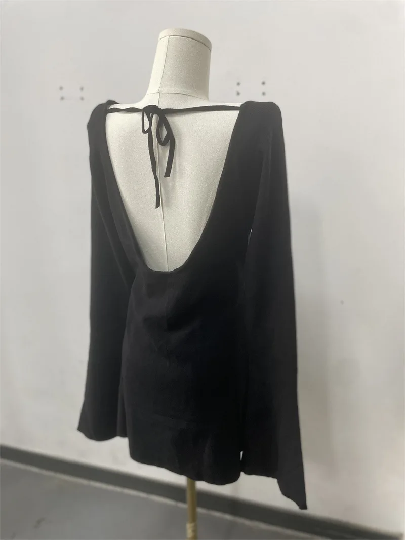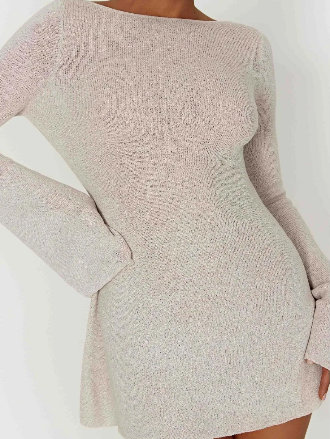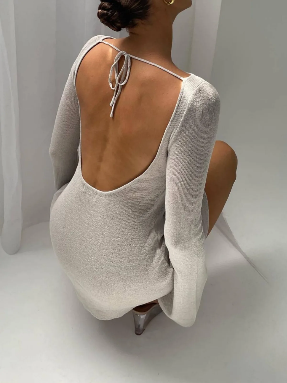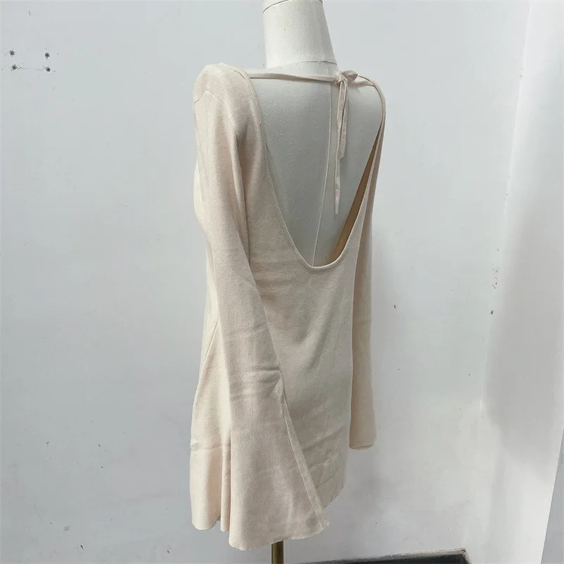Elegant Long Sleeved Knitted Lace Up Dress Women Sexy Solid Color Backless Knitted Mini Skirt Dress Fashion Streetwear