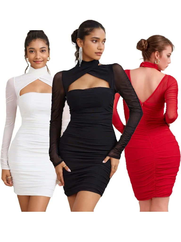 Elegant Mesh Patchwork Elastic Tight Hollow Women Dress Sexy Long Sleeve Backless Fold Double Layer Party Evening Dress