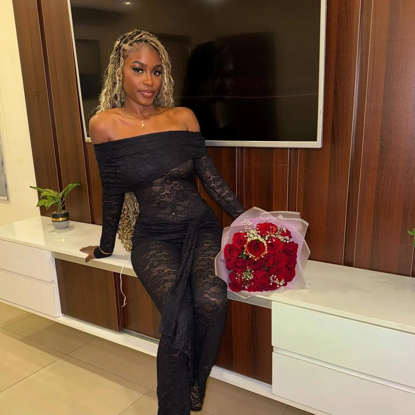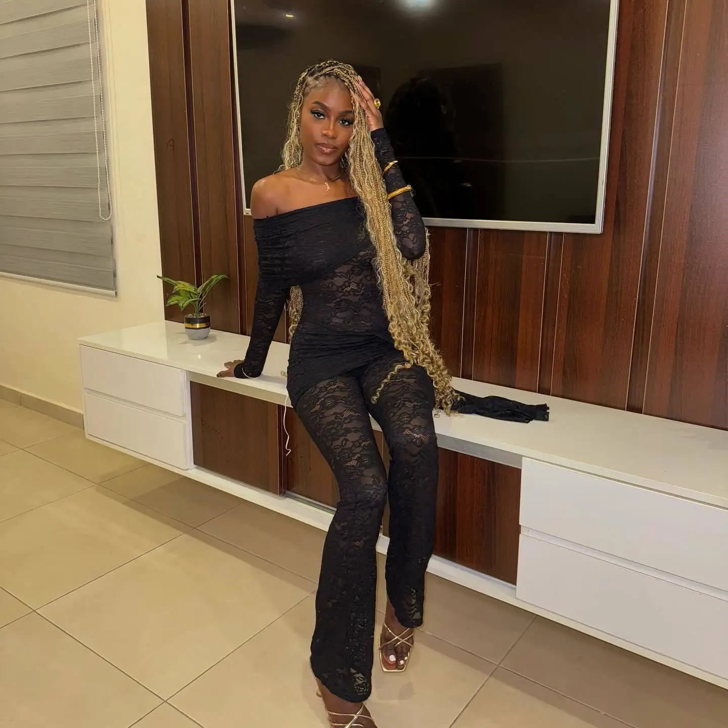 Elegant Off Shoulder Long Sleeved Lace Up Jumpsuit Party Club Jumpsuit Backless Lace See Through Jumpsuit Spring New2025