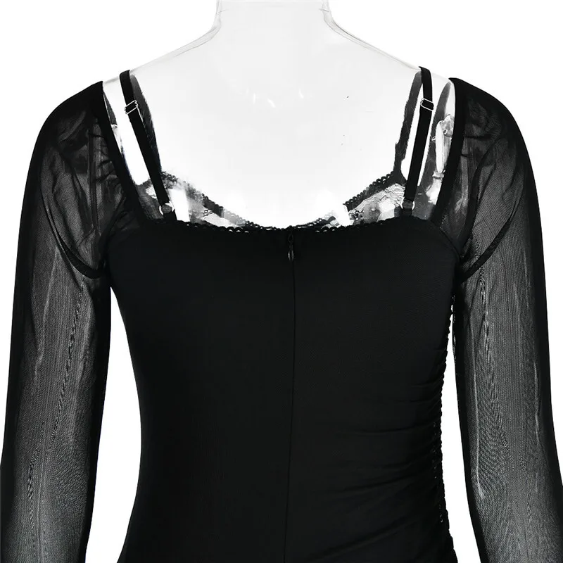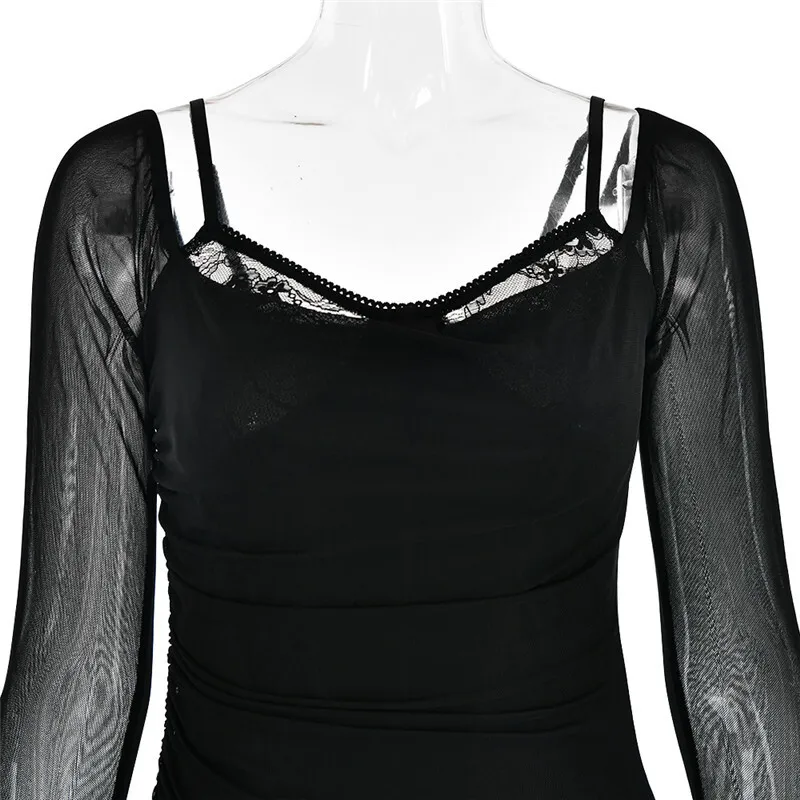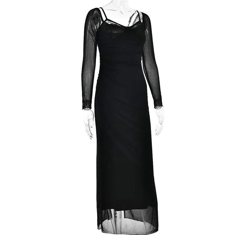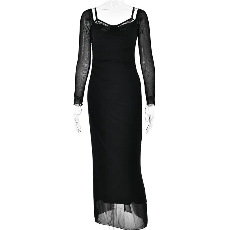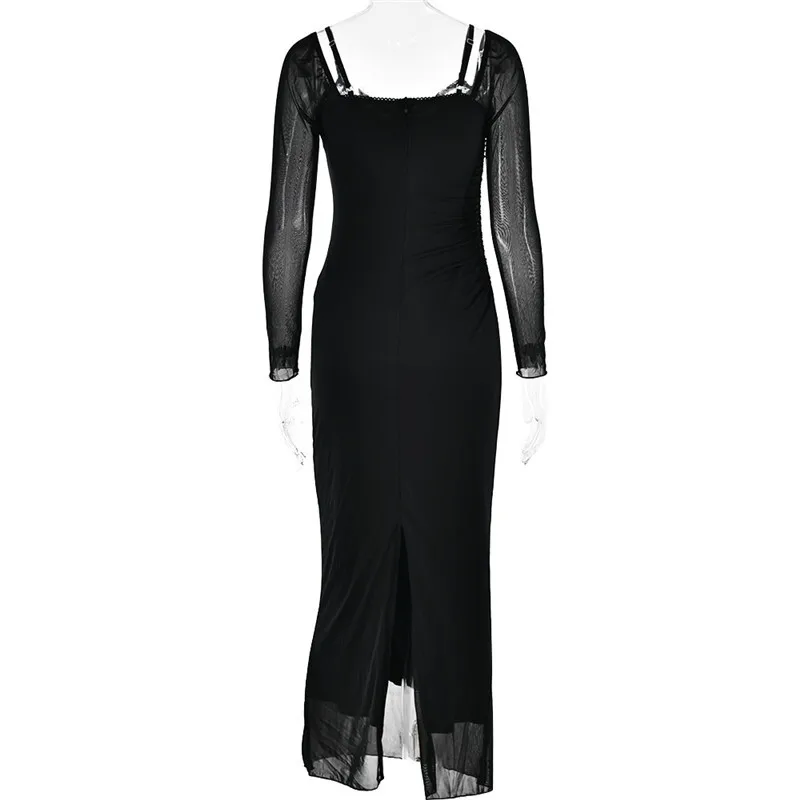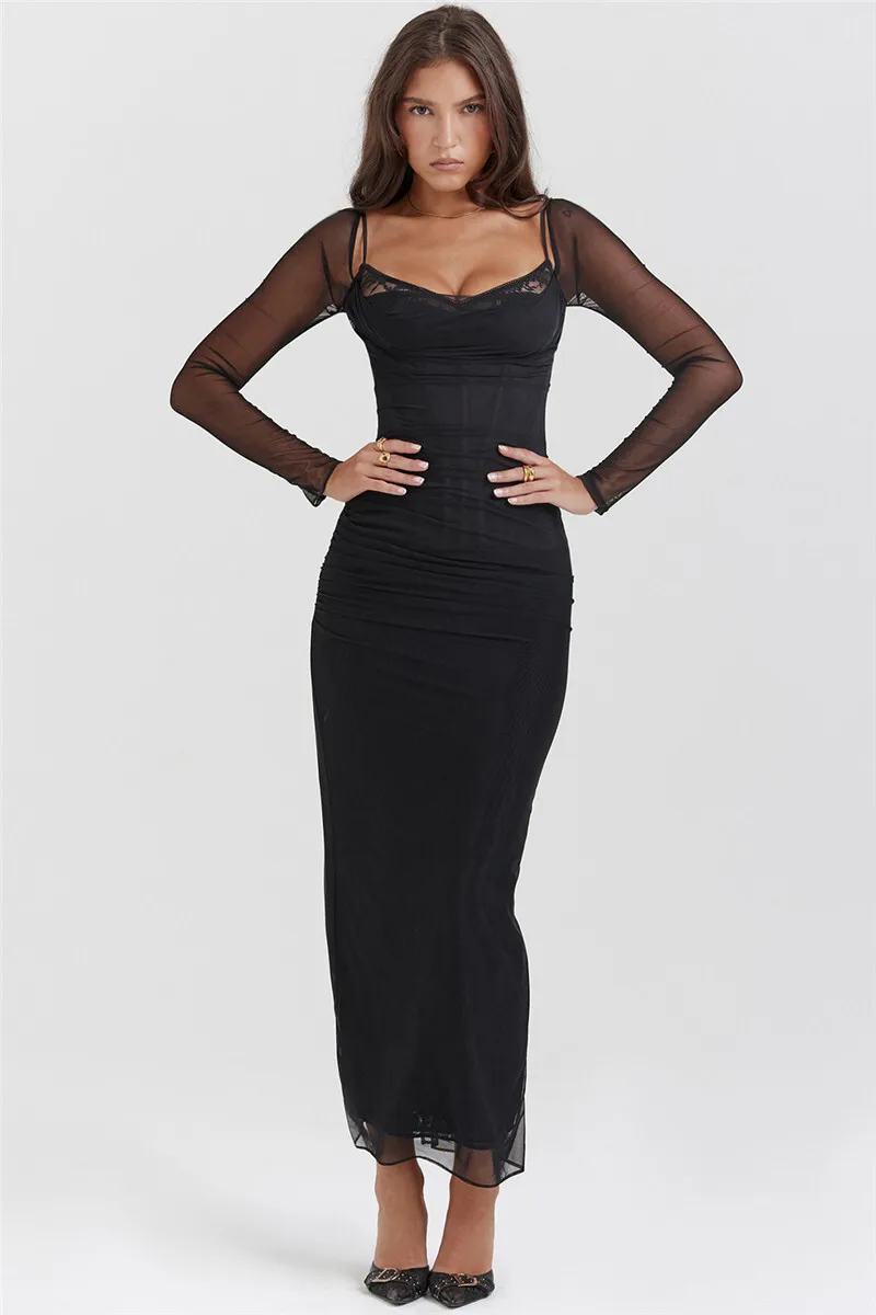 Elegant Sheer Long Sleeve Bodycon Maxi Dress For Women Fashion Mesh Black Strapless Backless Club Party Sexy Dress