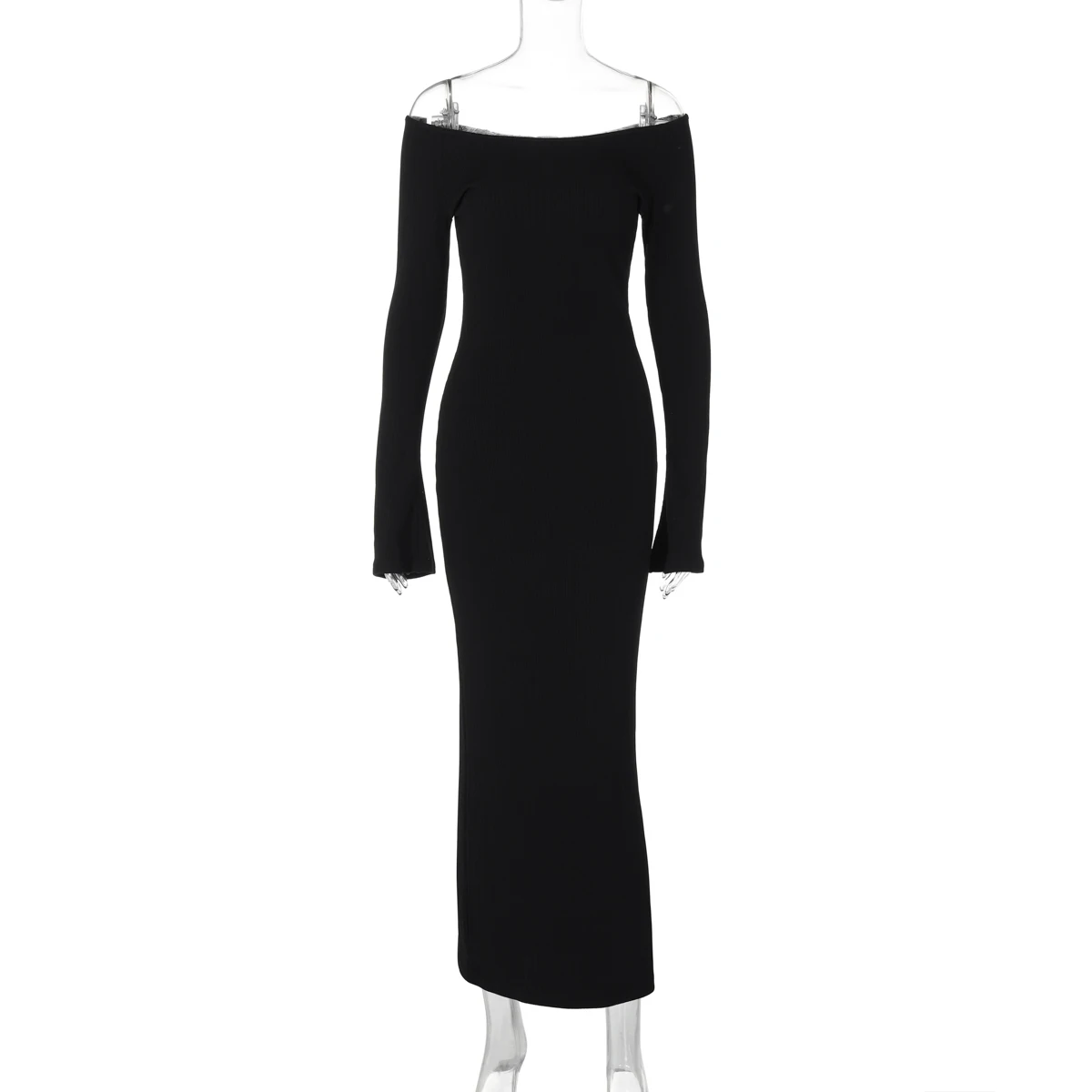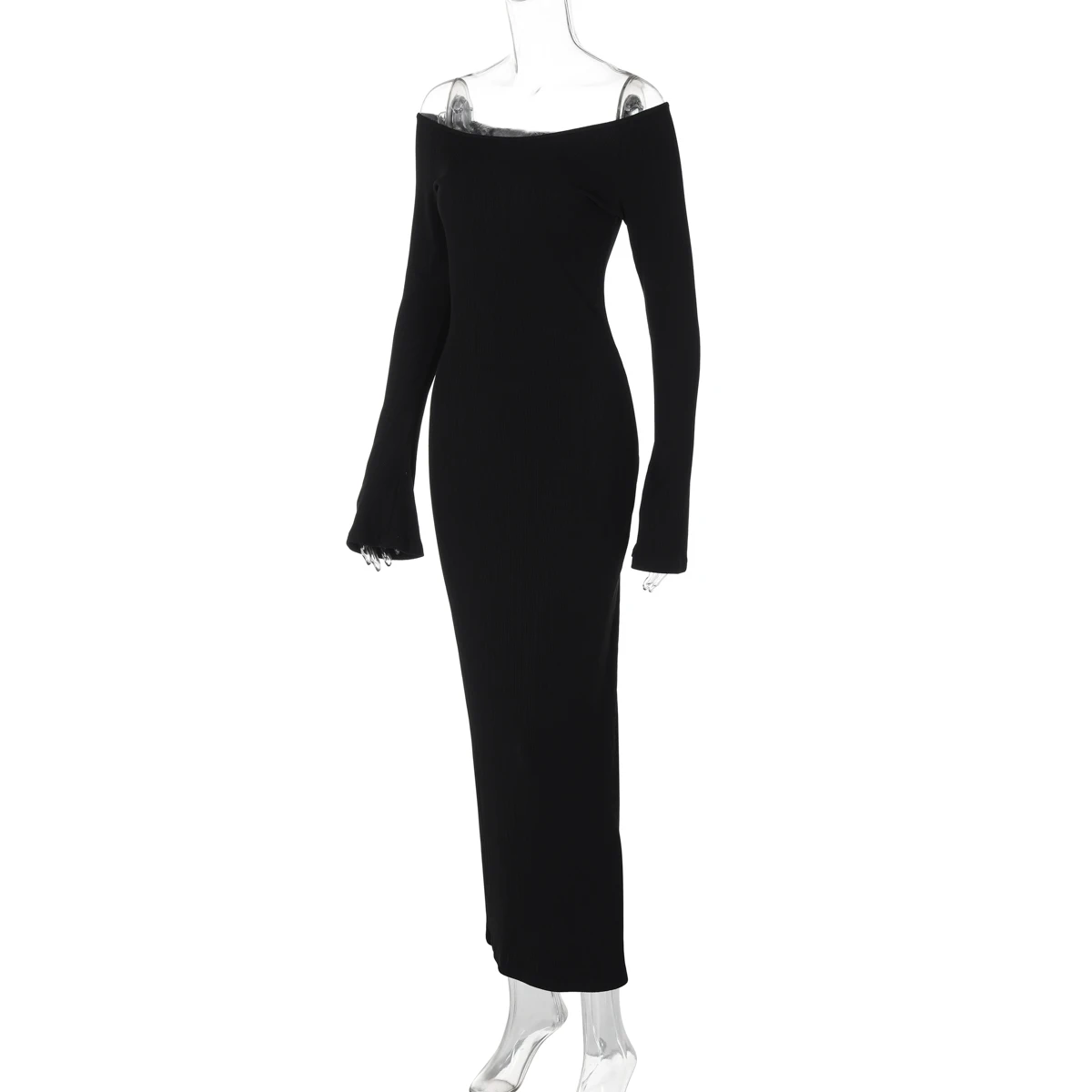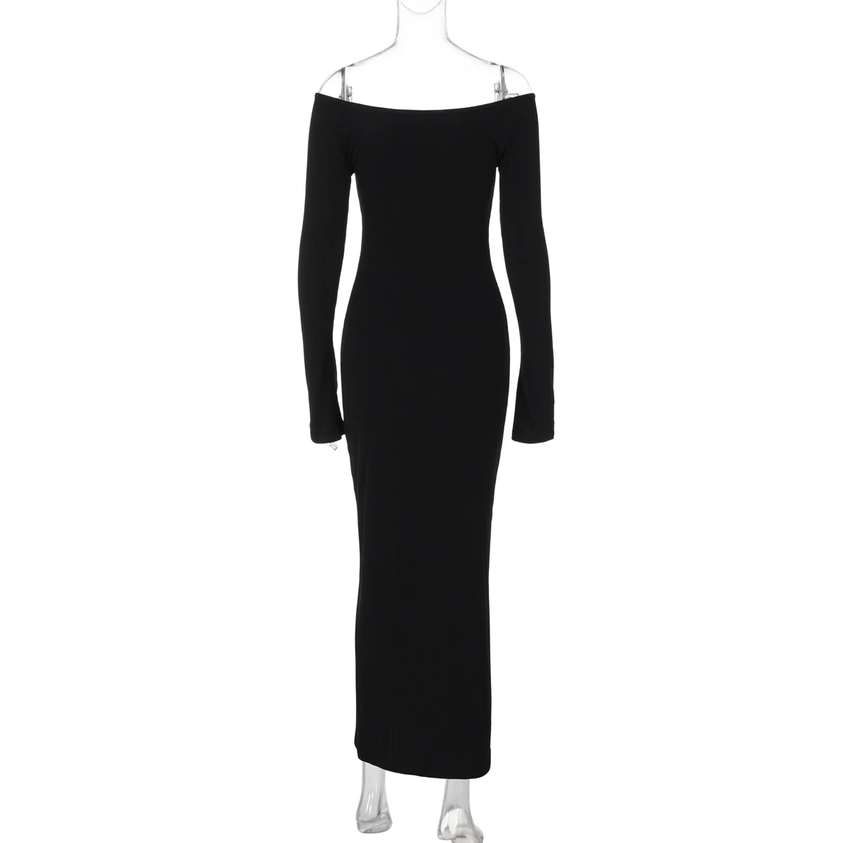 Elegant Slash Neck Long Sleeve Solid Sexy Bodycon Maxi Prom Dress Fall Women Y2K Clothes Birthday Party Festival