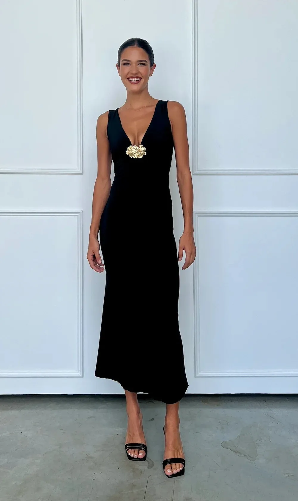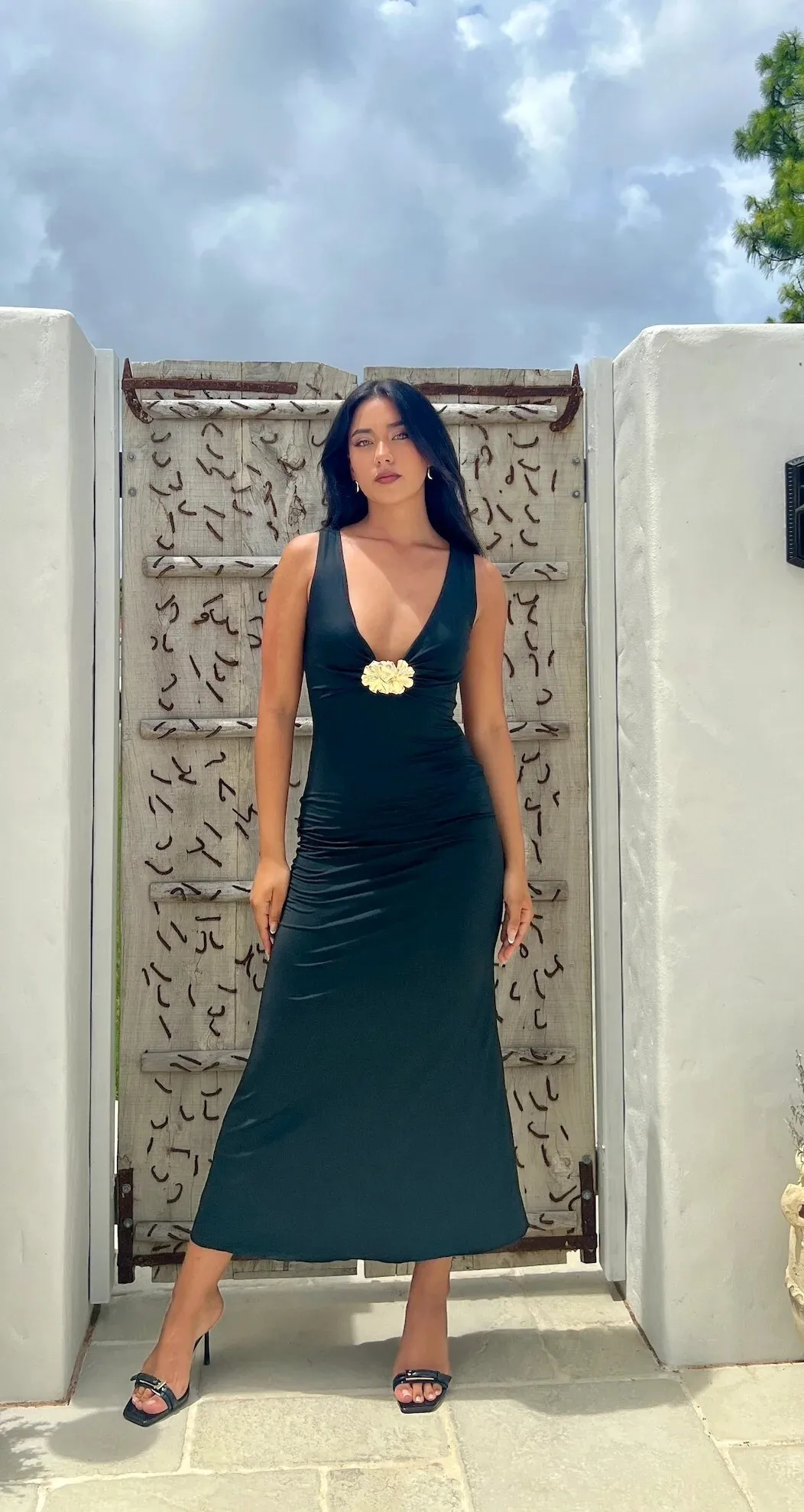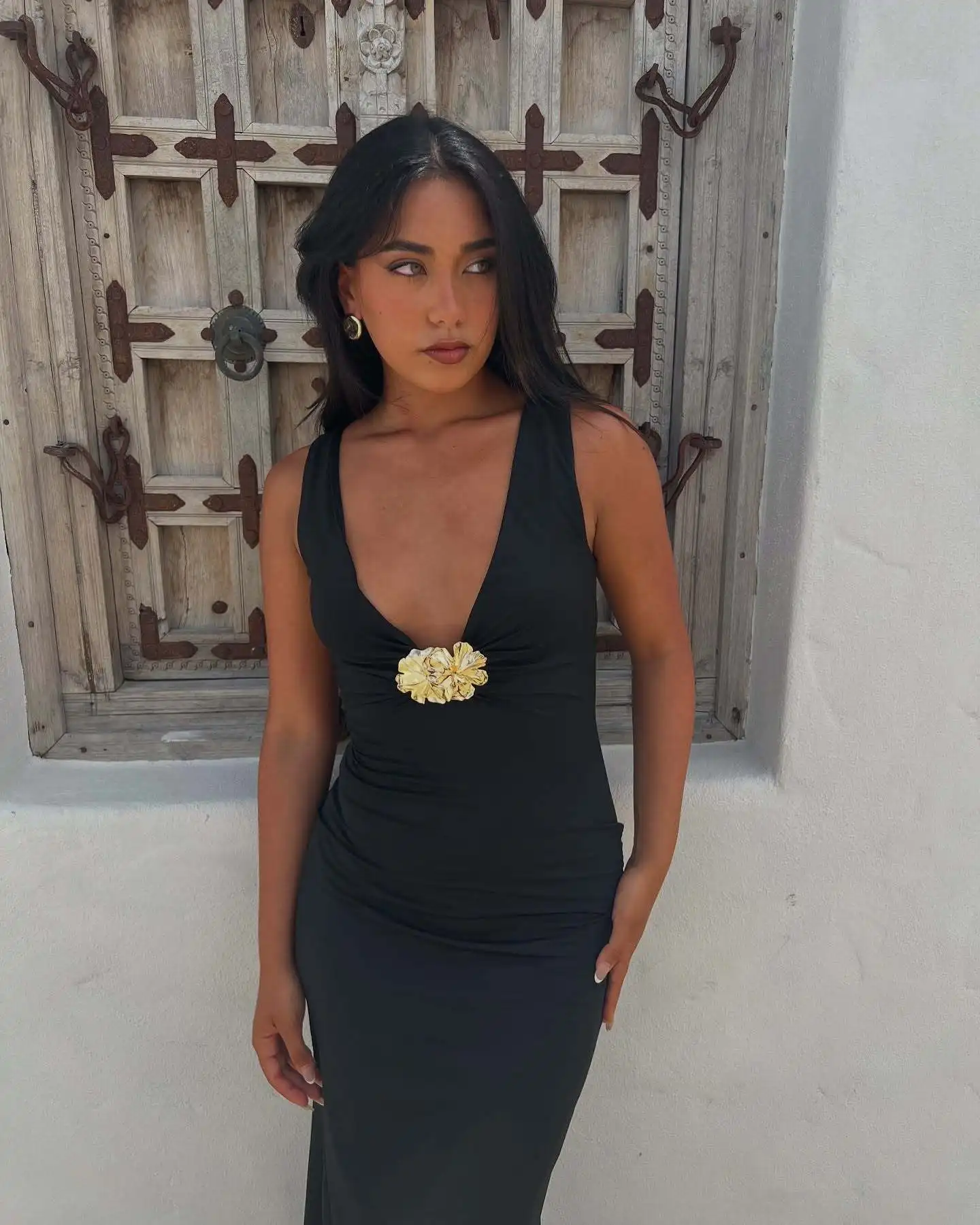 Elegant Sleeveless Metal Flower Bodycon Party Club Evening Dress Women Sexy Deep V Maxi Dress Female Slim Vestido 2025