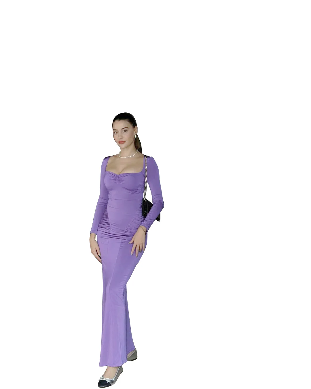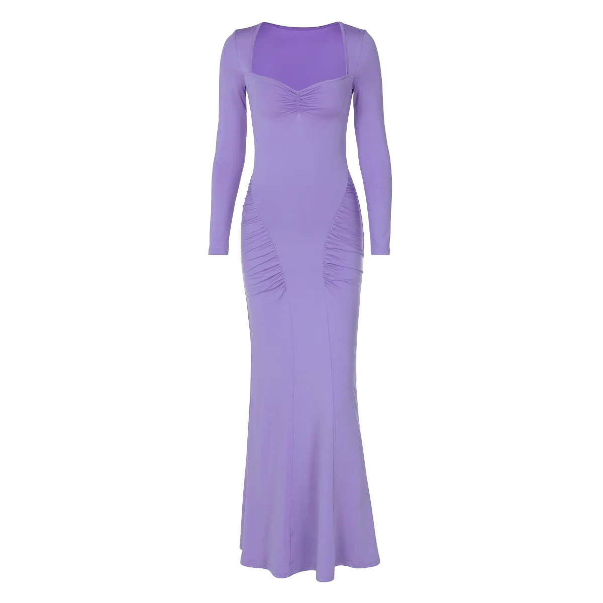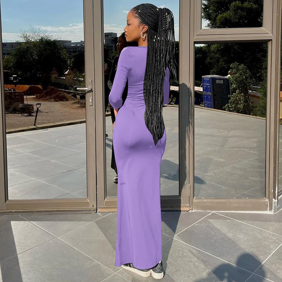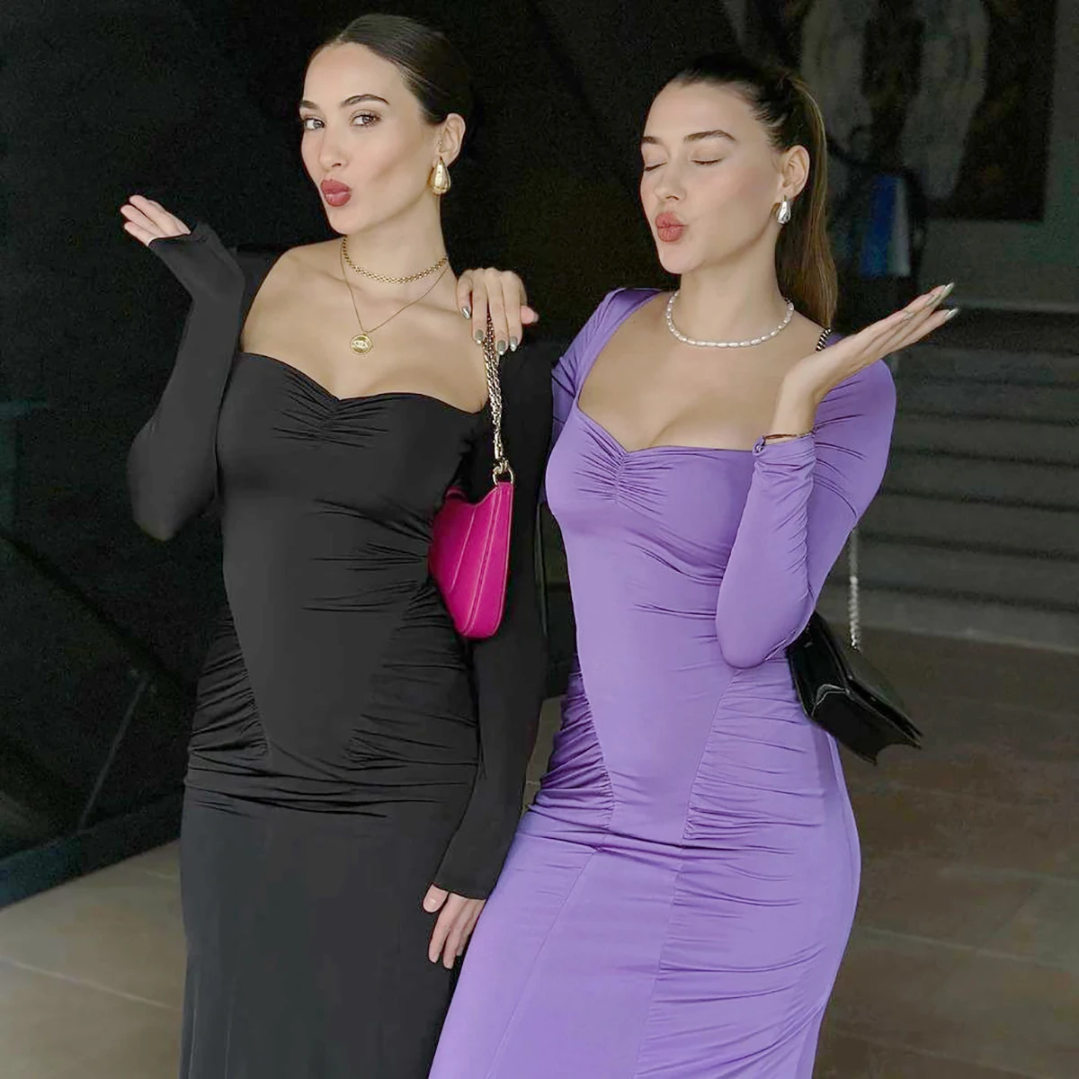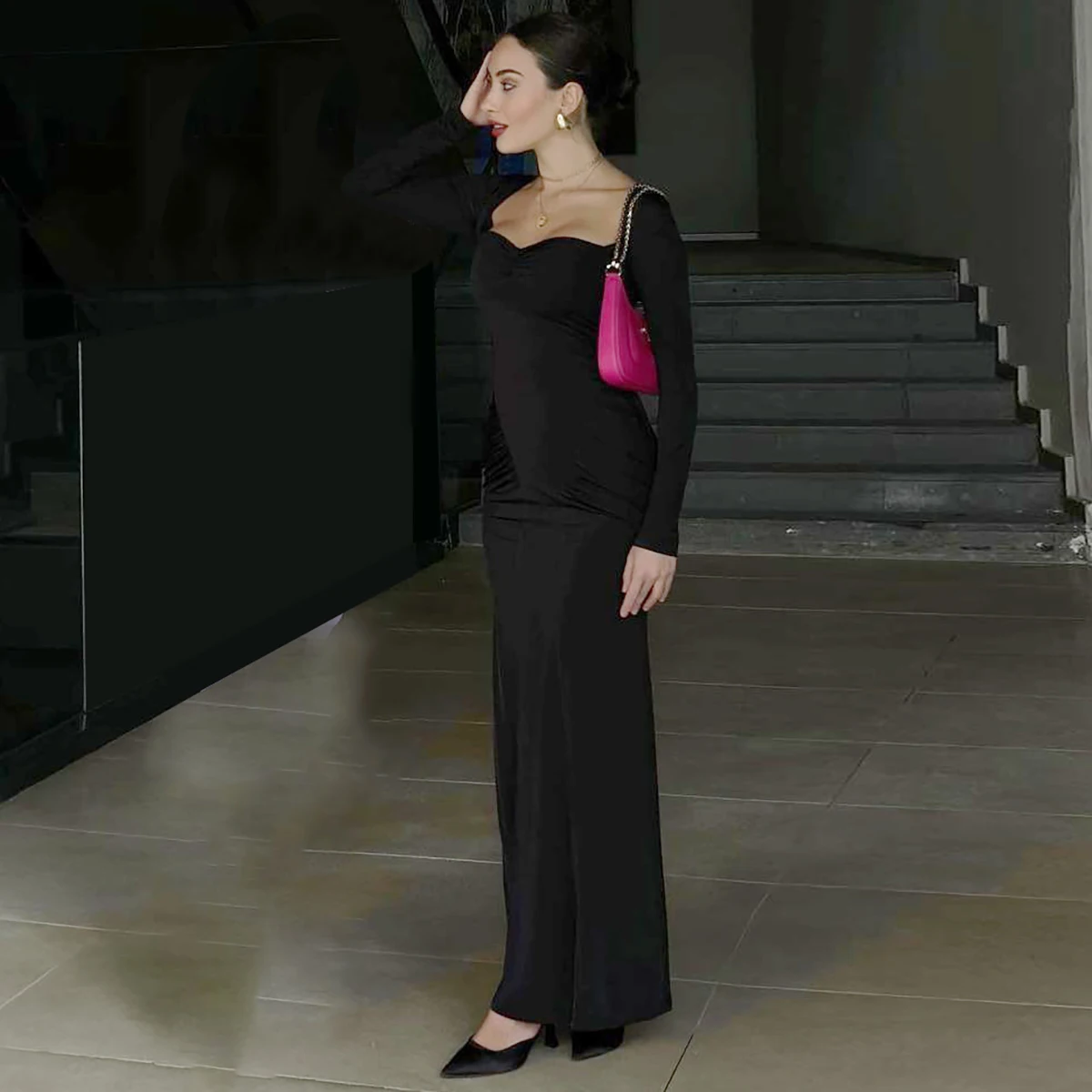 Elegant Solid Long Sleeve Square Collar Ruched Sexy Bodycon Maxi Prom Dress Fall Women Outfits Evening Party Vacation