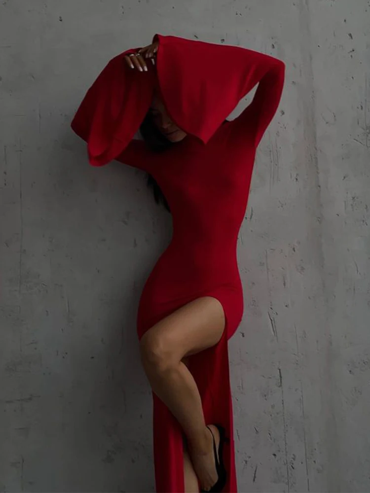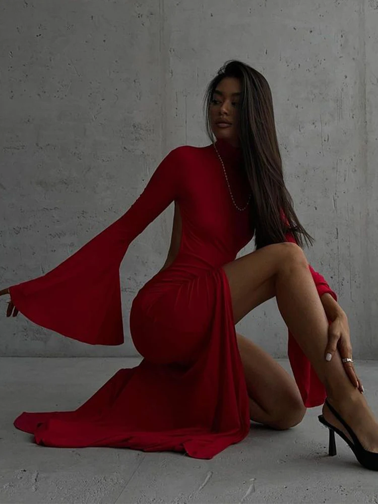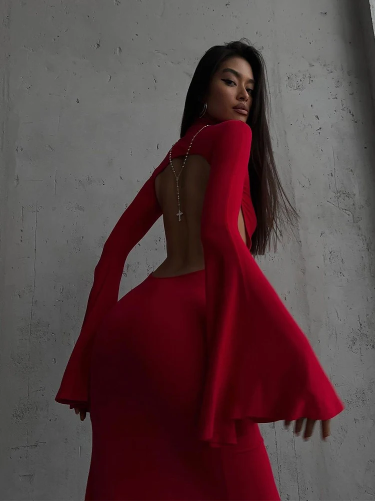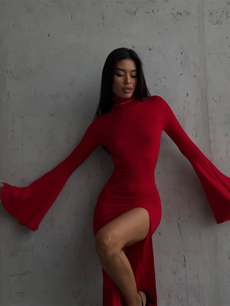 Elegant Solid O-neck Flare Sleeve Side Split Women's Dresses 2024 Spring Sexy Backless Bodycon Party Evening Vestidos