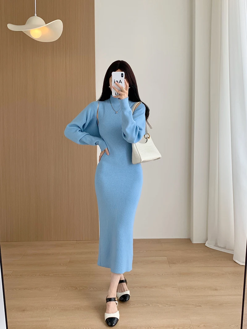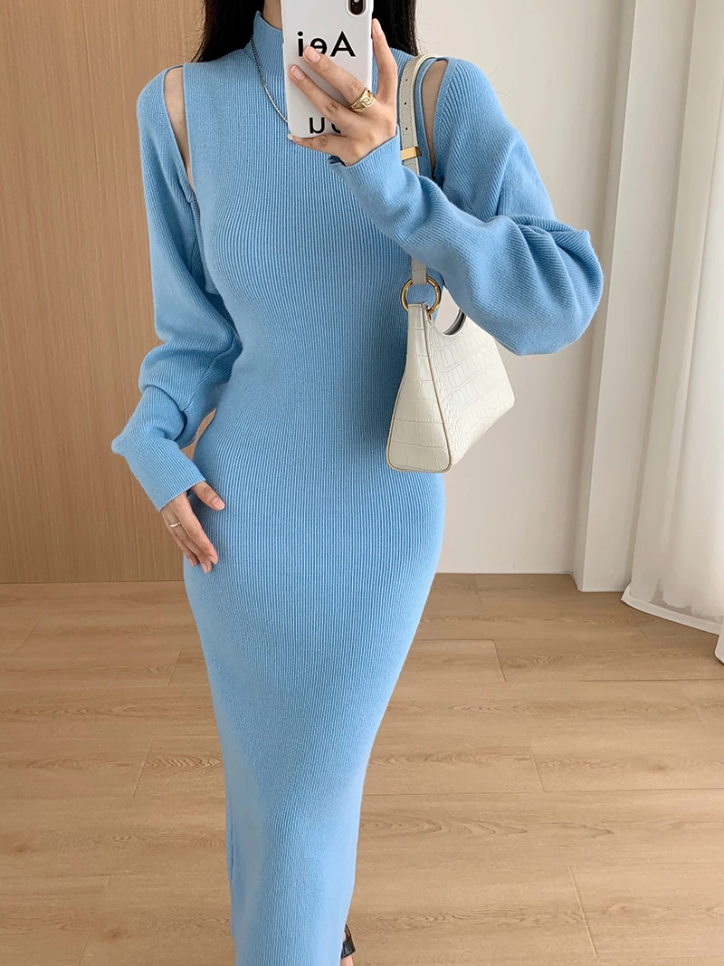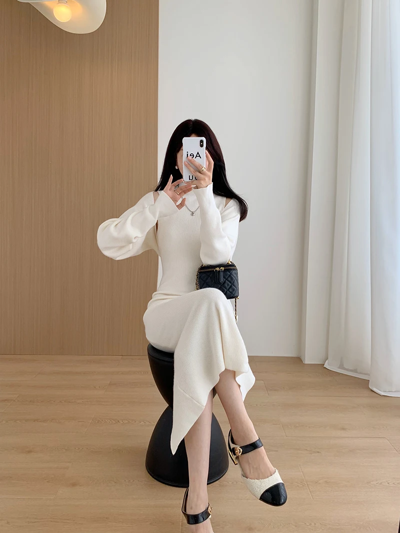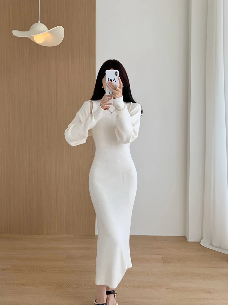 Elegant Solid Ribbed Knitted Dress Women Slim Long Sleeve Cardigan Top And Vest Dresses Autumn Winter Lady Streetwear Robe