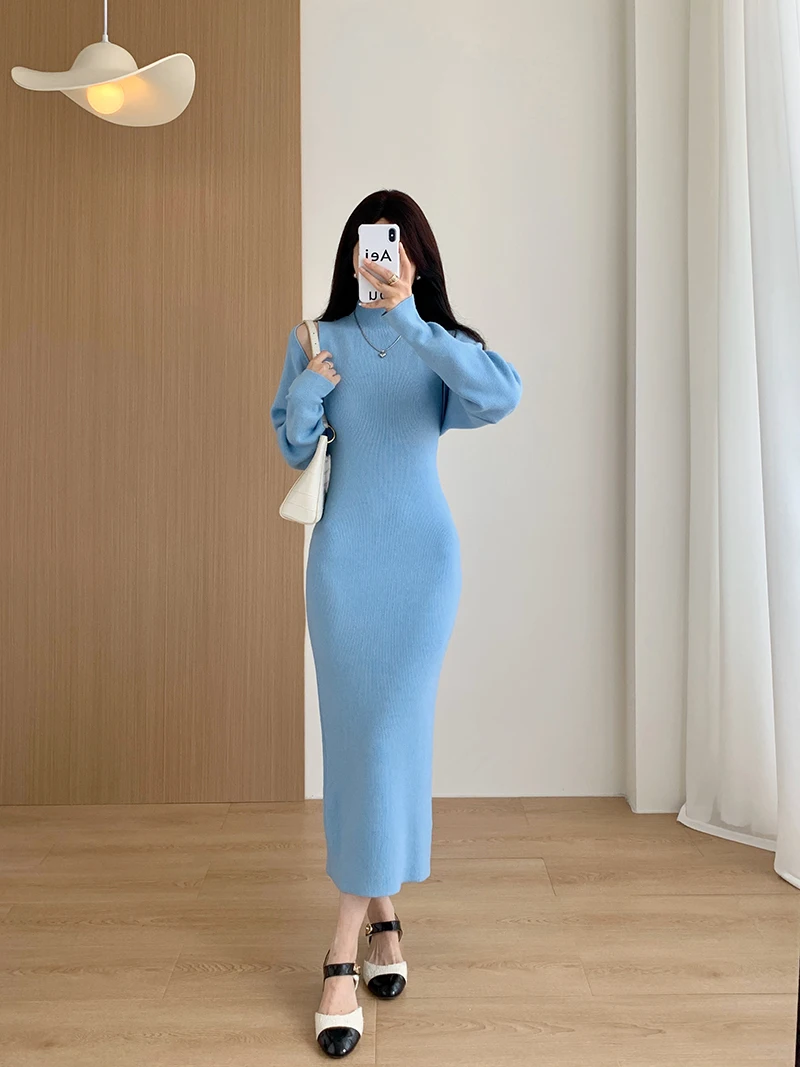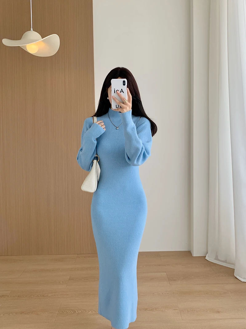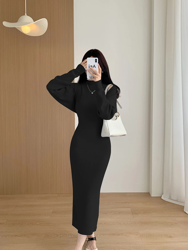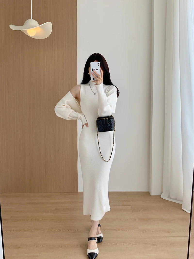 Elegant Solid Ribbed Knitted Dress Women Slim Long Sleeve Cardigan Top And Vest Dresses Autumn Winter Lady Streetwear Robe