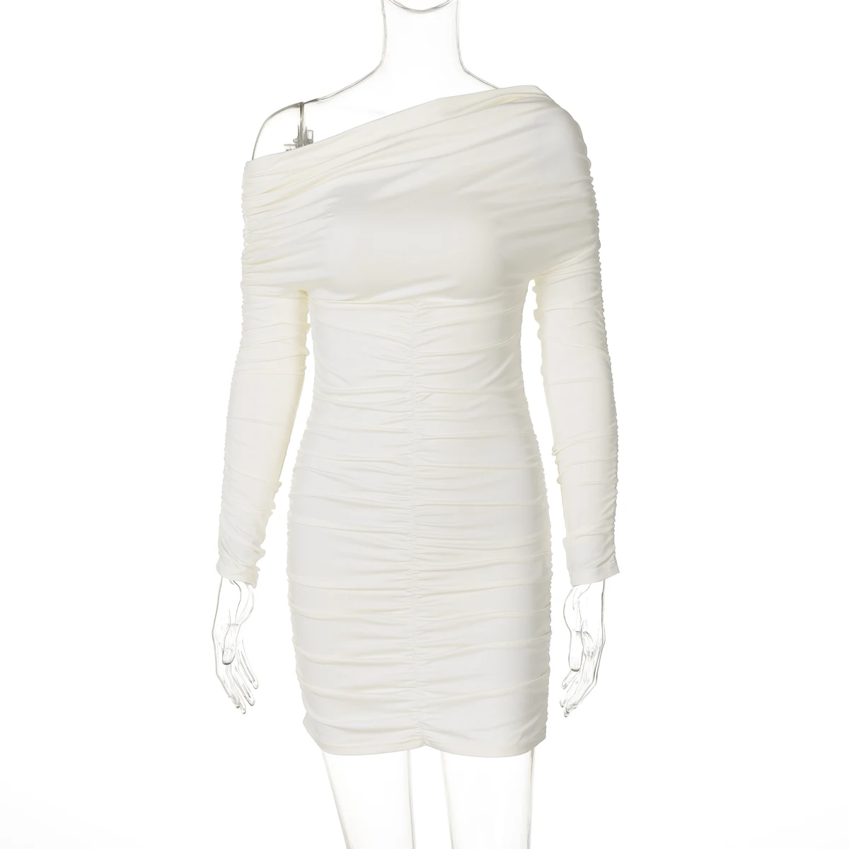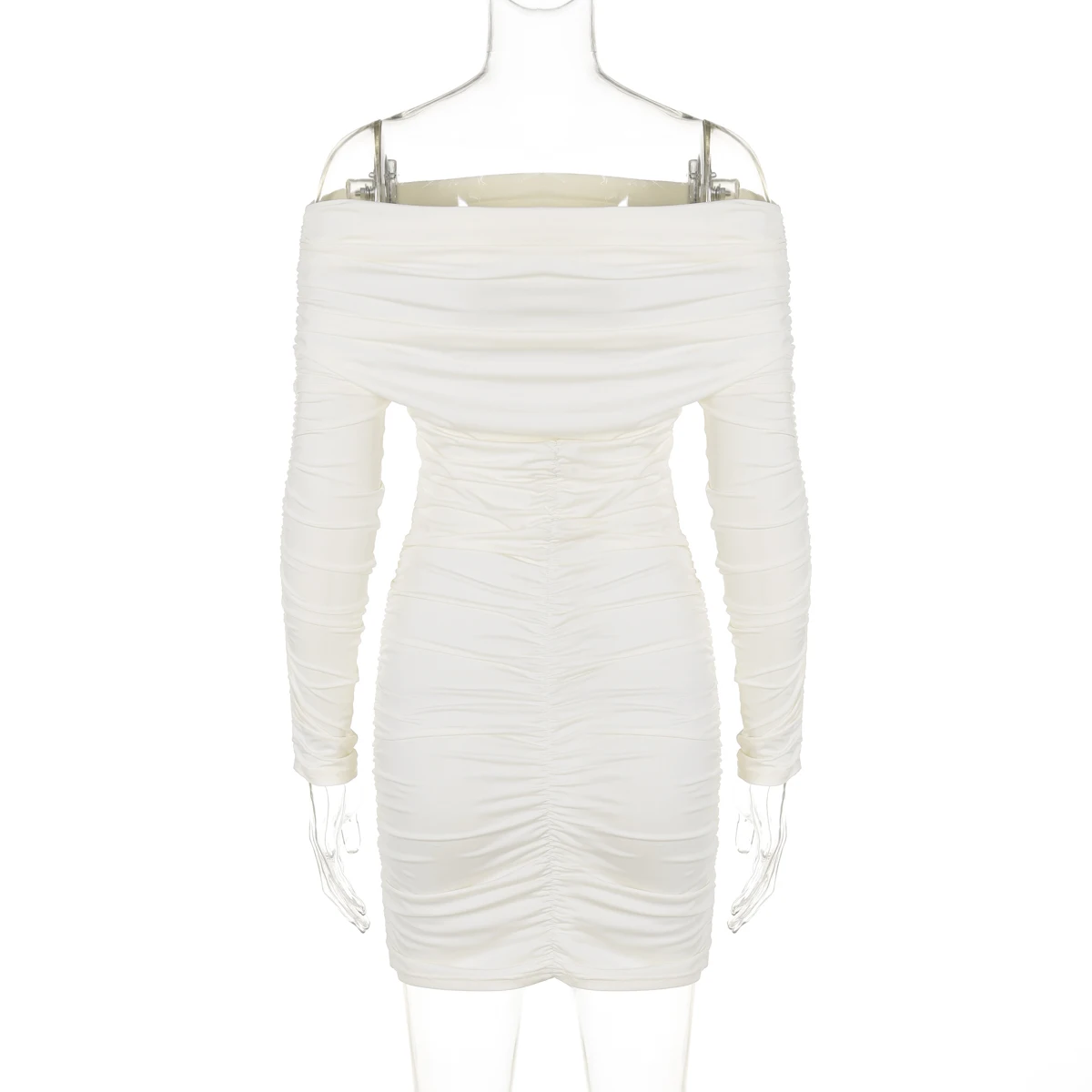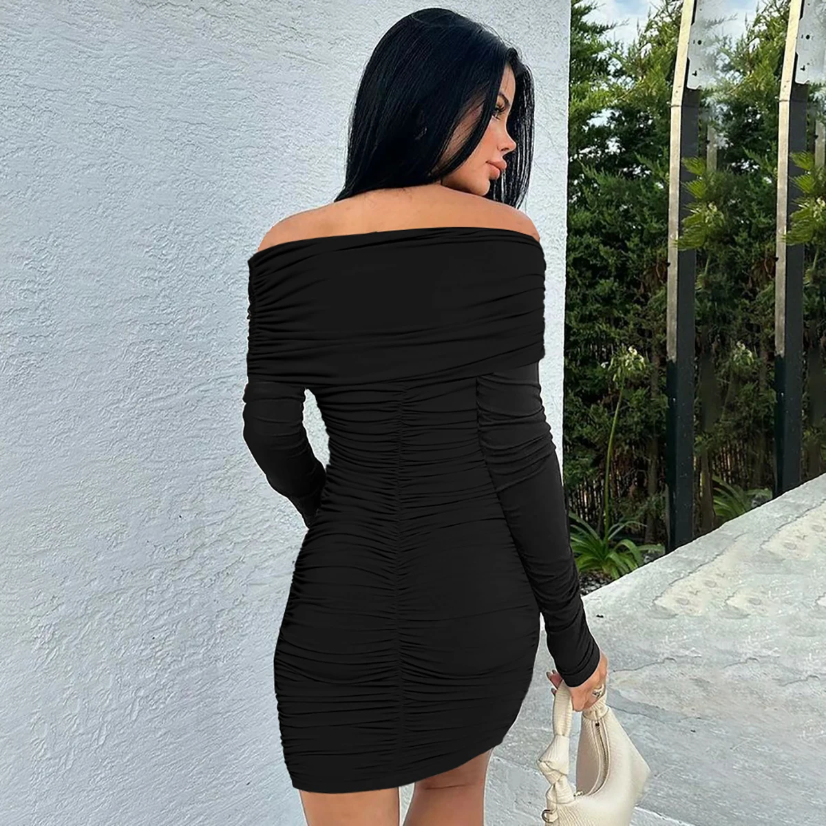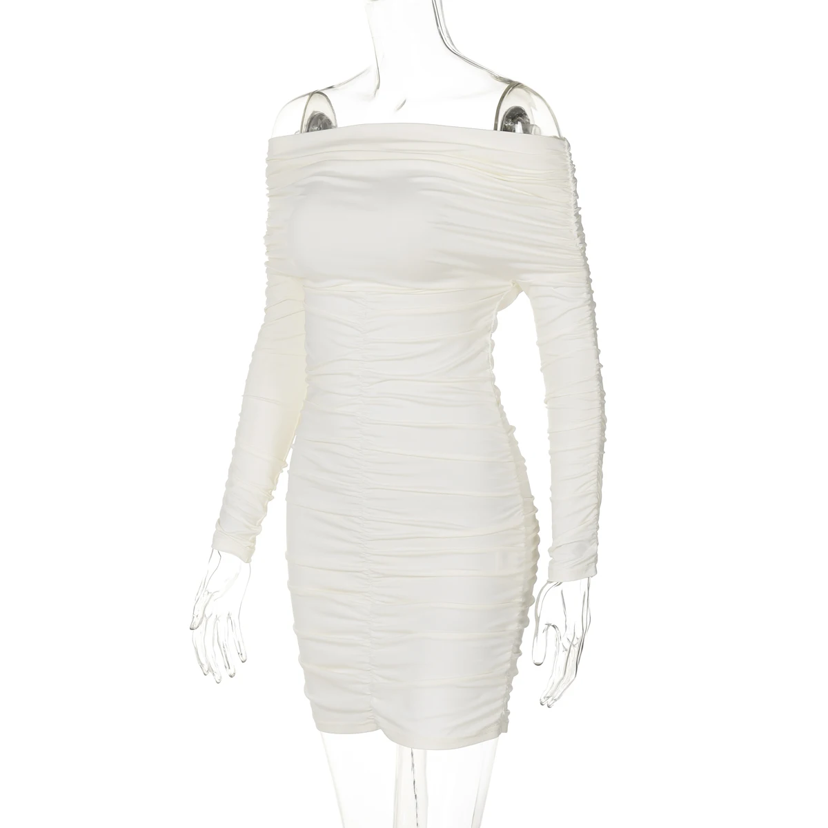 Elegant Solid Slash Neck Long Sleeve Sexy Bodycon Pleated Mini Dress Fall Winter Women Clothes Evening Party Festival