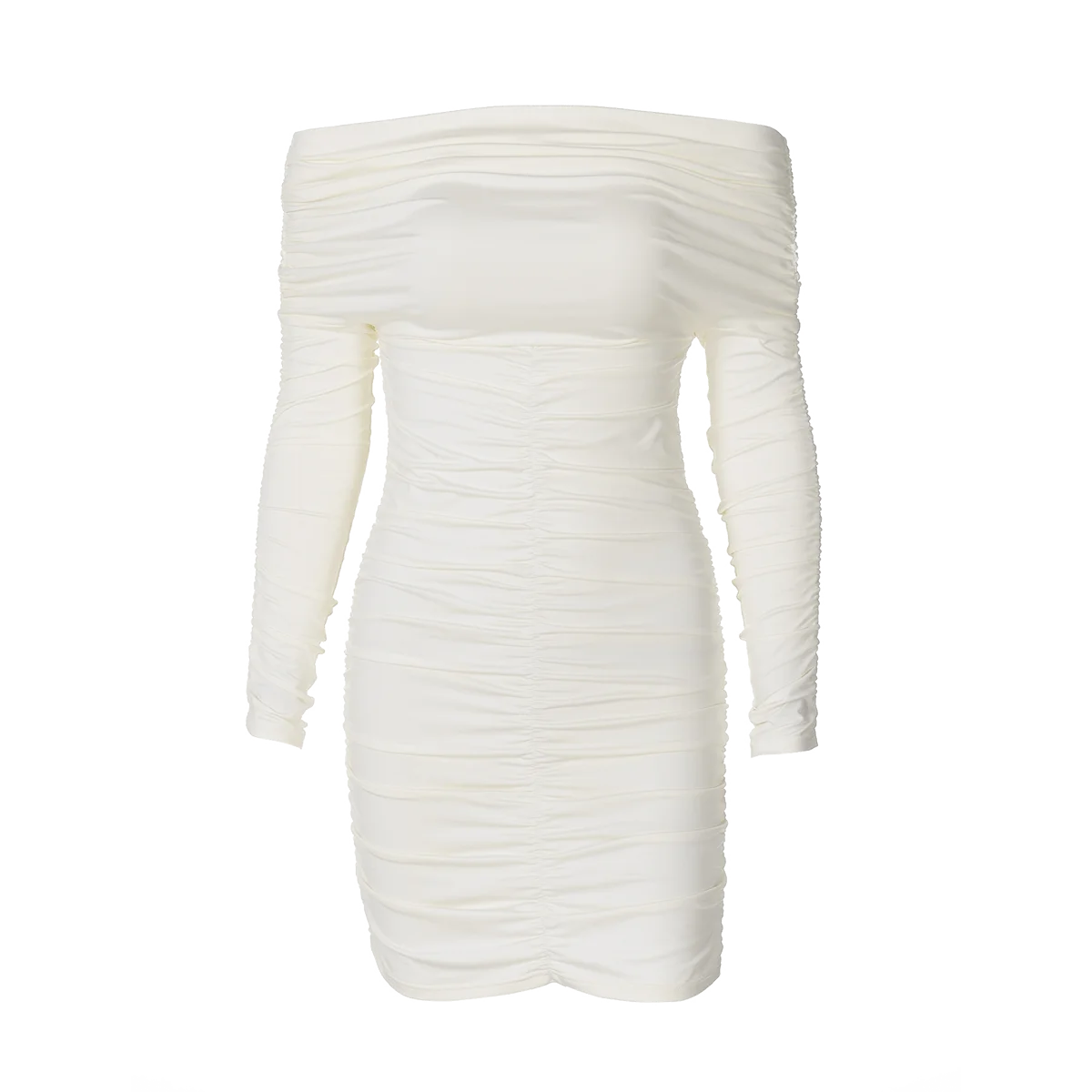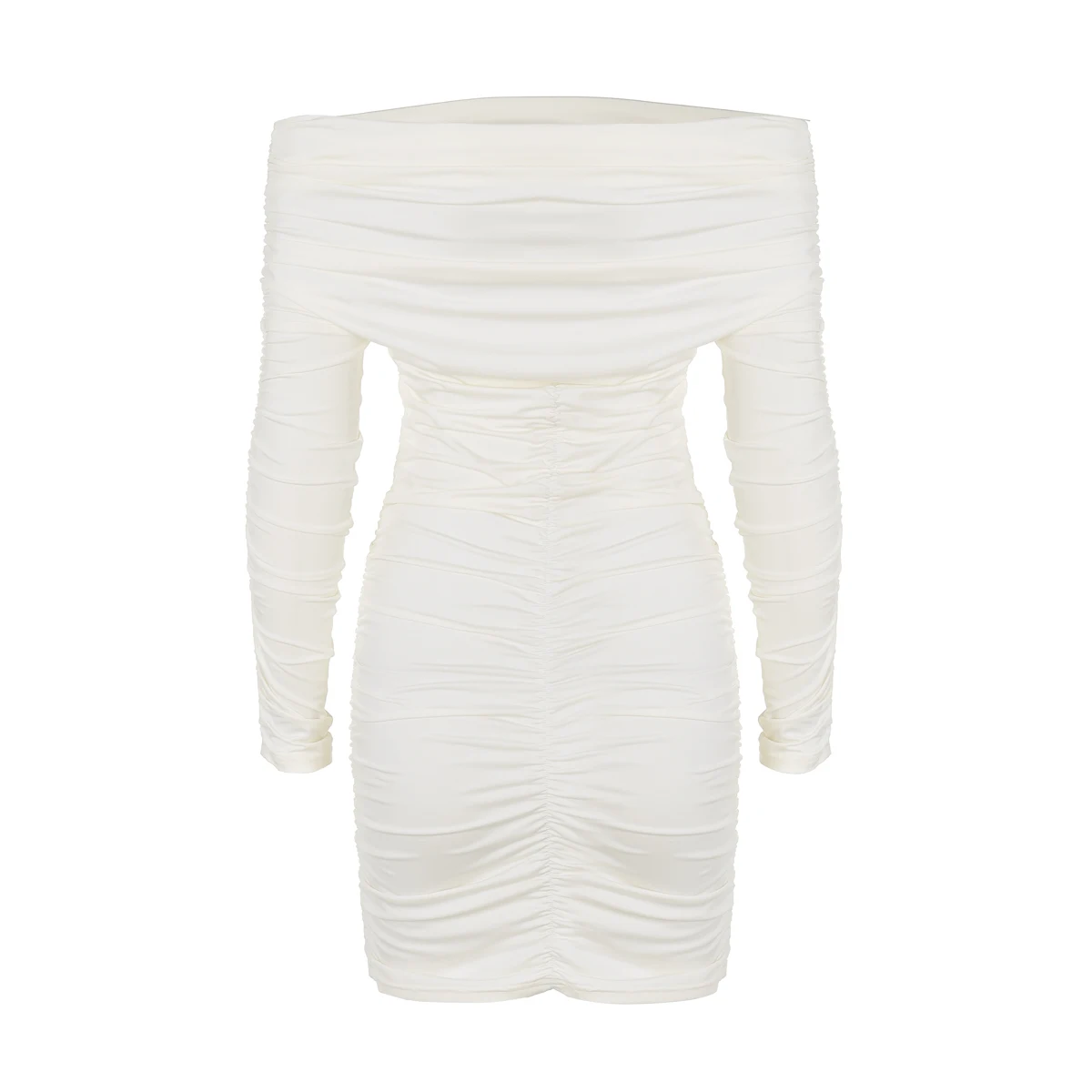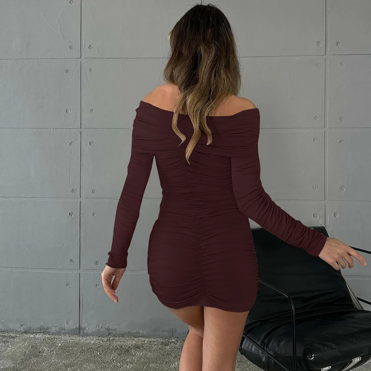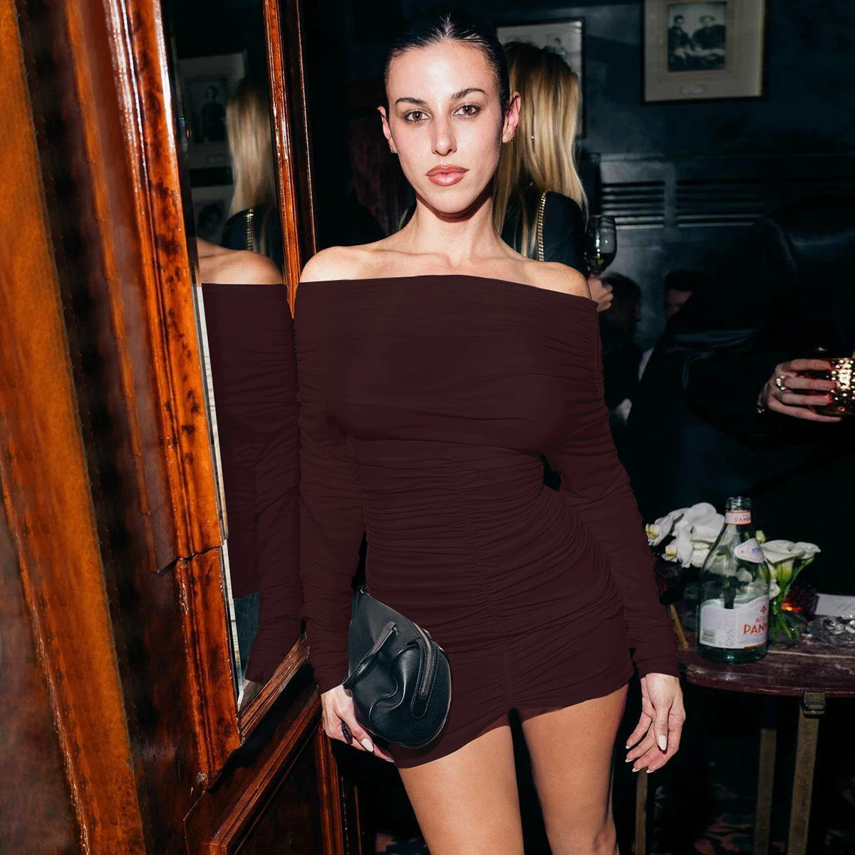 Elegant Solid Slash Neck Long Sleeve Sexy Bodycon Pleated Mini Dress Fall Winter Women Clothes Evening Party Festival