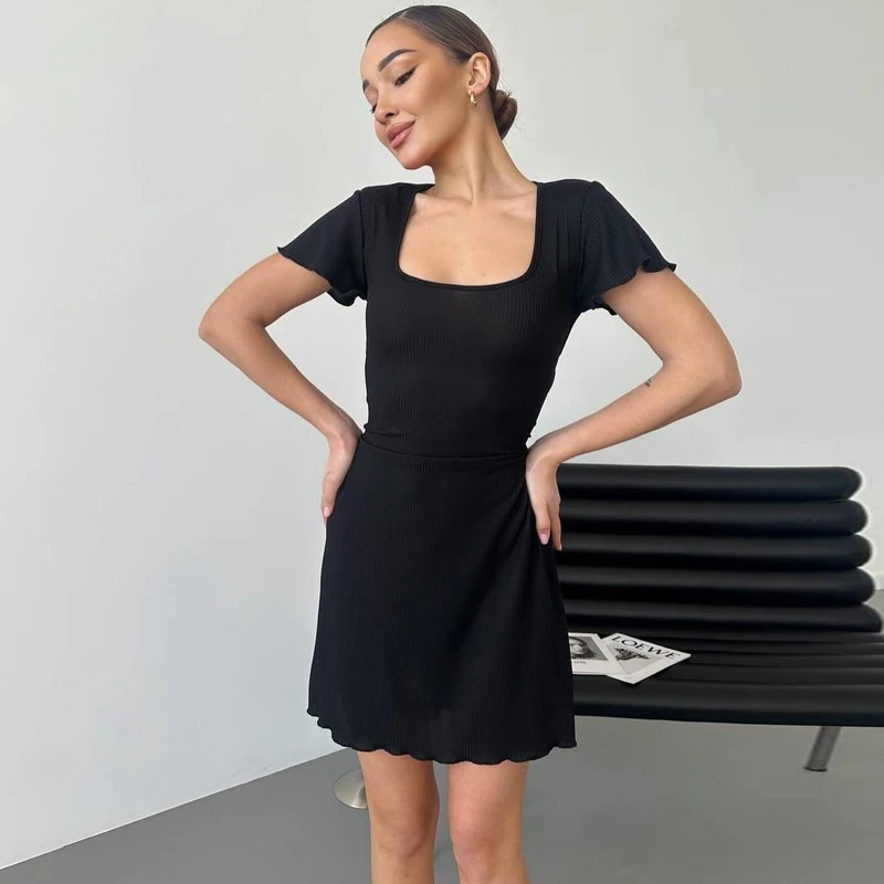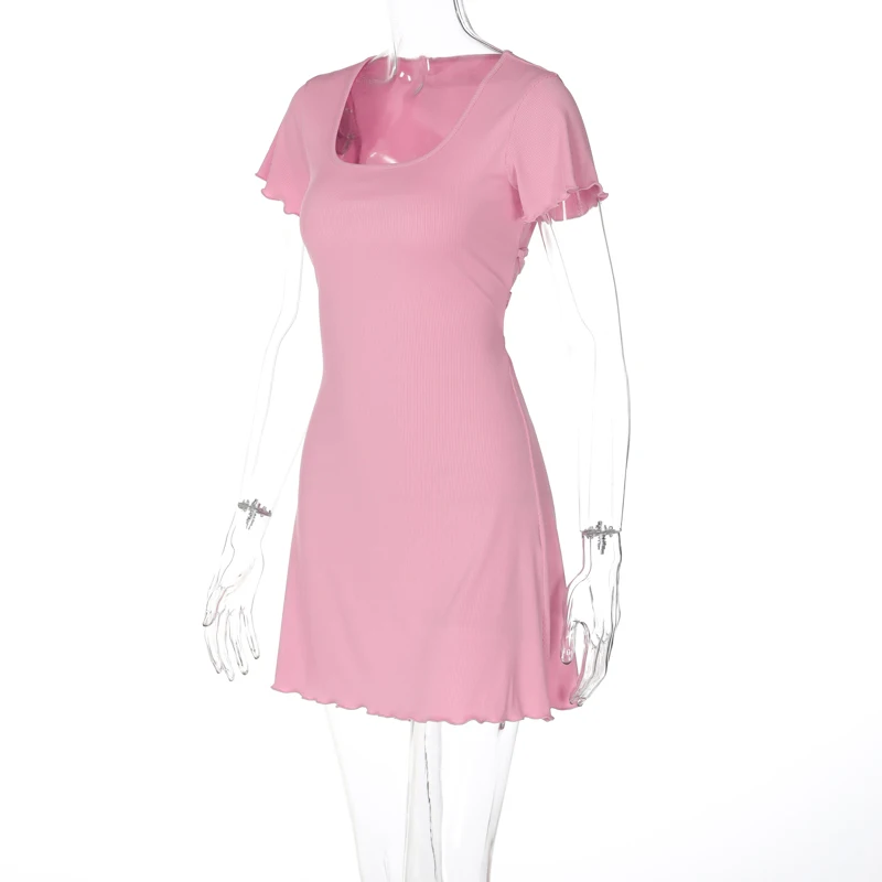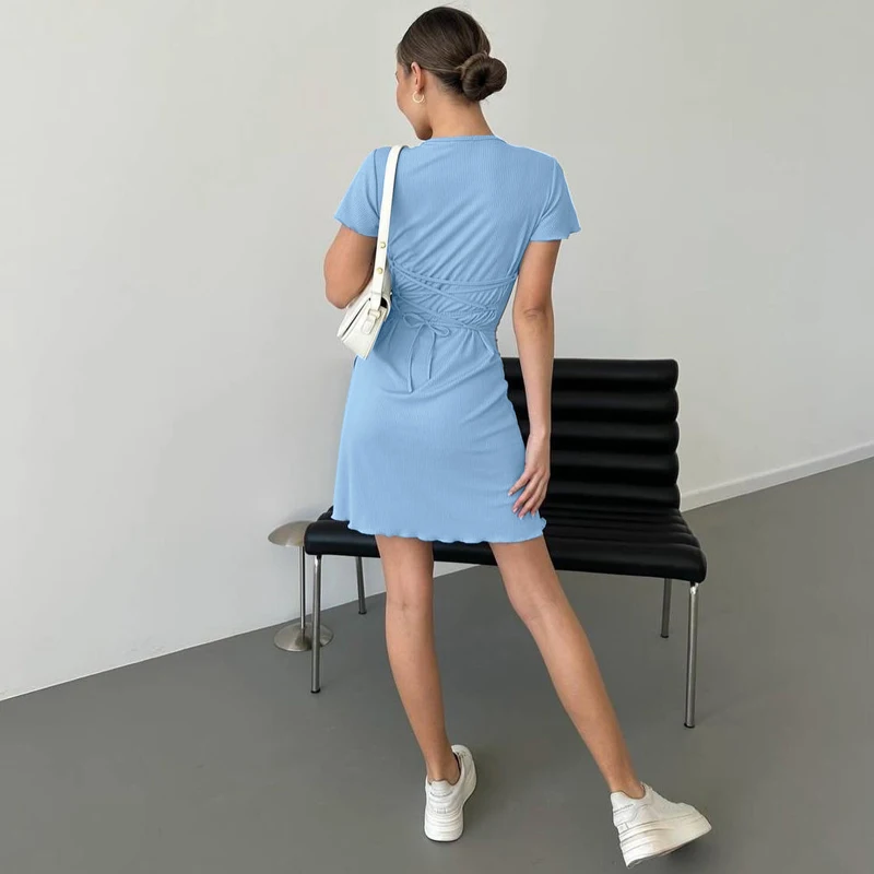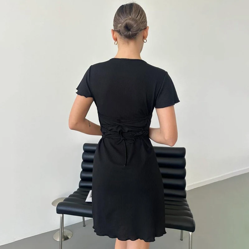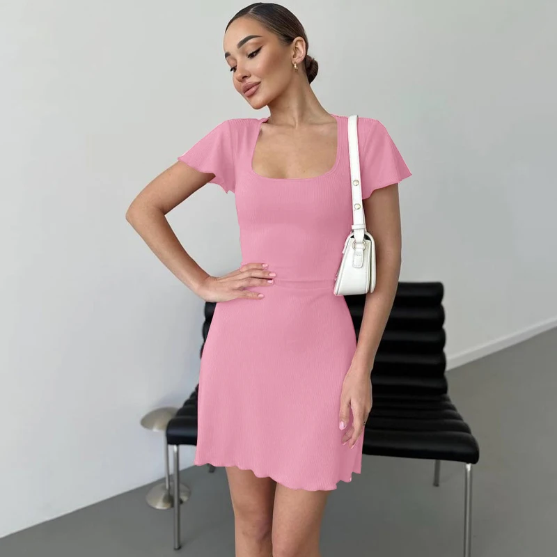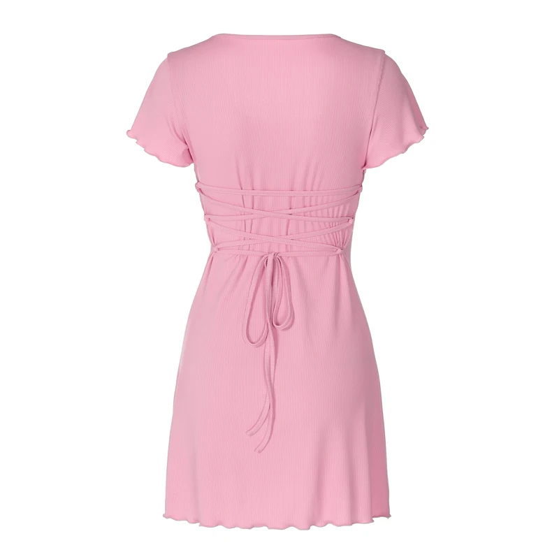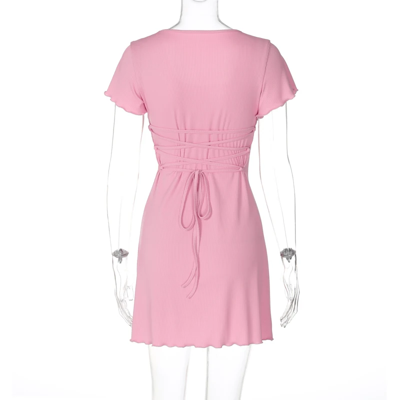 Elegant Solid Square Collar Short Sleeve Lace Up Ruffles Sexy Mini Dress Summer Women Outfit Birthday Party Festival