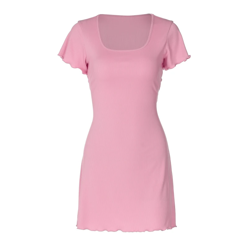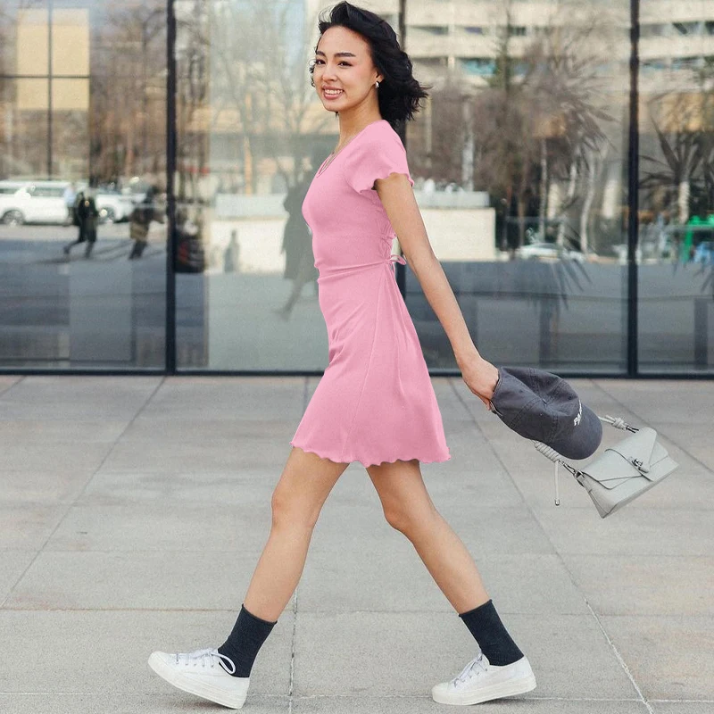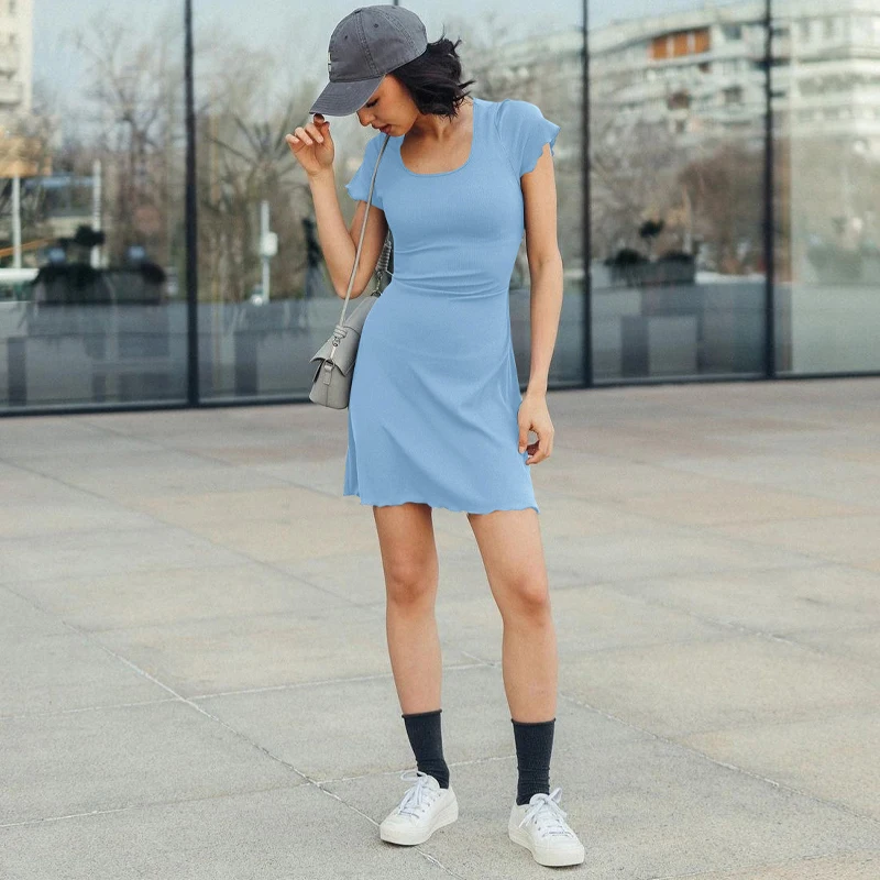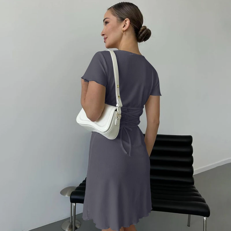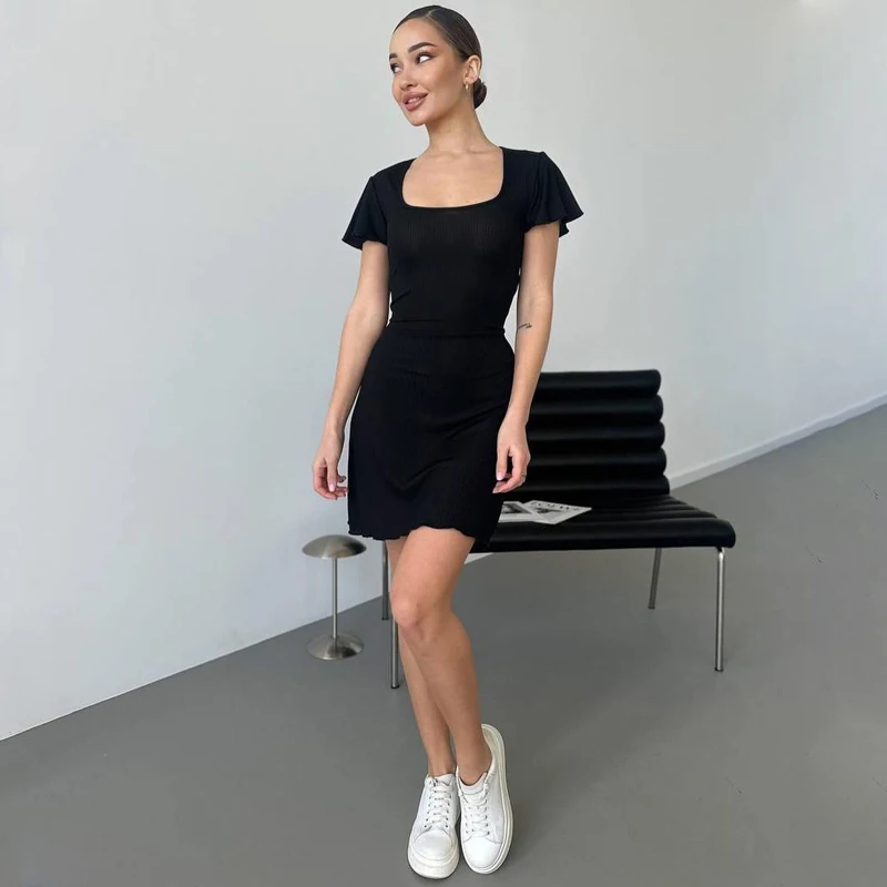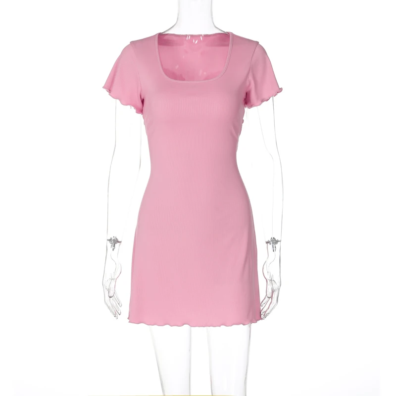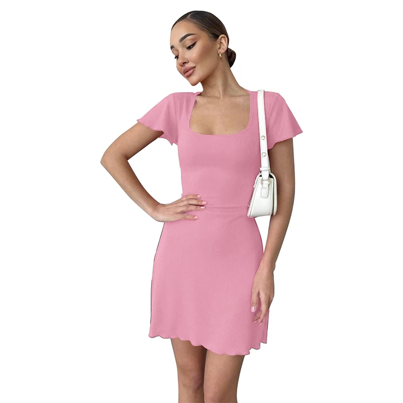 Elegant Solid Square Collar Short Sleeve Lace Up Ruffles Sexy Mini Dress Summer Women Outfit Birthday Party Festival